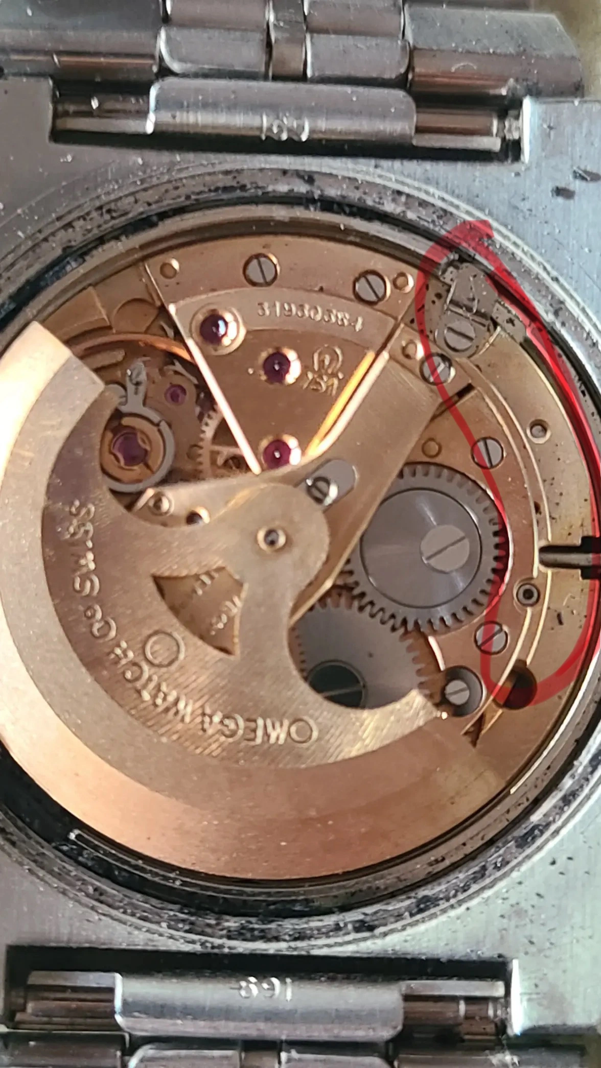And, as you’ve probably already discovered, the 31****** movement number makes the watch a 1960s watch, albeit 1969 so, with a disintegrated gasket that has ‘spilled’ into the movement, your 55 year old vintage watch is probably in need of a competent professional service.
