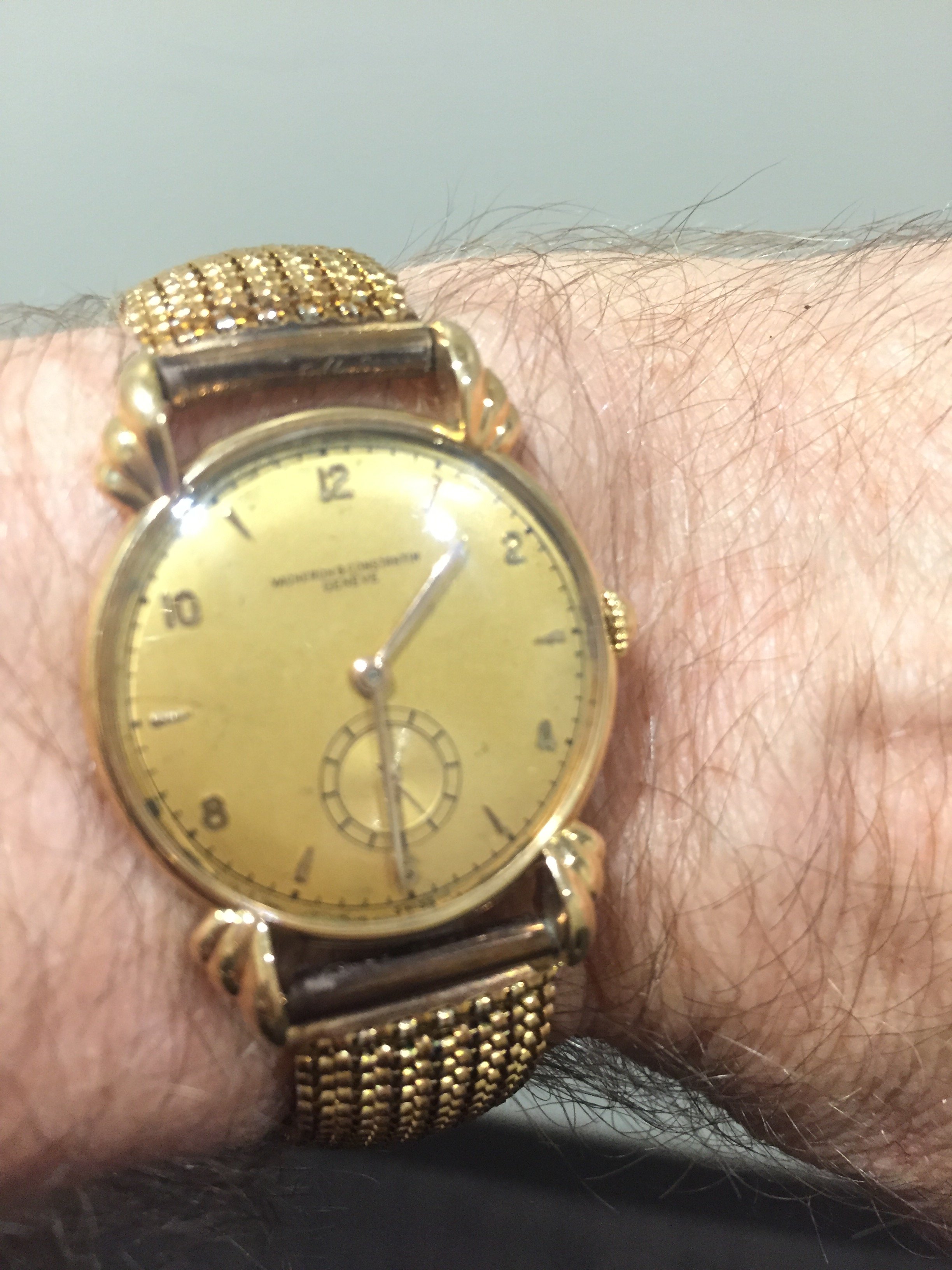It has a two-tone silver dial signed “Vacheron & Constantin Geneve” and “Swiss” with applied yellow gold button and Roman numeral indexes, a black painted chapter ring with black outer minute division indexes, yellow gold baton hands, and a subsidiary seconds dial with outer five second division indexes. The inner section of the dial is in excellent condition, while the outer section of the dial and the subsidiary seconds dial is in good condition showing more age as you advance towards the edges of the dial. Please refer to the photographs of the dial.