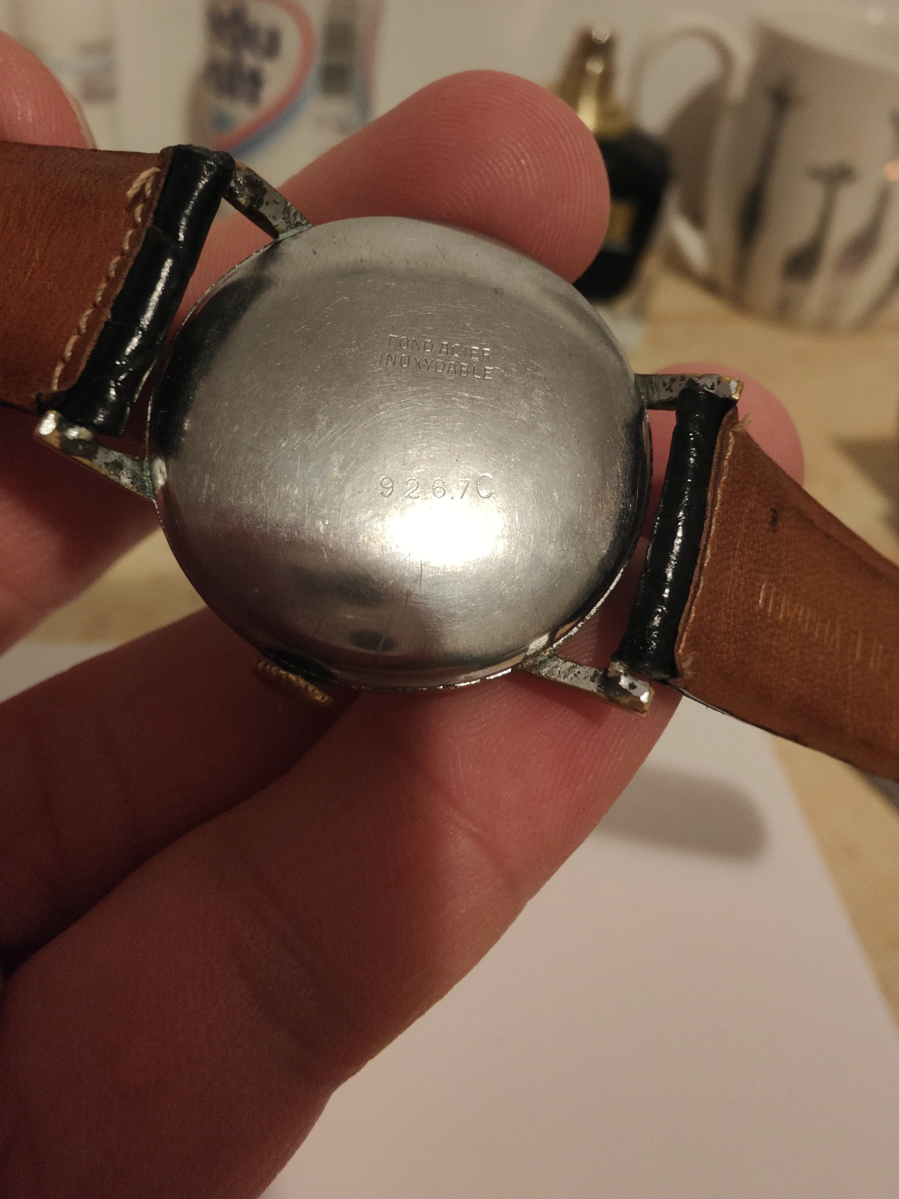 Movement: Manual wind, but there are no visible inscriptions or serial numbers on the movement.