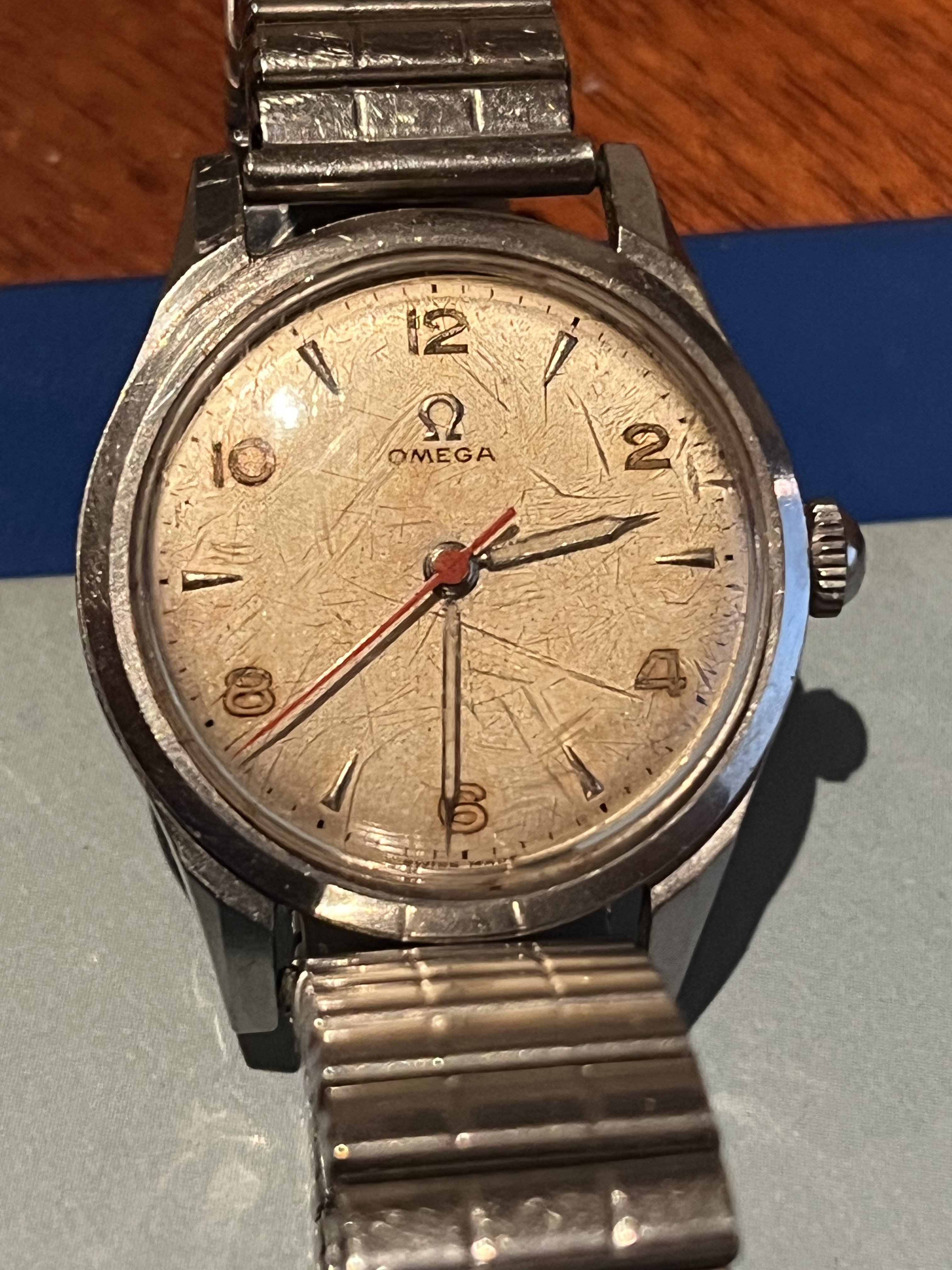 My wife just handed me her father's old Omega watch as per the photo attached. It has no box, papers and no ref number on the case I can see. I own a Seamaster myself but can not identify this model. Case size is probably 36mm and it does actually still work when wound.
