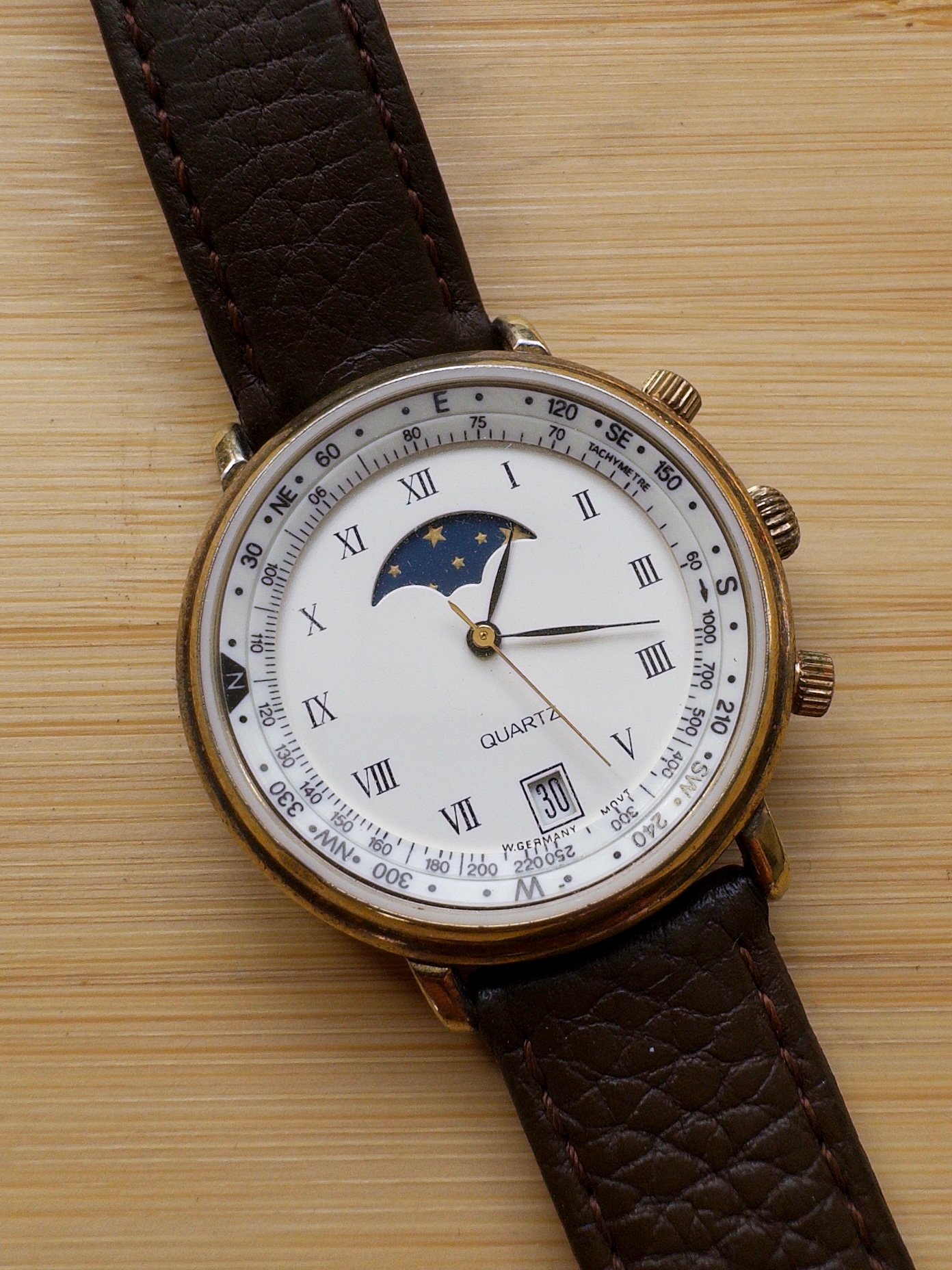 The combination of a moon phase complication and a compass ring in a quartz watch from this era (1980s or earlier) seems to be unusual based on what I've been able to find on my own.