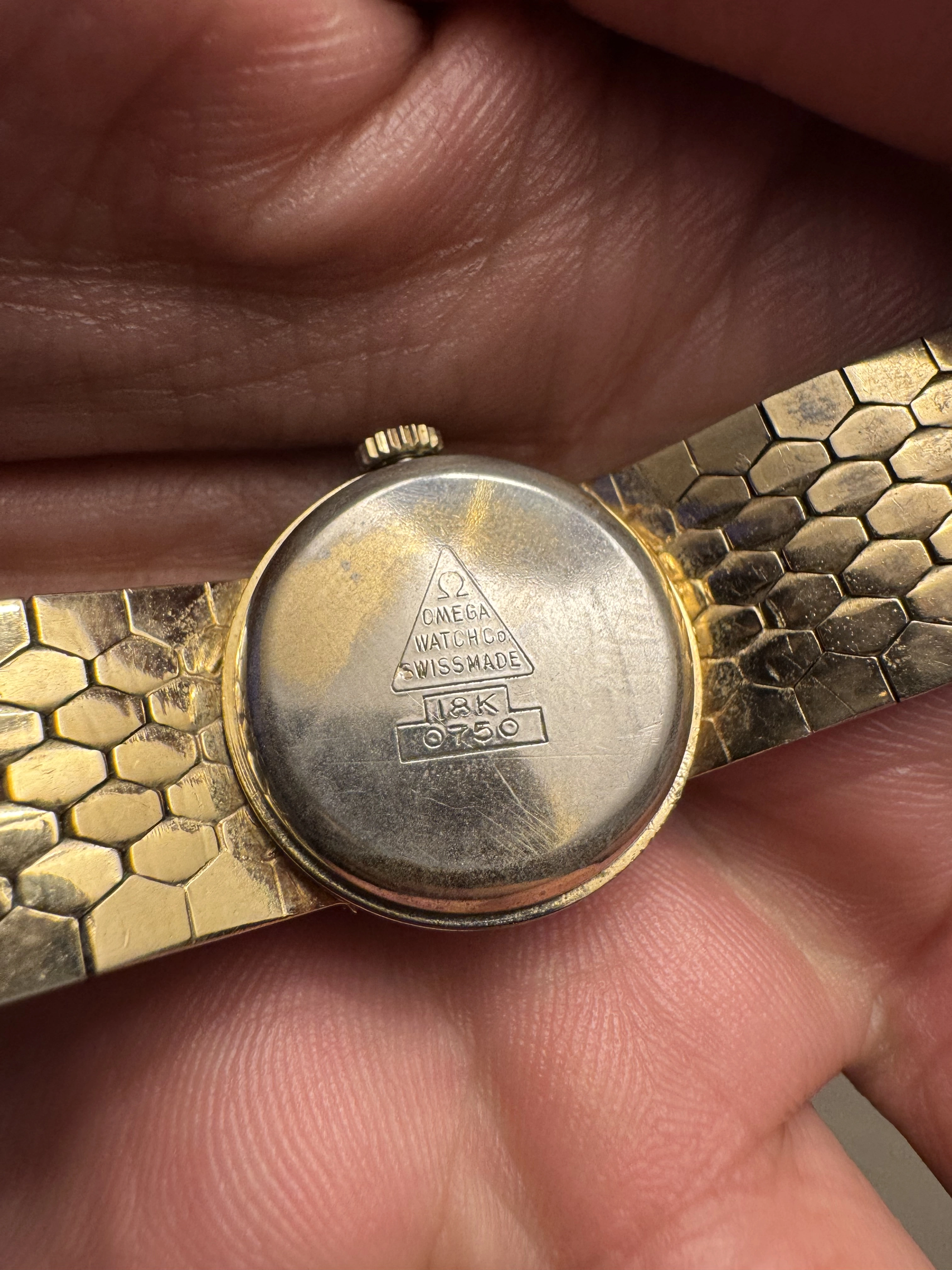 • The case back is marked “Ω OMEGA WATCH CO. SWISS MADE” with a triangle hallmark and stamped “18K 0.750”