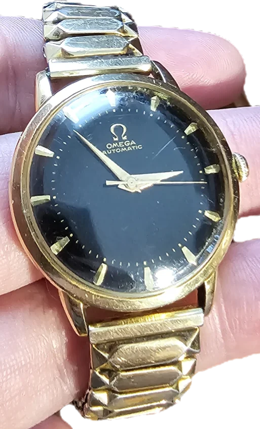 I'm not sure whether this will help in identifying it, but I also found one that sold on the vintagemasters that looks extremely similar (with only minor differences). That watch was entitled "Vintage Omega Automatic with black dial 14k gold filled G6213 from 1953." I will include a link to it at the end of this post. There are only 4 minor differences between this watch and mine: (1) the hour markers do not go past the min/sec markers in mine, unlike with this one where they do; (2) the 12 hour marker for mine only has 1 line, unlike this one which has 2; (3) there is no gold ring connecting all the min/sec markers in mine, unlike this one which does; and (4) the min/sec markers are not all uniform size like this one has. Instead, all of them are uniform except when they coincide with hour markers (where they are then slightly larger)