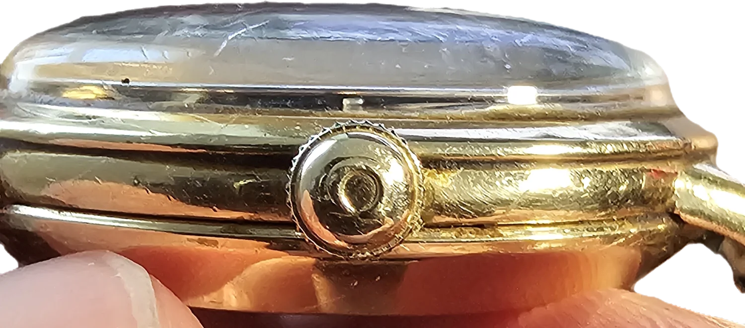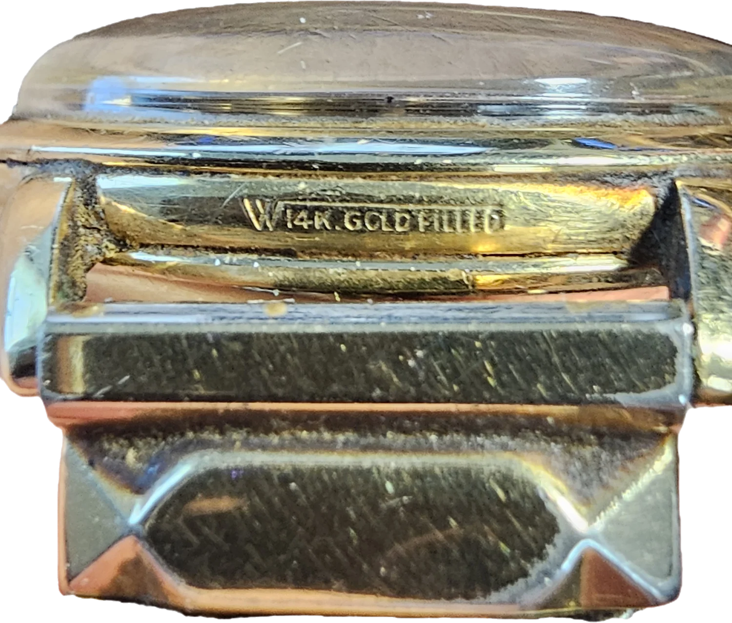 The case has only one marking on its side (below the 6 marker) that says: "14K GOLD FILLED". This text is also written inside a symbol that looks like a square root symbol with a "W" on the end.