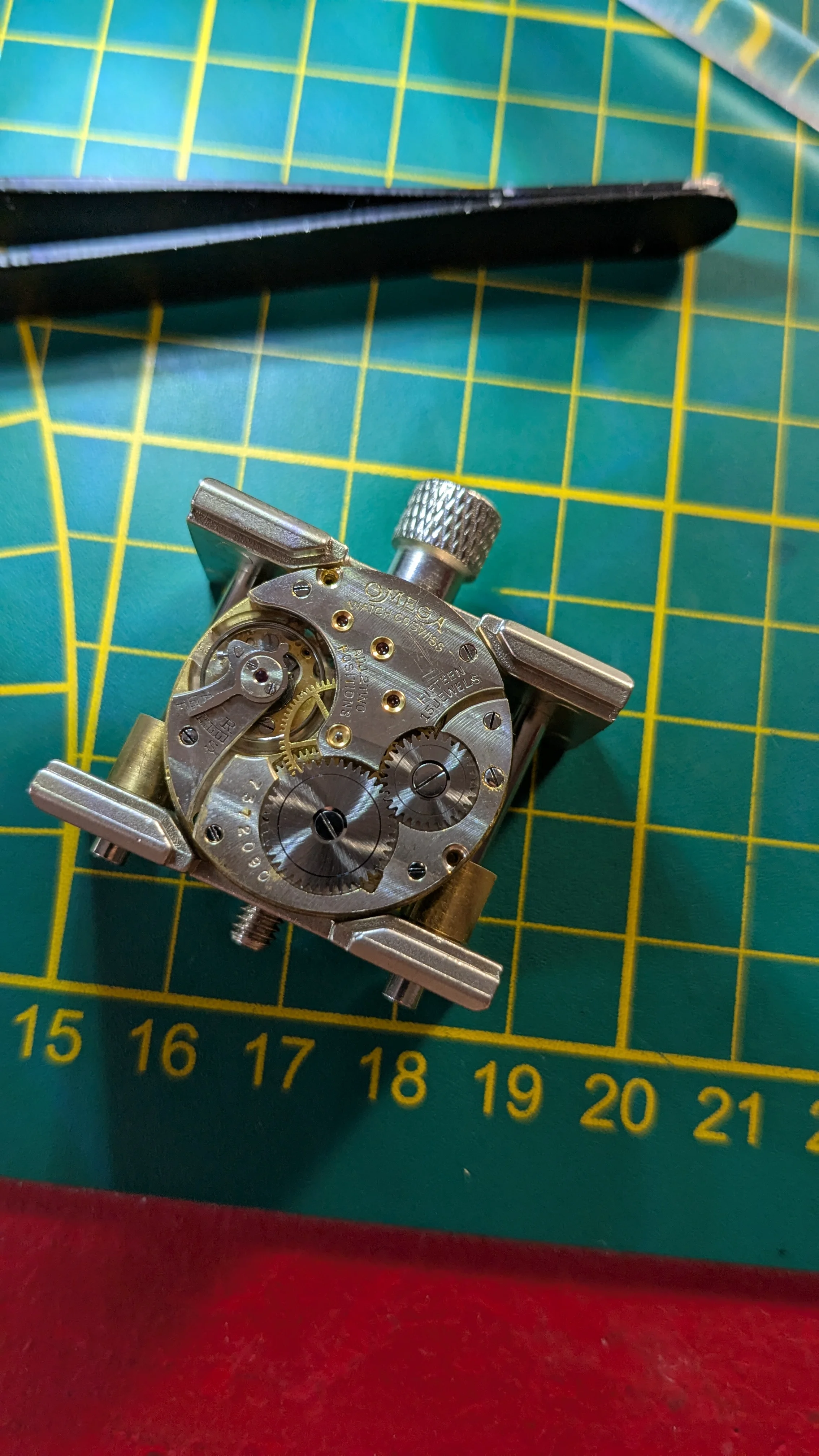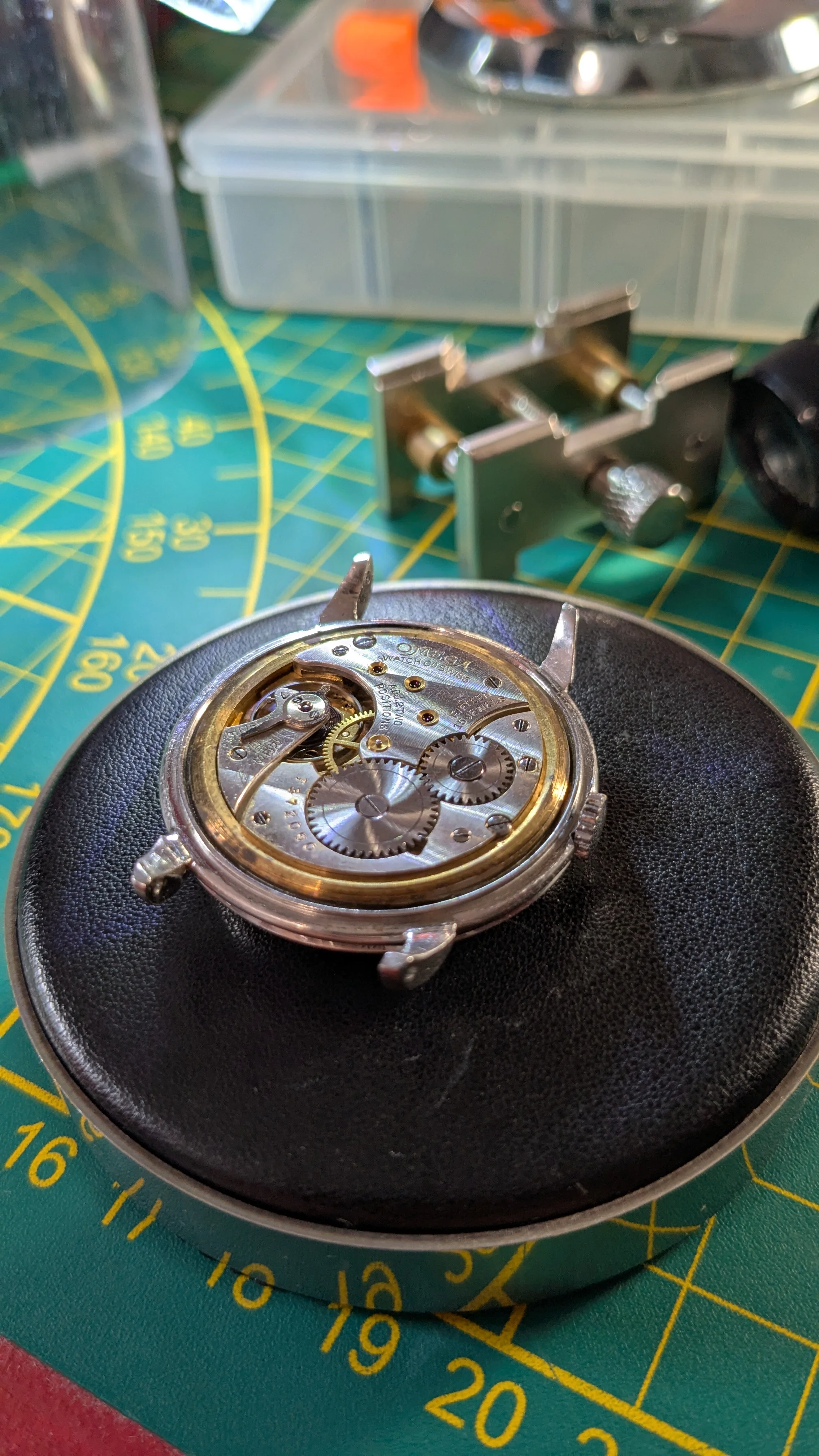 The hairspring was destroyed, and sourcing a replacement for this Omega 26.5 SOB T1 caliber was a challenge. I managed to find one in better shape, but still had to adjust and reshape it.
