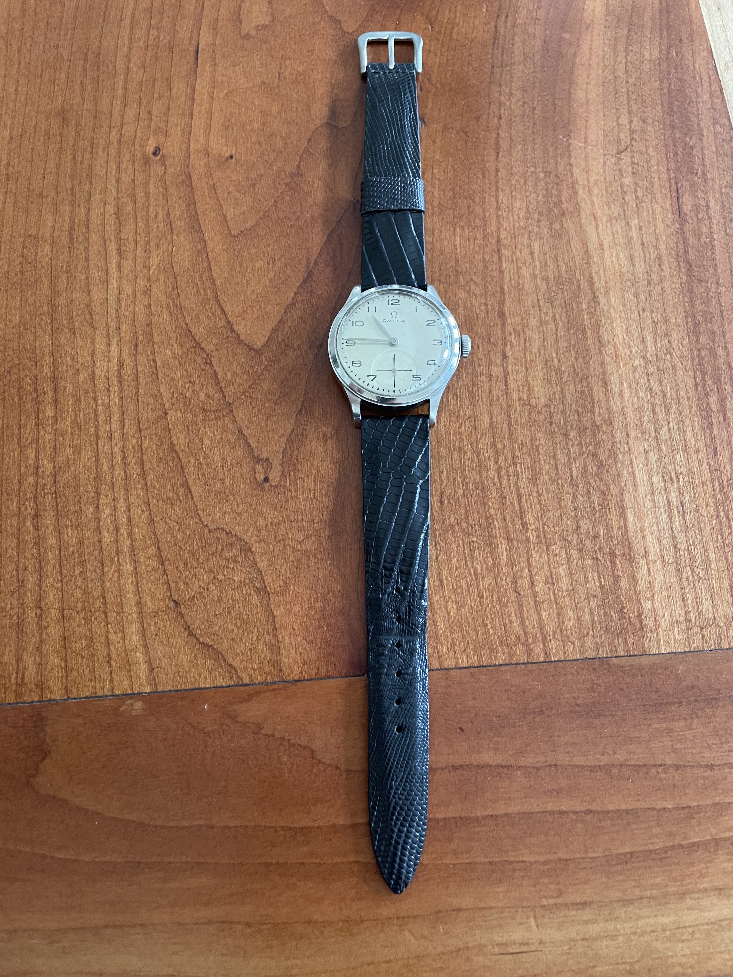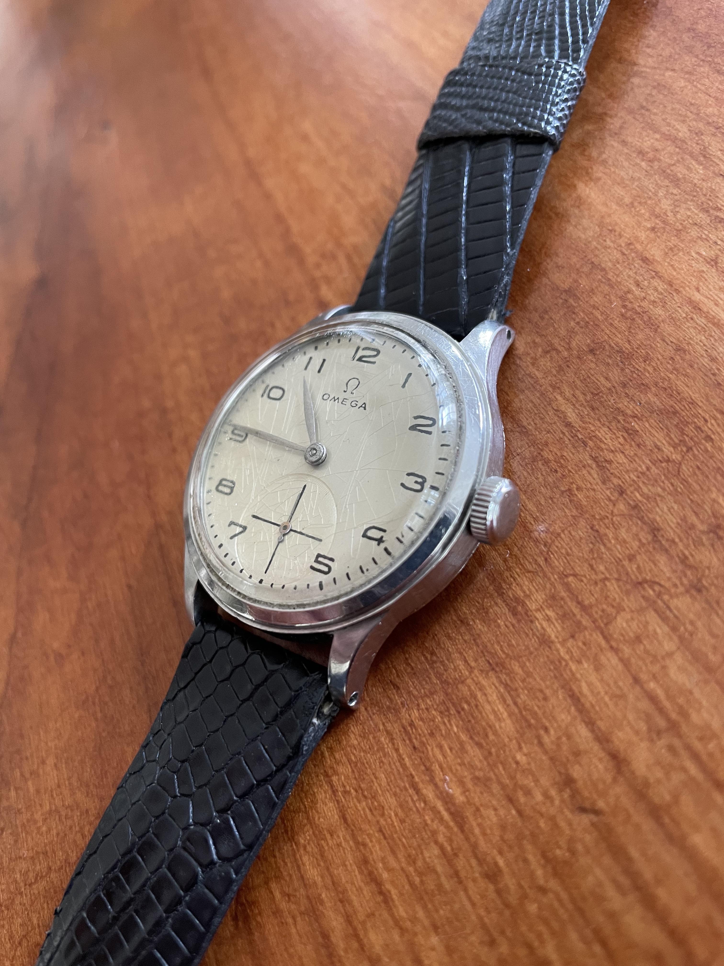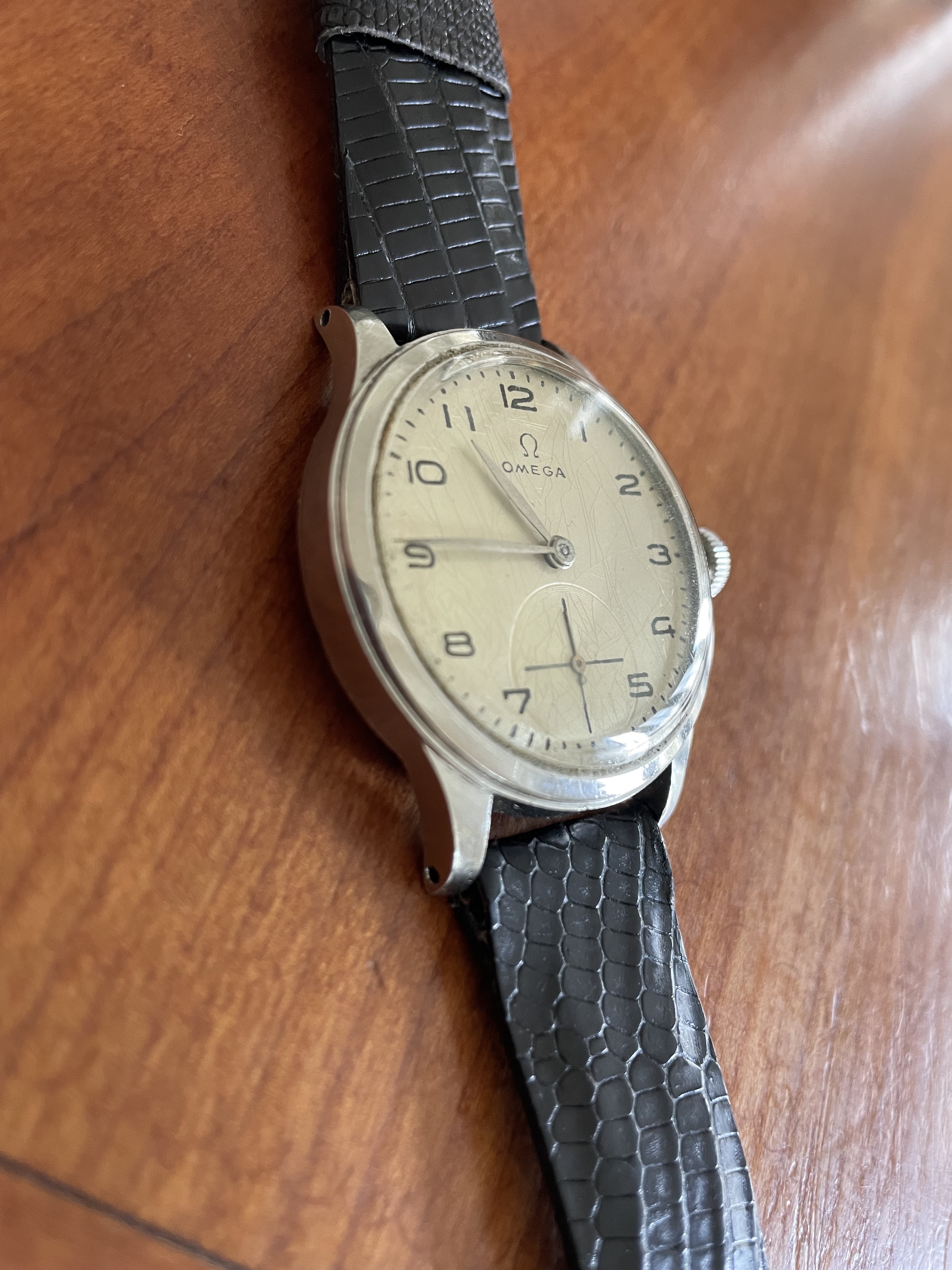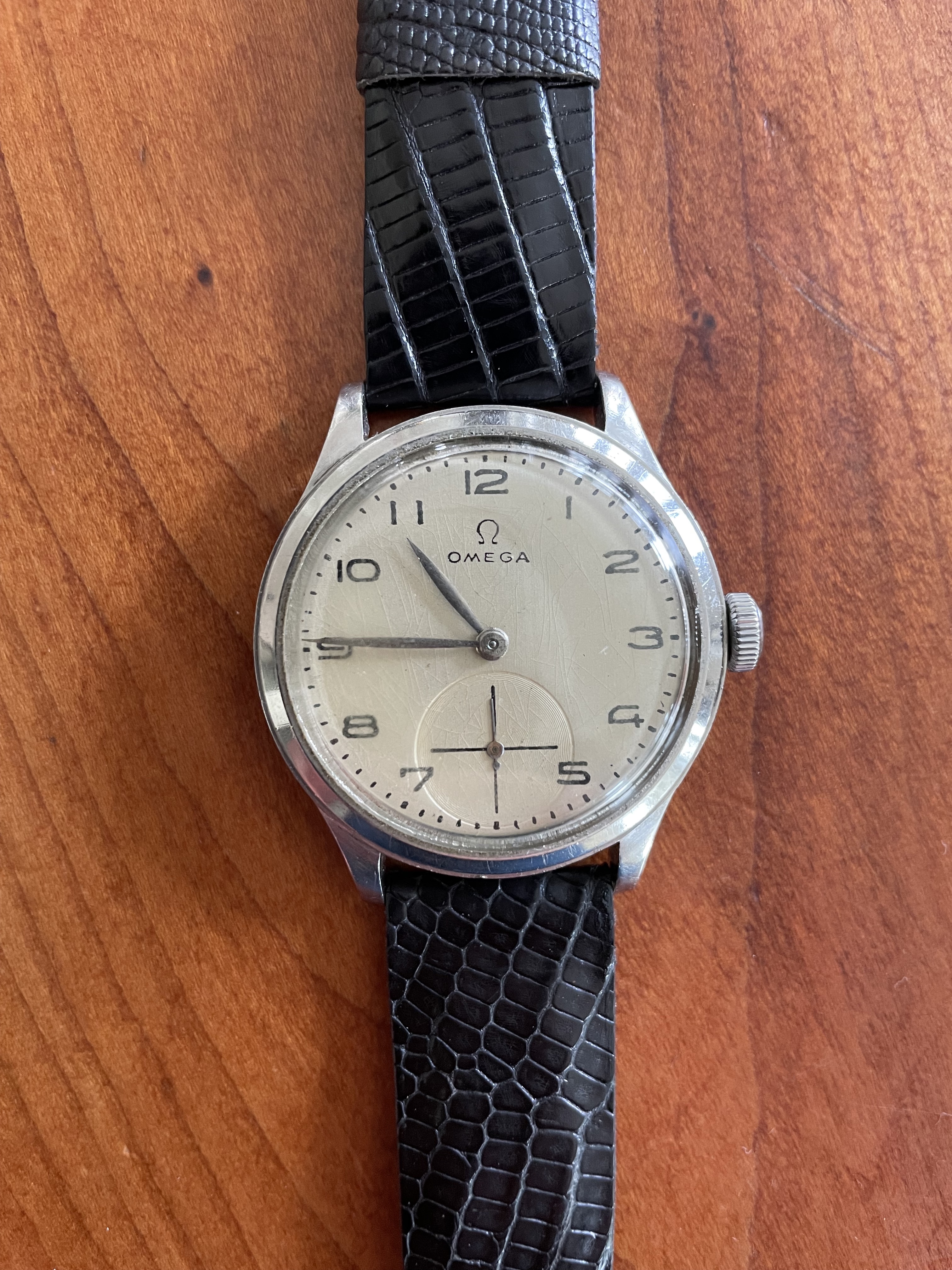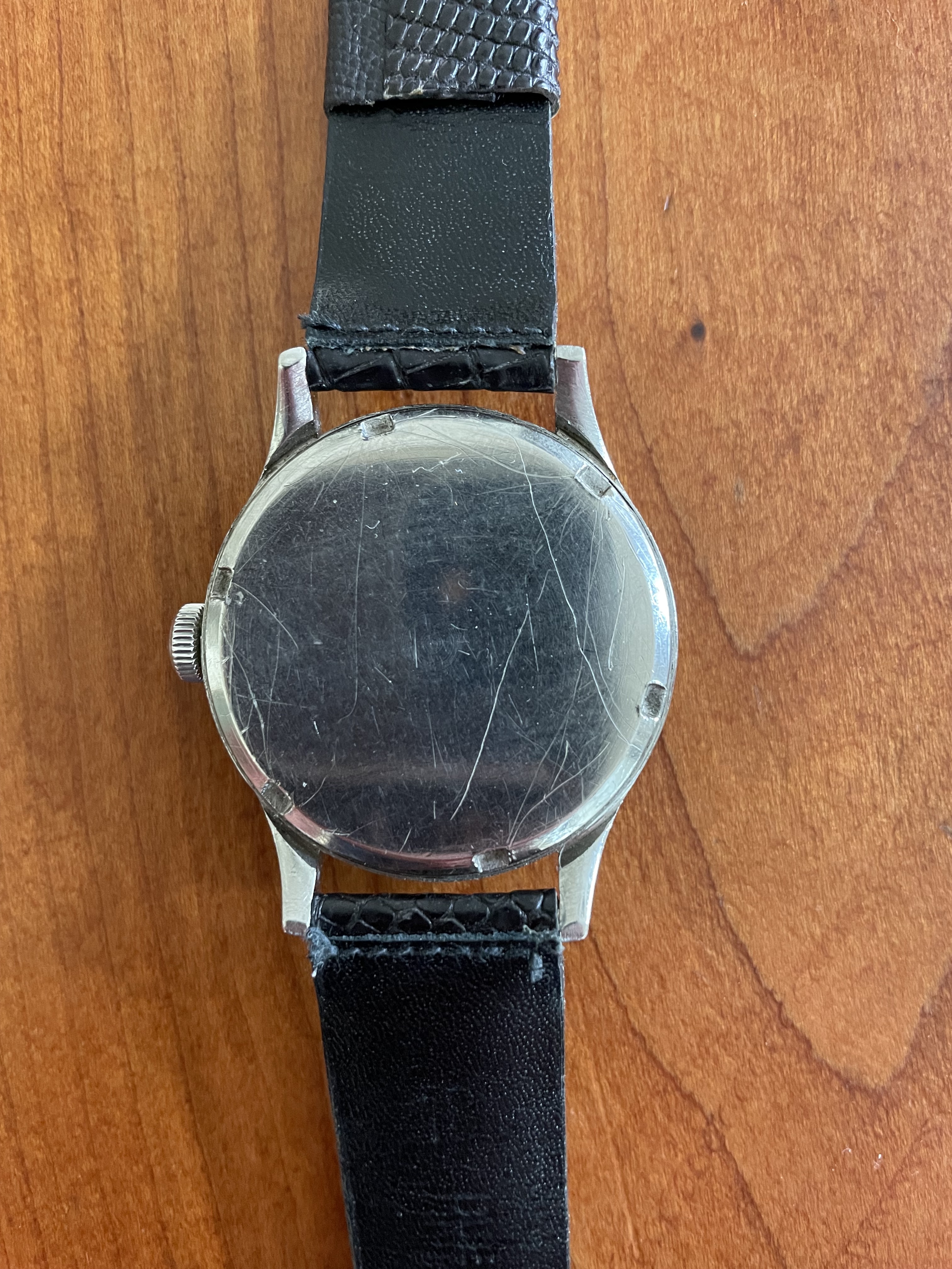 Probably mid to late 1940s. Poorly refinished dial hurts value considerably. Identifying information will be marked inside the case back and on the movement.