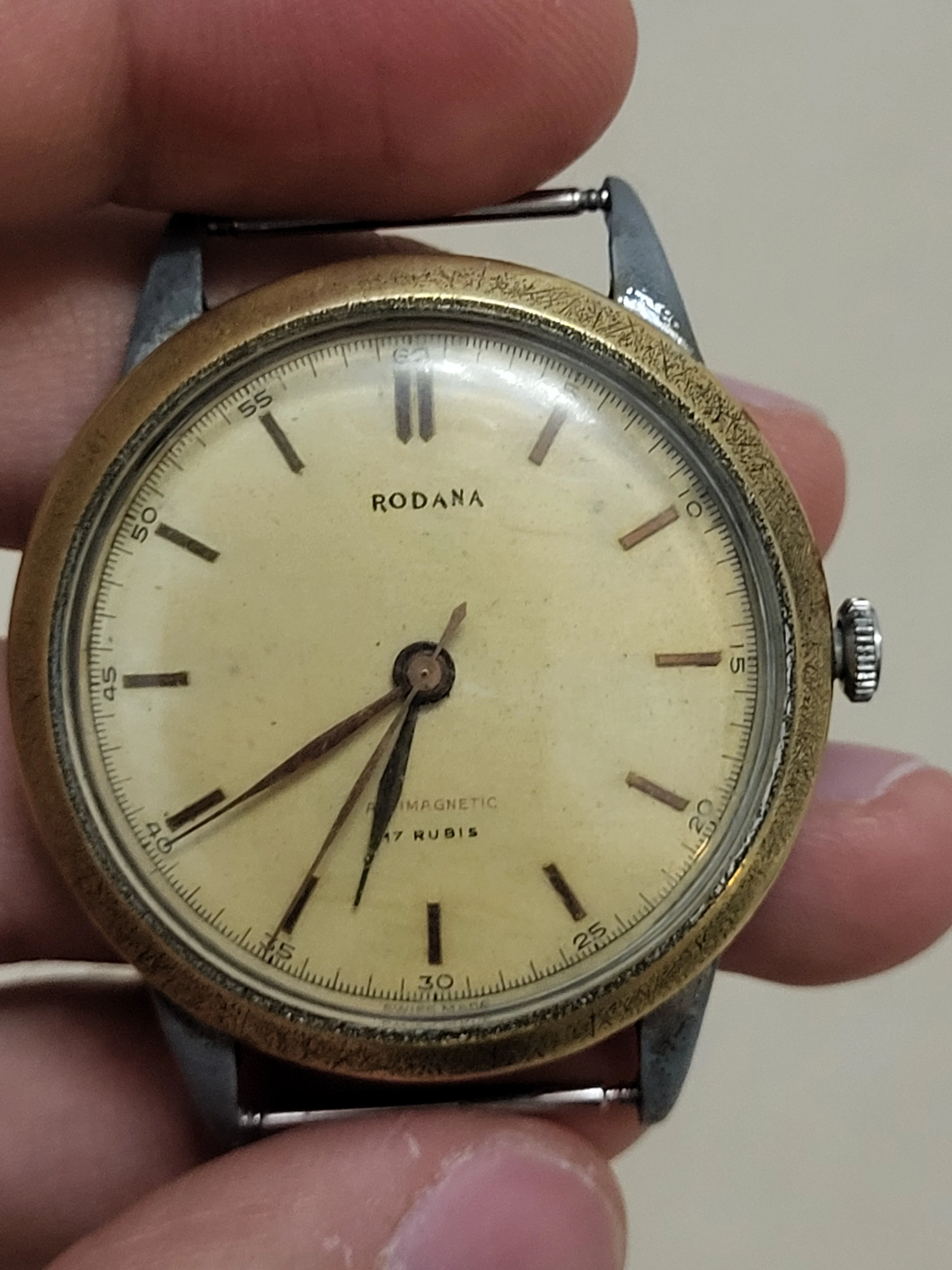 I've attached a picture of the watch to help with identification. It has "Rodana" on the dial, along with "Anti-Magnetic" and "17 Jewels".