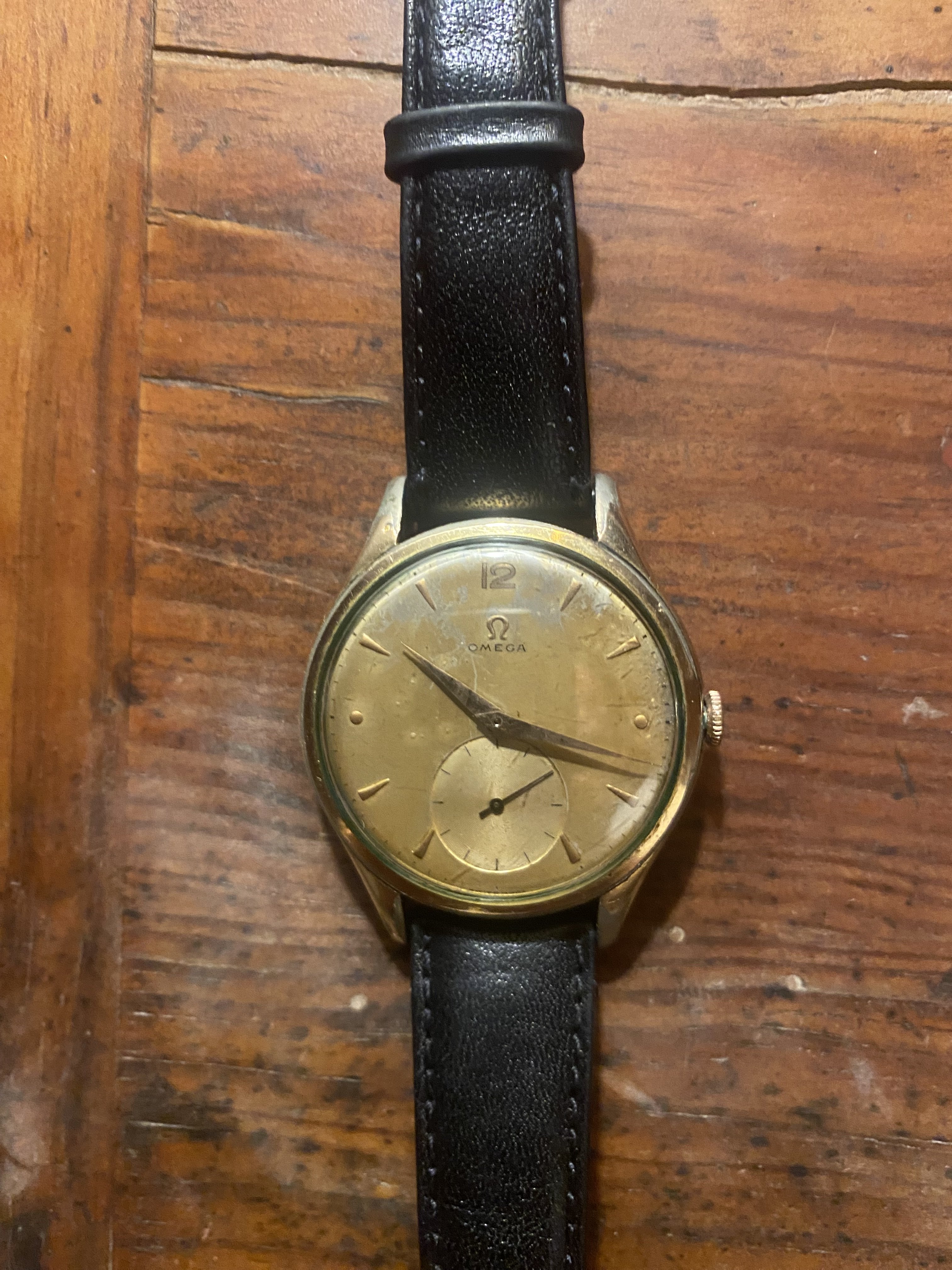 Looks a lot like a UK market Dennison 13322, probably solid gold. Probably from sometime between 1946 and 1960. That is to say, it is an Omega but the case was made locally in the UK. Probably in 9K gold but there were some in 18K. Search Denission 13322 on here and you'll get a lot more info. I may be wrong and it could be a Swiss case or from somewhere else. Get the back taken off and all will be revealed on the inner caseback.