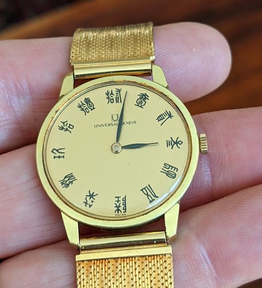 I inherited this from my grandfather in 1973 when I was a kid, unlike a couple of others that I beat the crap out of, I almost never wore this one, it is in the identical state today as it was then. I know nothing about its provenance. My grandfather spent a lot of time on business in Hong Kong in the 50's-60's which I guess would explain the numerals, presumably from U-G's HK era??? It does say "Swiss" on the dial.