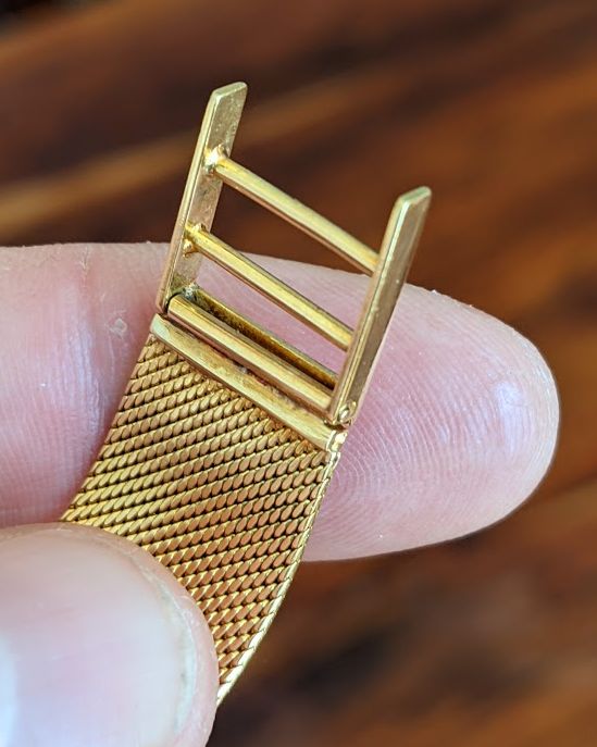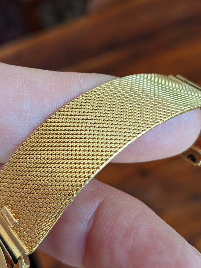- solid gold mail bracelet, 18kt? No extra "links", no idea if this can be adjusted, I would say no