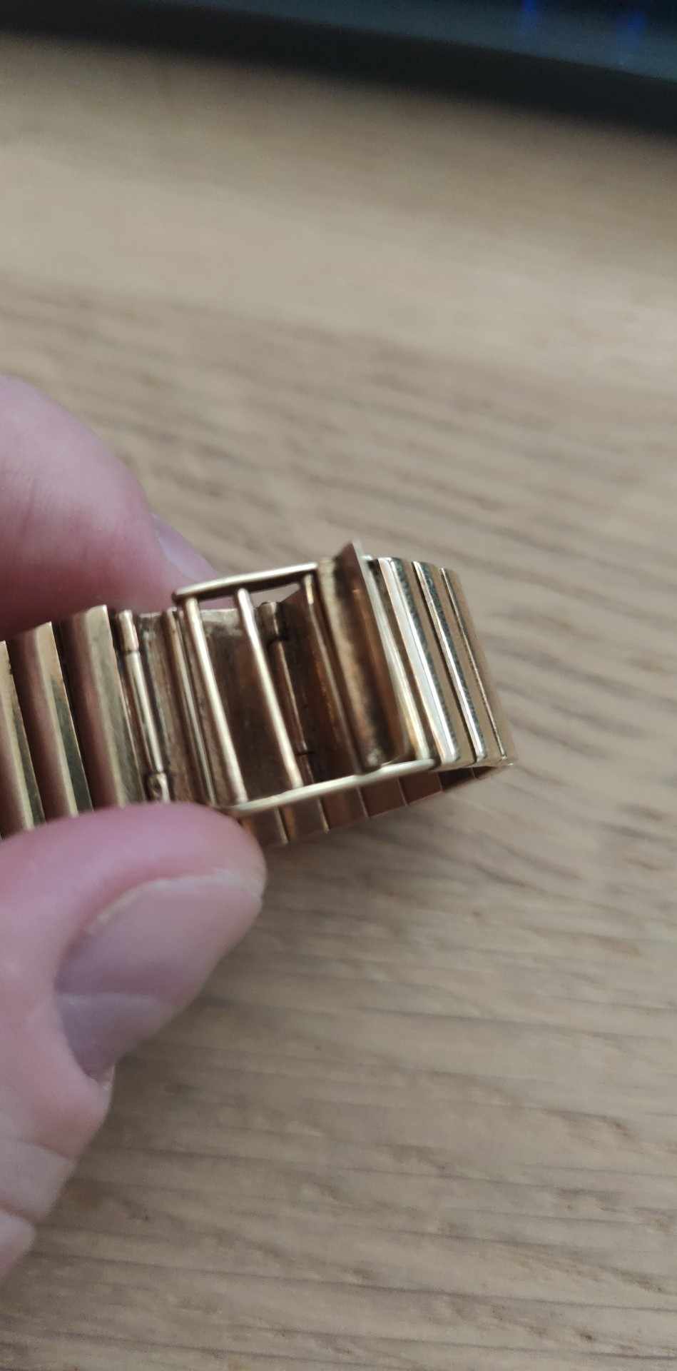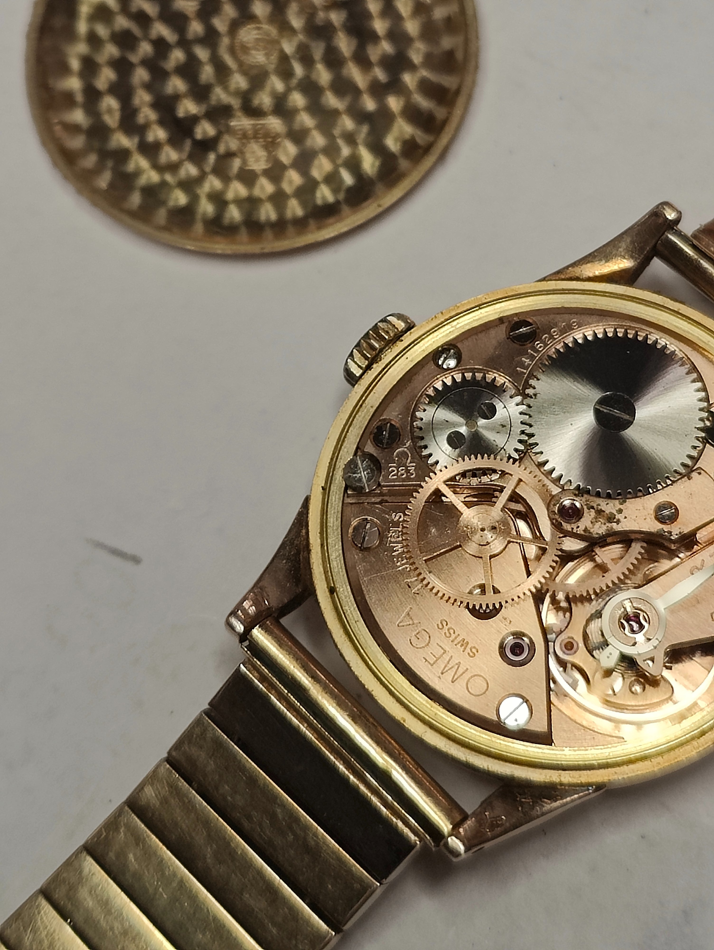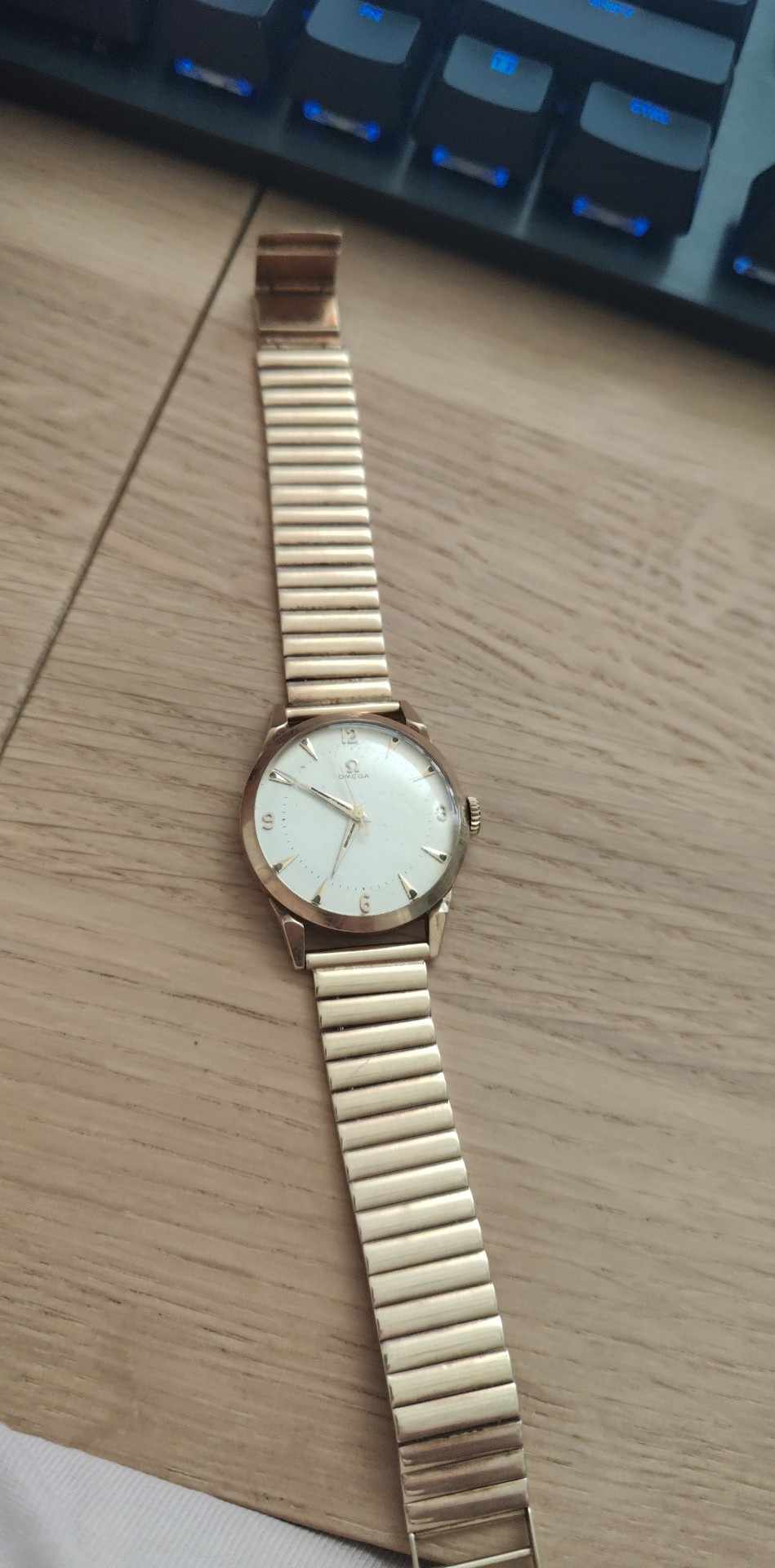 The brand is Omega. There is no model name. There may be a model reference number on the inside of the case back. That is also where you would be able to discern the type of gold used in the case.