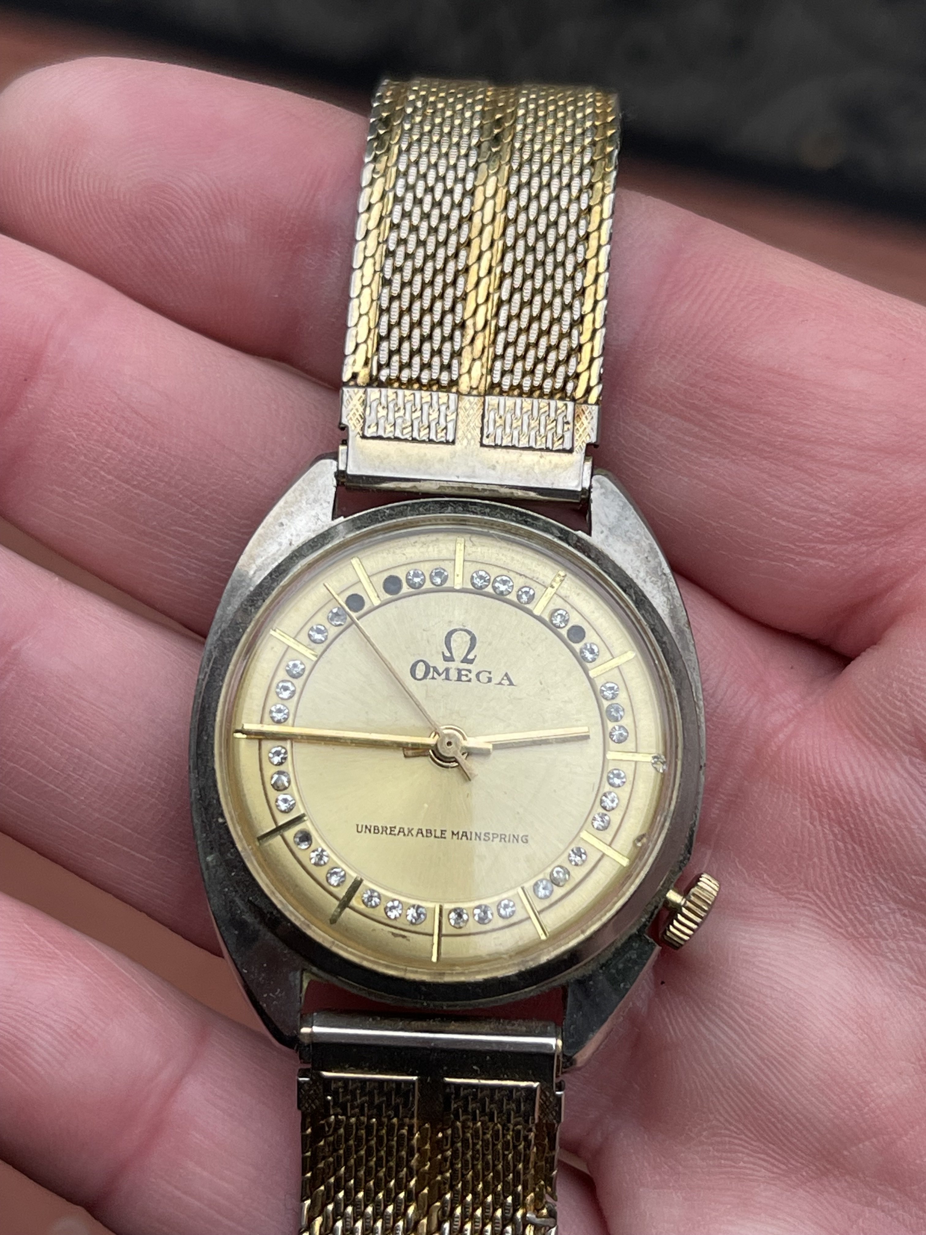I need some help identifying this Omega watch. I don’t know if it’s real or fake. It runs, but has some “diamonds” that have came loose on the face. If it’s real and valuable, I would like to have it cleaned up and repaired.