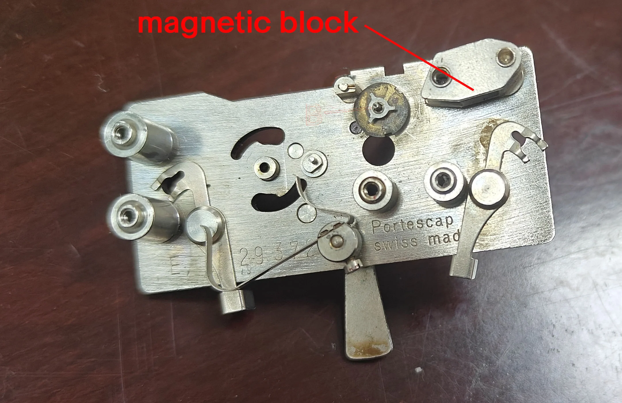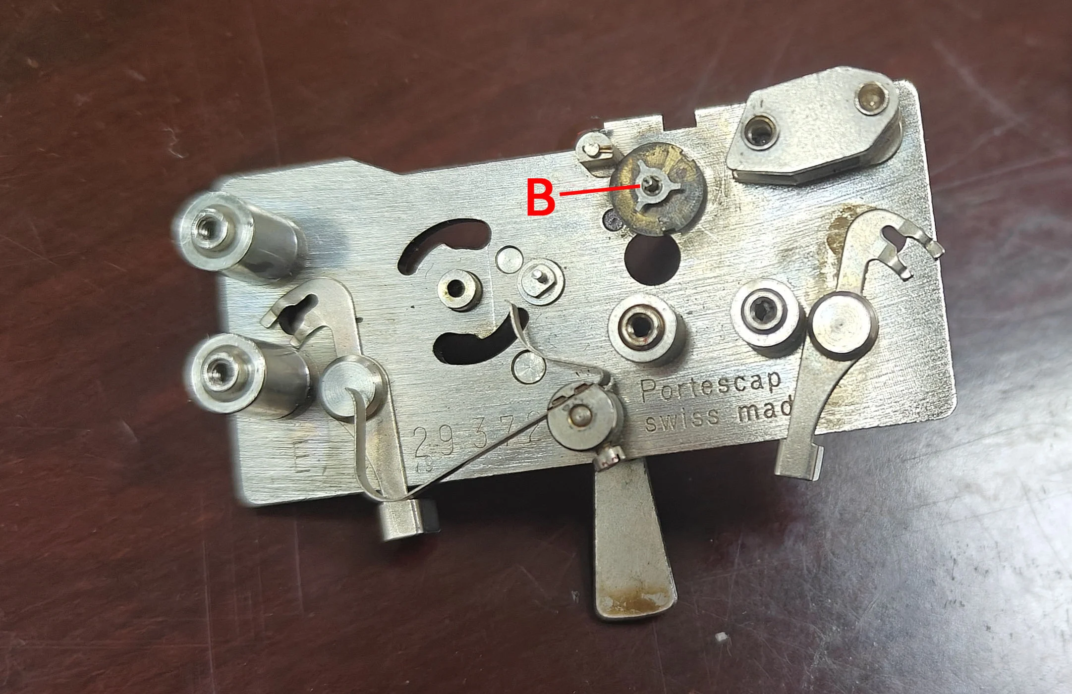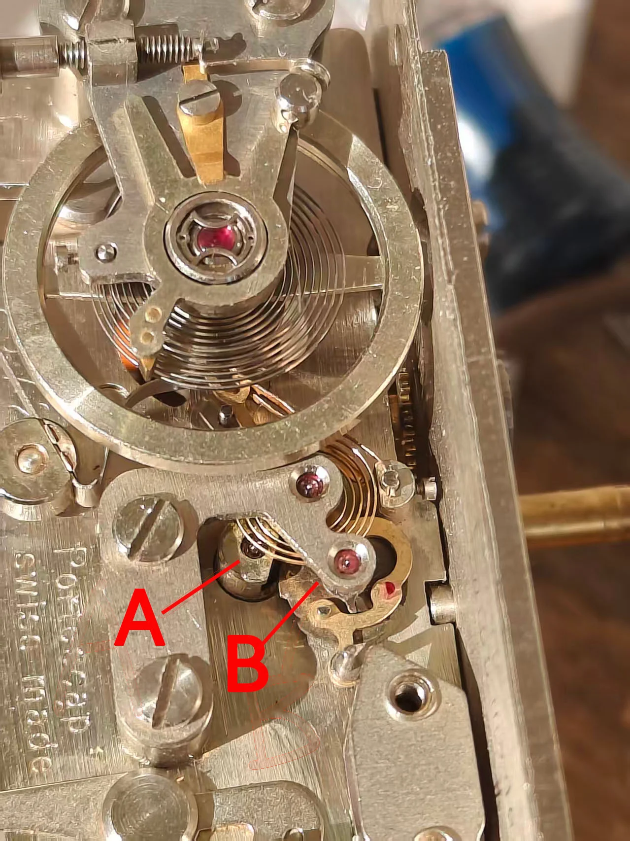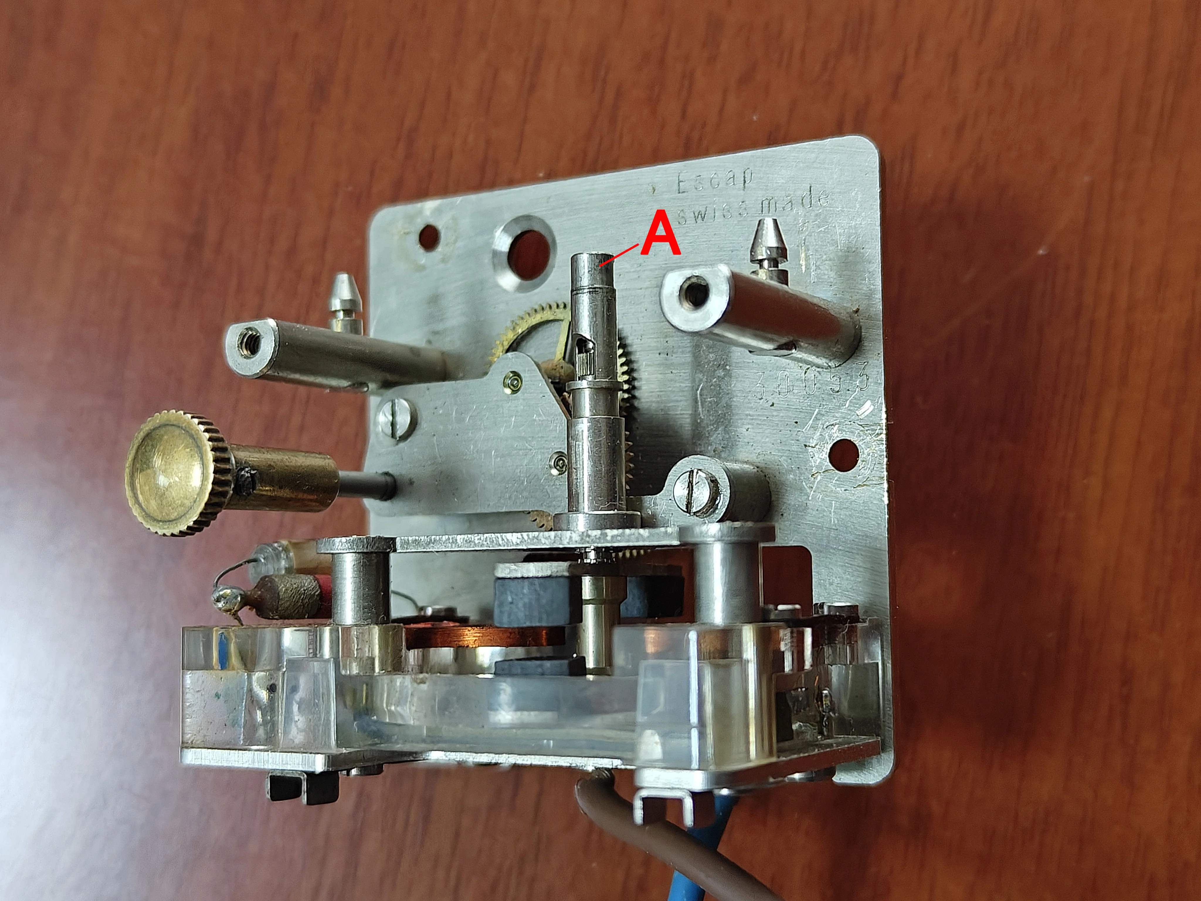 ·I have a second-hand clock, as shown in Figure 1. It is battery-powered, and the movement has the number "129372" printed on it. After installing the battery, the power system works normally—I can see the A-axis rotating. The B-axis is connected to the transmission gears, which then drive the hands. The platform operates normally when manually adjusted. However, the clock does not run. I can see a small gear at the end of the A-axis, but there is no gear on the corresponding part of the B-axis. If there were a gear on the B-axis as well, everything would be easily understandable—the clock's failure to run would be due to a broken transmission. However, the B-axis does not appear to be missing any parts, and there doesn't seem to be space to install a gear. Please help me confirm: