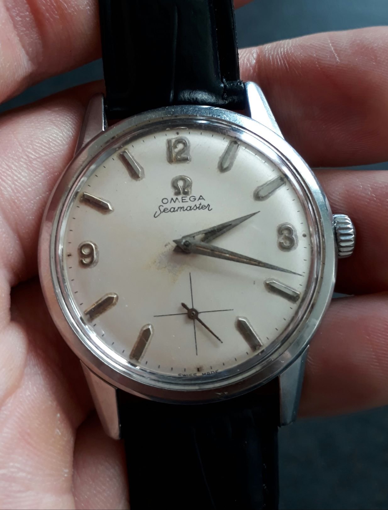 Got this a long time ago from an antique shop, didn't cost much. As you see, it's got plenty of patina. I've done quite a bit of google forensics, and have found near matches, and one exact match except with golden dials and hour markers (shapes and text placements etc. all were exactly the same). Is this genuine, or does it belong in a beach somewhere? Do you see anything funky with it, other than the condition, anything that looks replaced or like a mismatch? If it's cr**, just say it's cr**. I am no aficionado, so all info appreciated. Also, I'm curious, what does the "12" in the reference nr. refer to? Thank you!