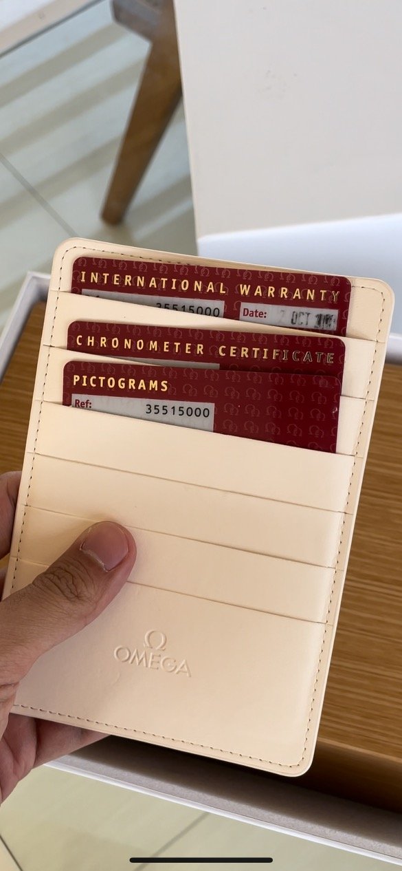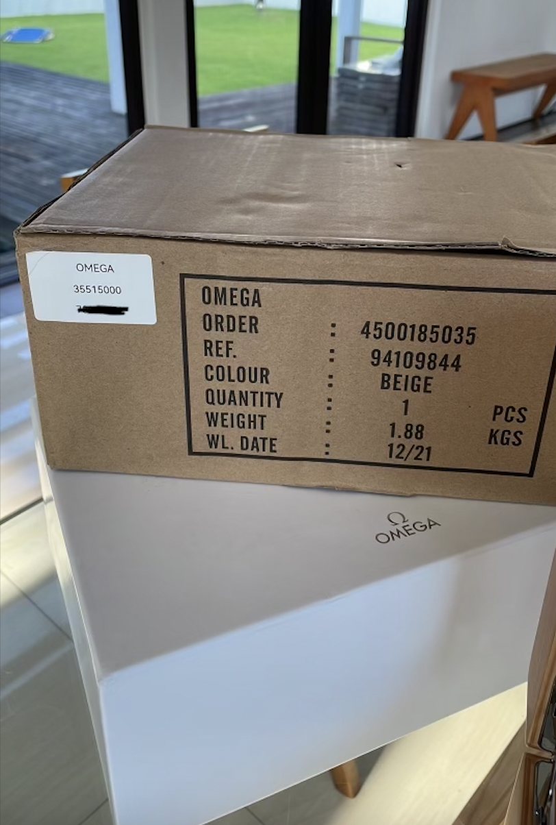 So need help on this Omega I just got. It's a reference 3551.50.00 dated on its warranty card 2010. It comes with all 3 cards, box outer, and shipping box. What makes it unique is the box is the wooden box which if I'm not mistaken was produced in 2015. To add the white outer box and shipping box are dated 2021. So this made me think it is just a provided box from secondary market and not an AD box. But when I look at the shipping box it has a sticker that also says the correct ref. and serial num. of the watch.