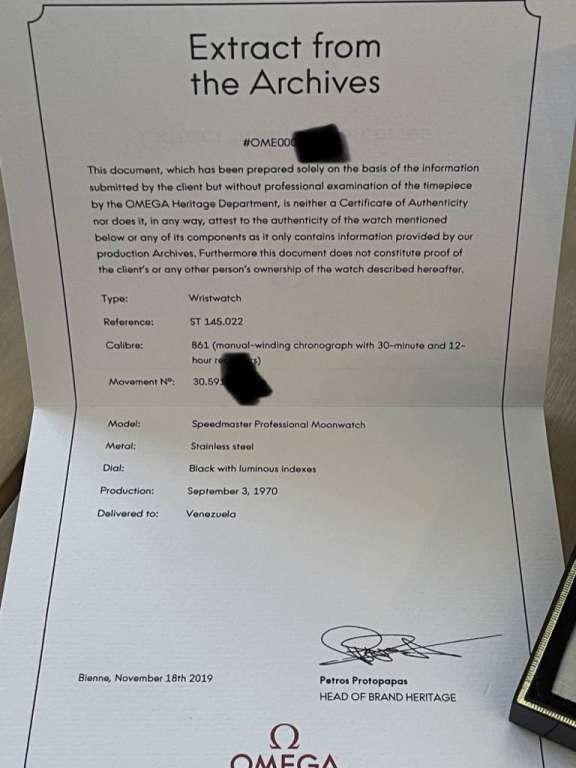 It comes with original box, blank warranty card in very good state as well as a register extract from omega.