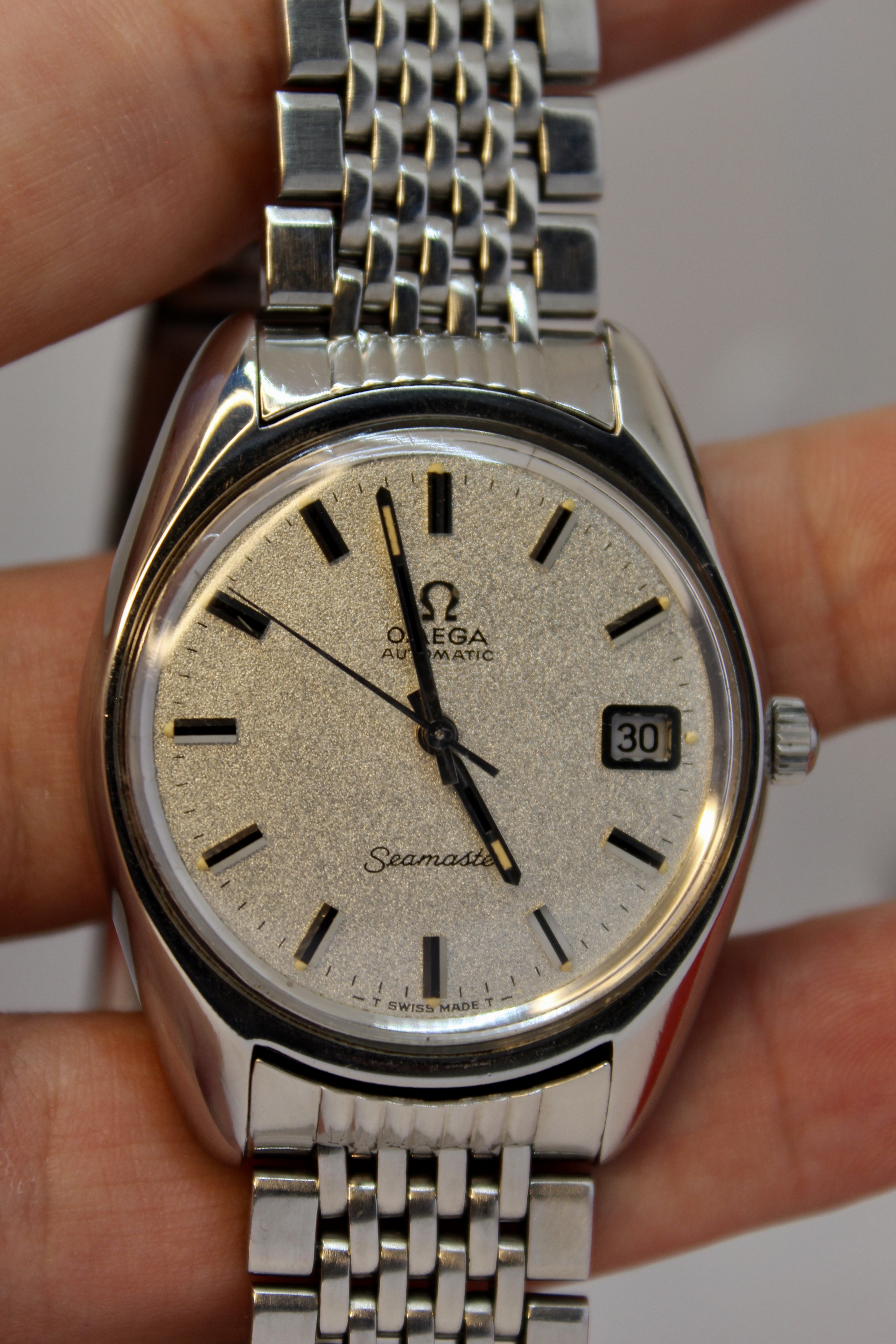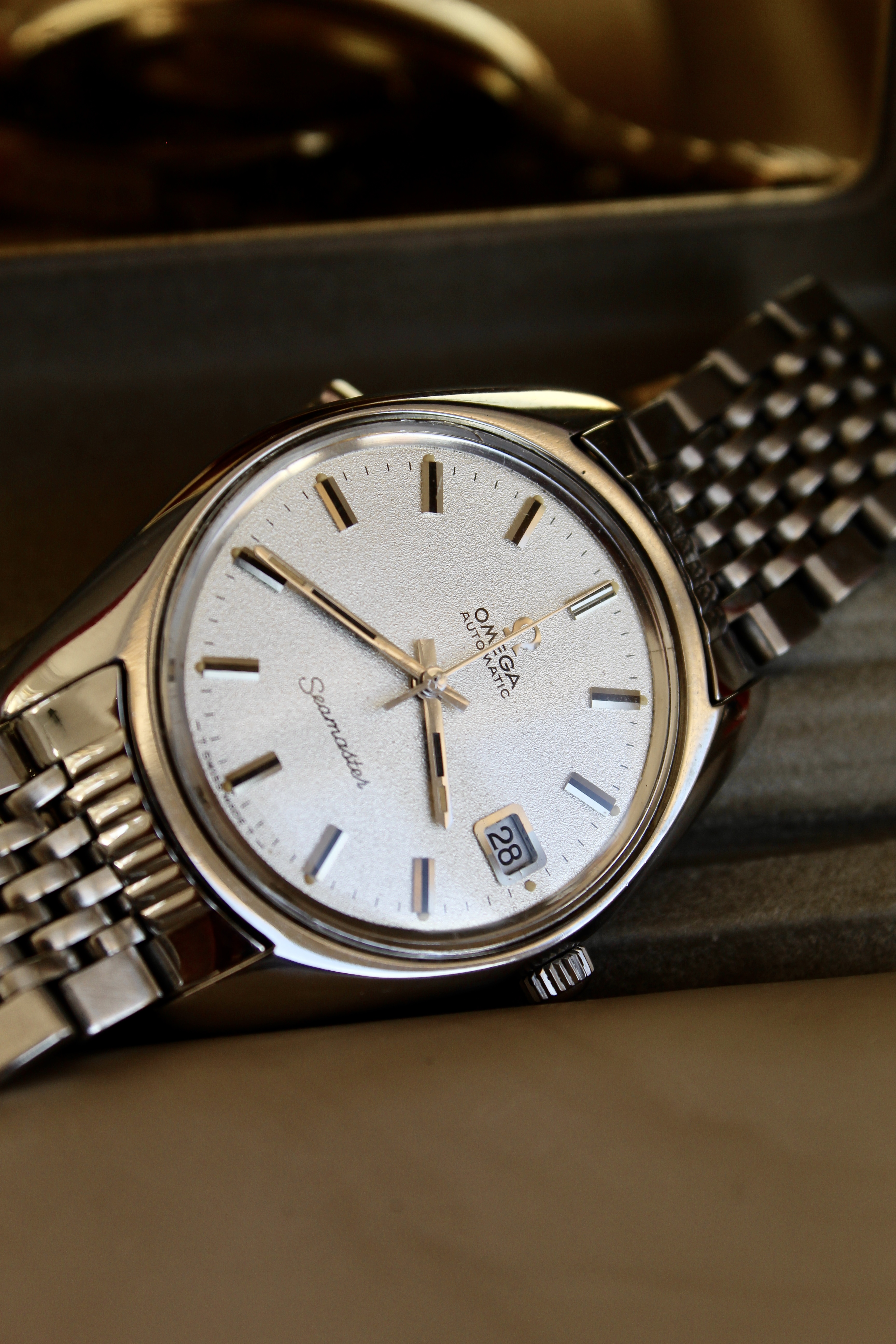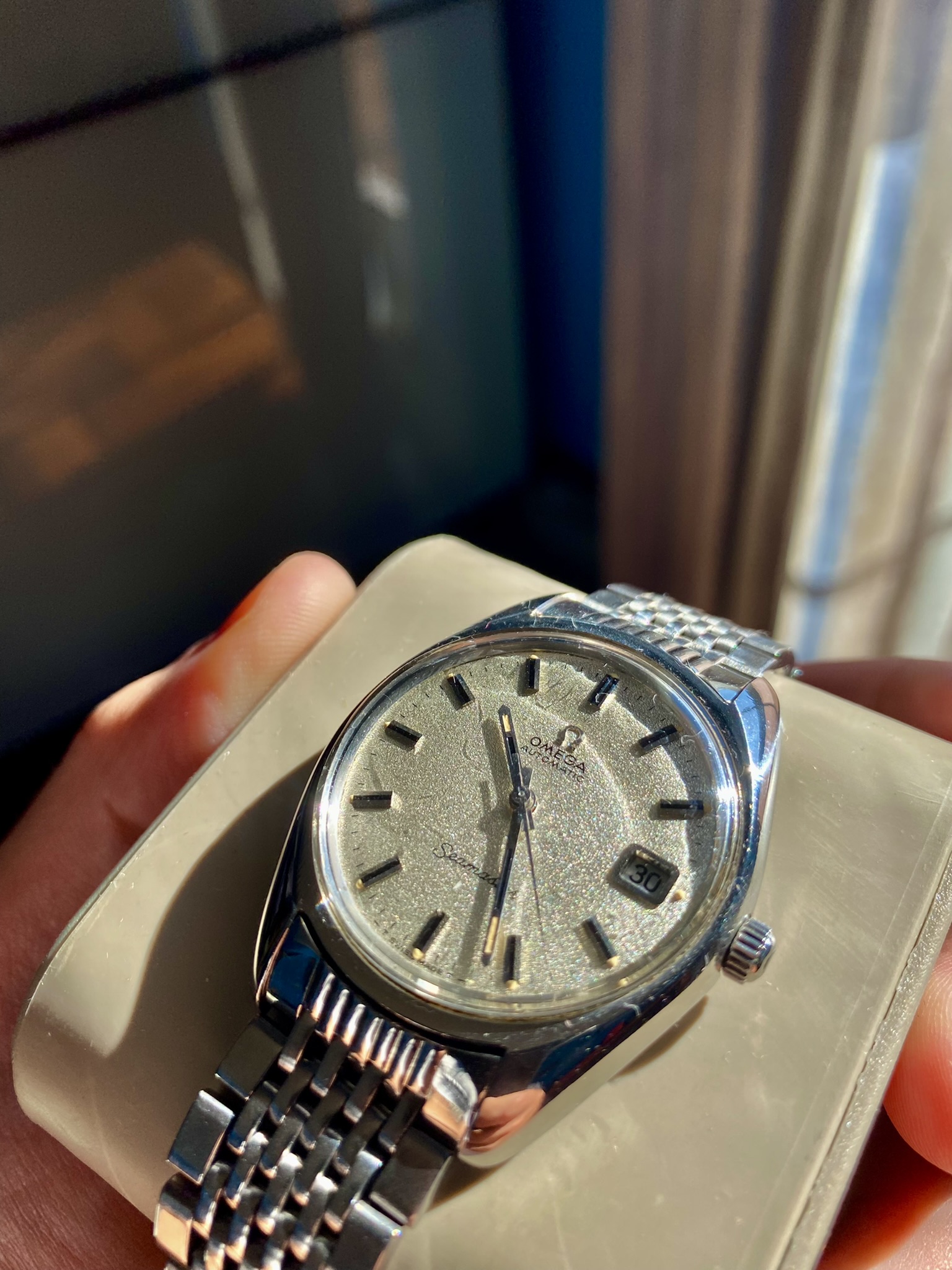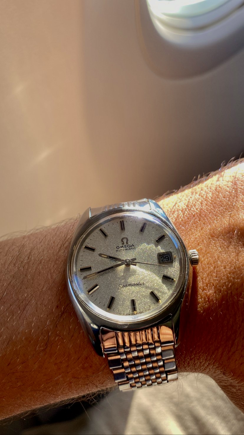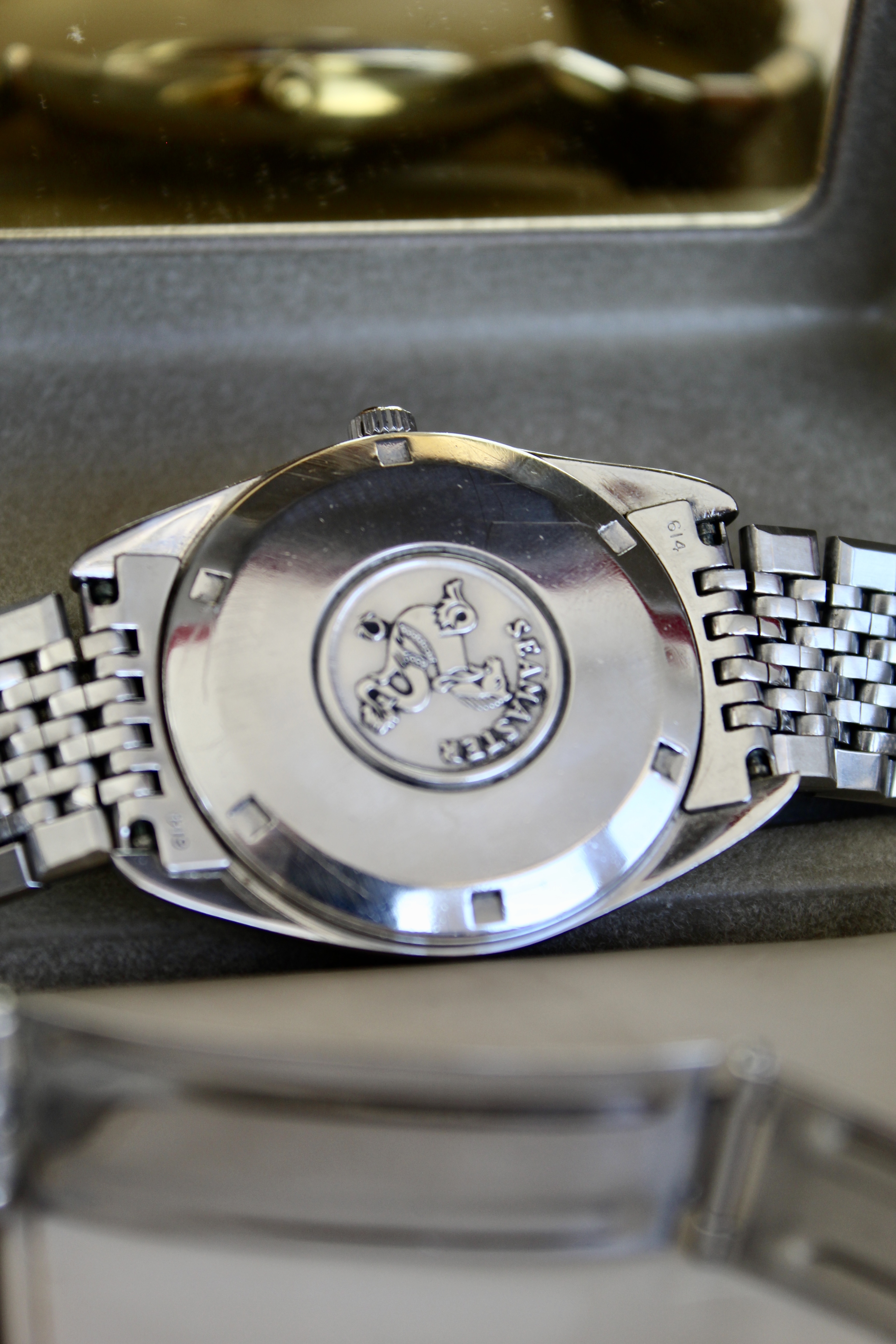 the case is bigger than other vintage watches, being similar to newer models, going to about 38mm with crown, and an incredible dial known as sparkling dial or stardust dial. The glass is the original one with the brand on it, and in great condition.