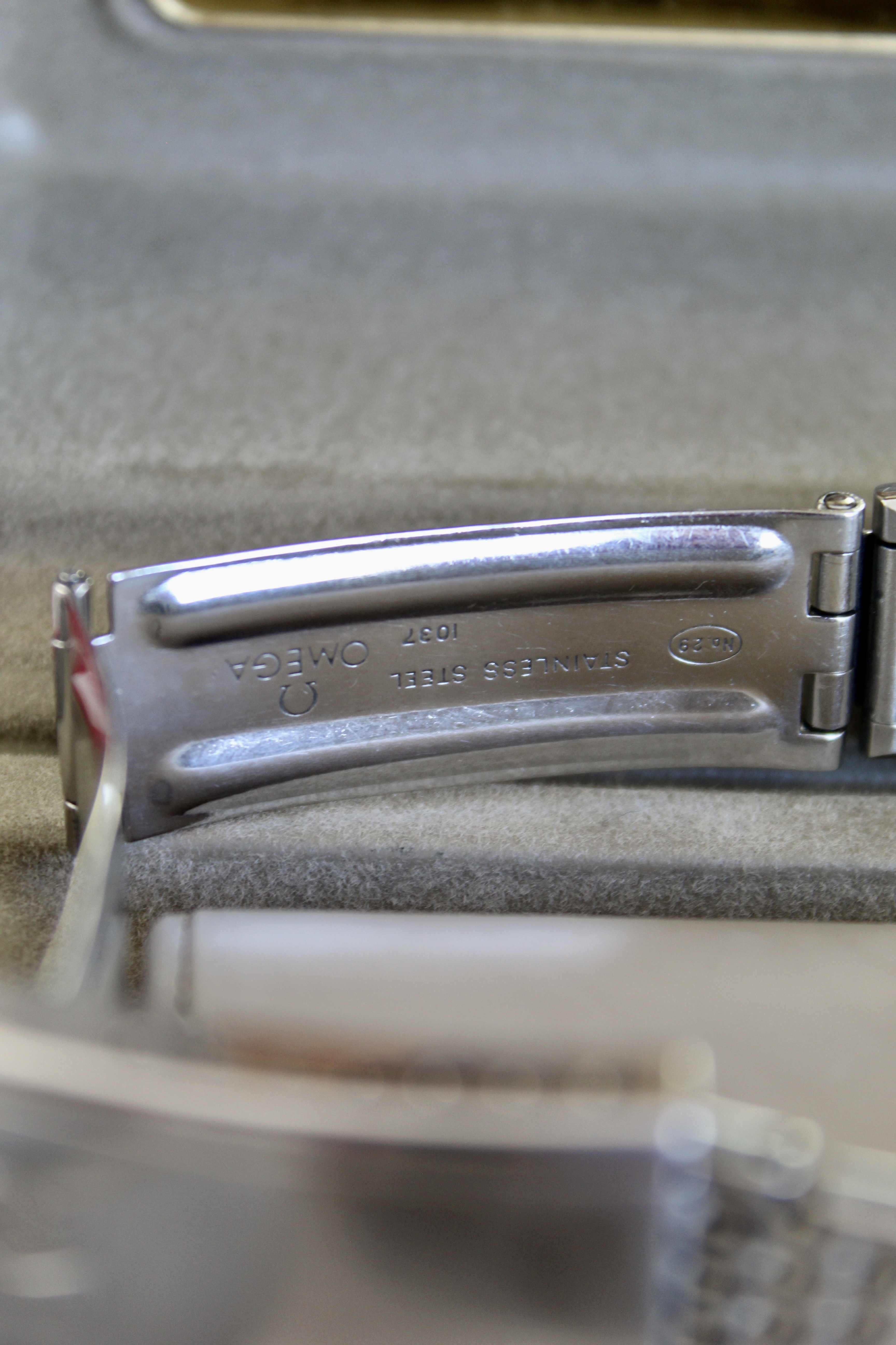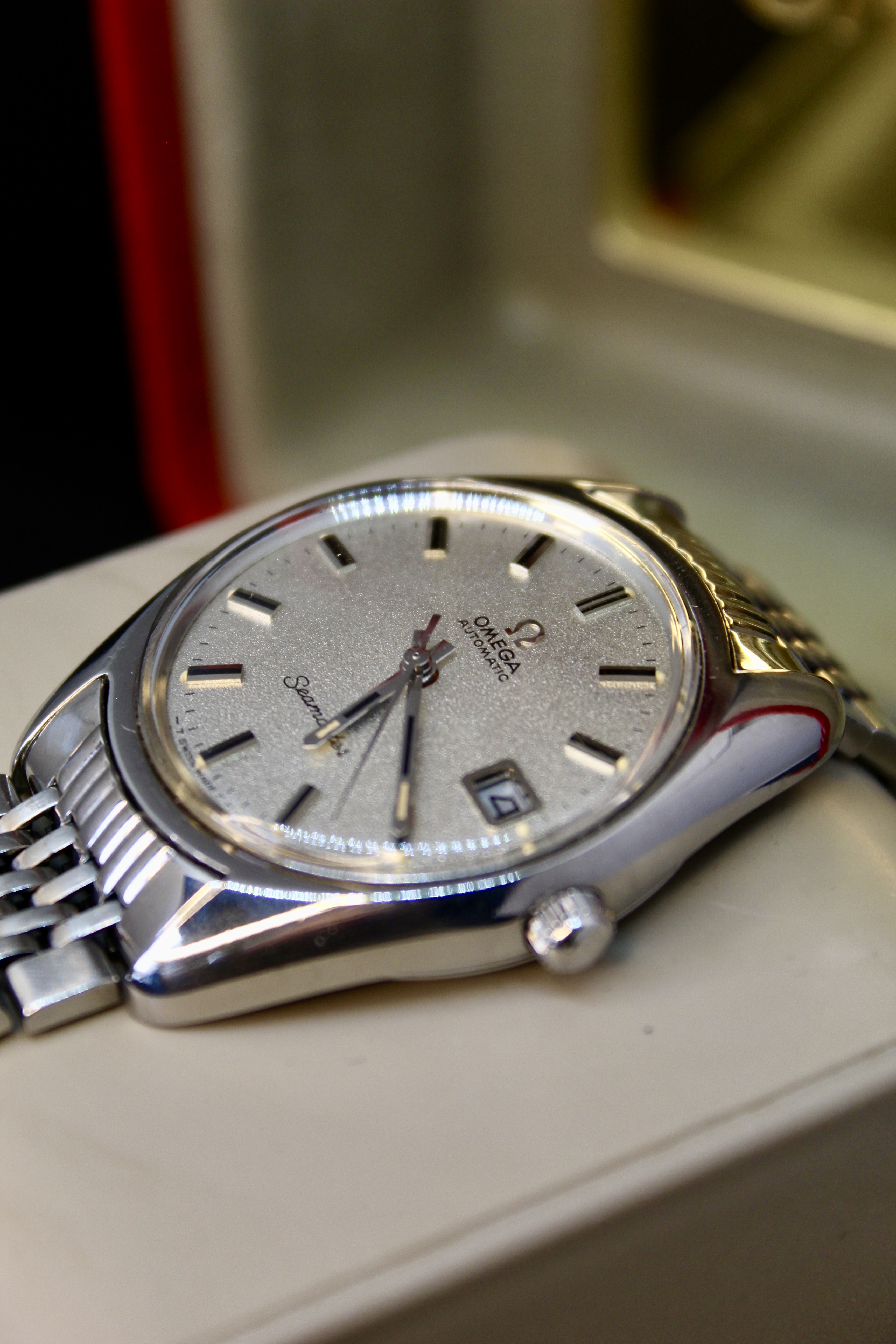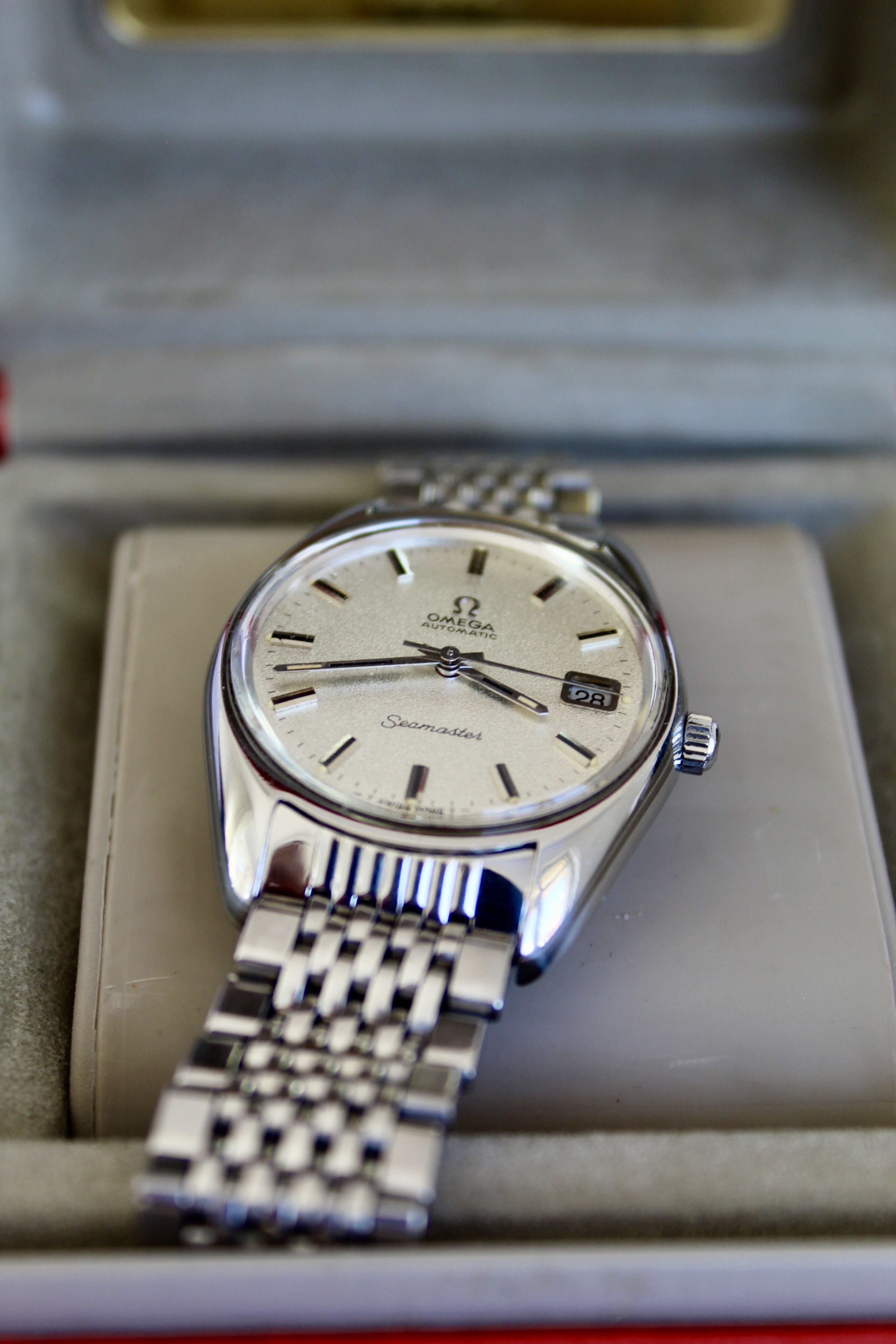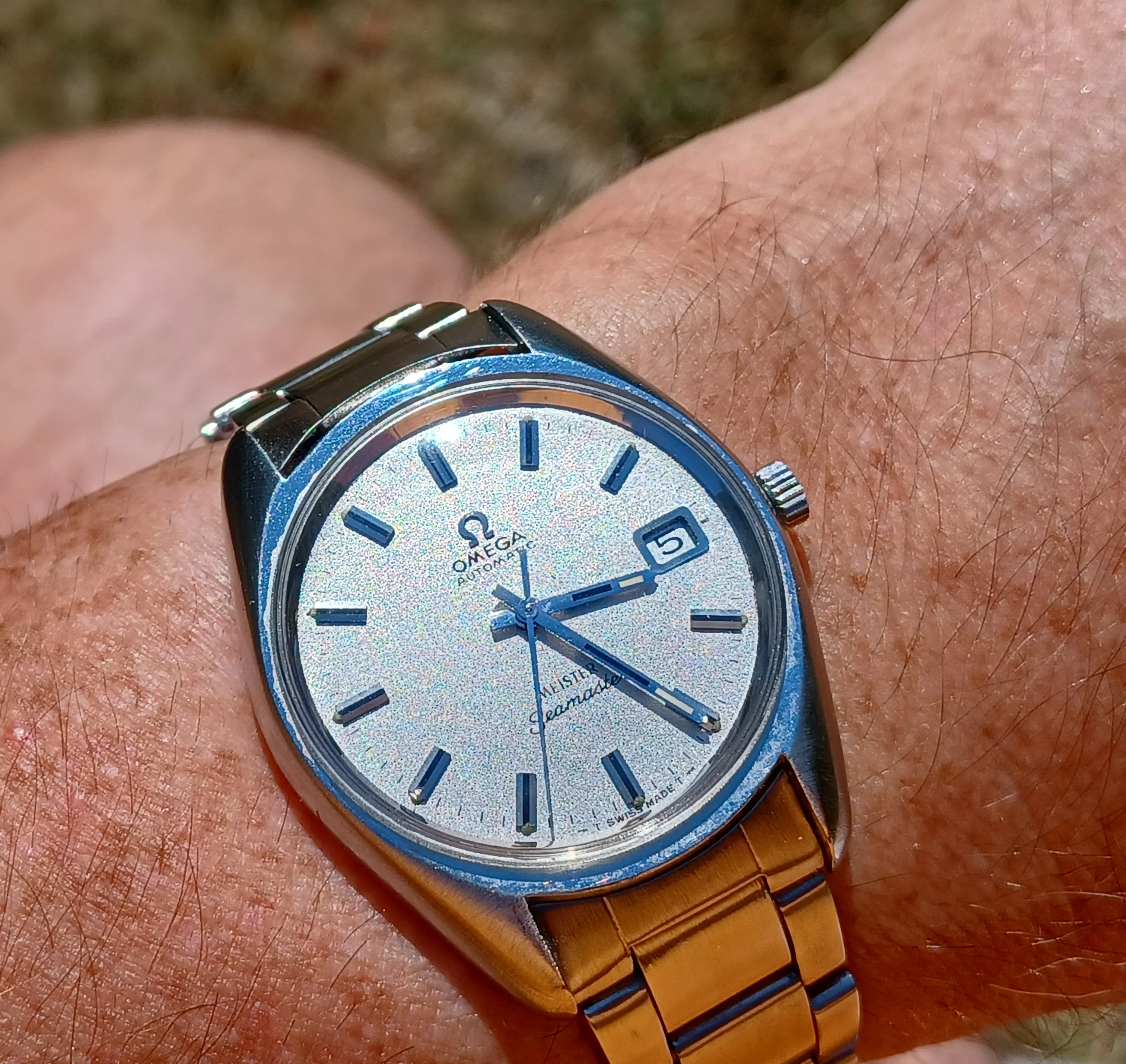 the case is bigger than other vintage watches, being similar to newer models, going to about 38mm with crown, and an incredible dial known as sparkling dial or stardust dial. The glass is the original one with the brand on it, and in great condition.