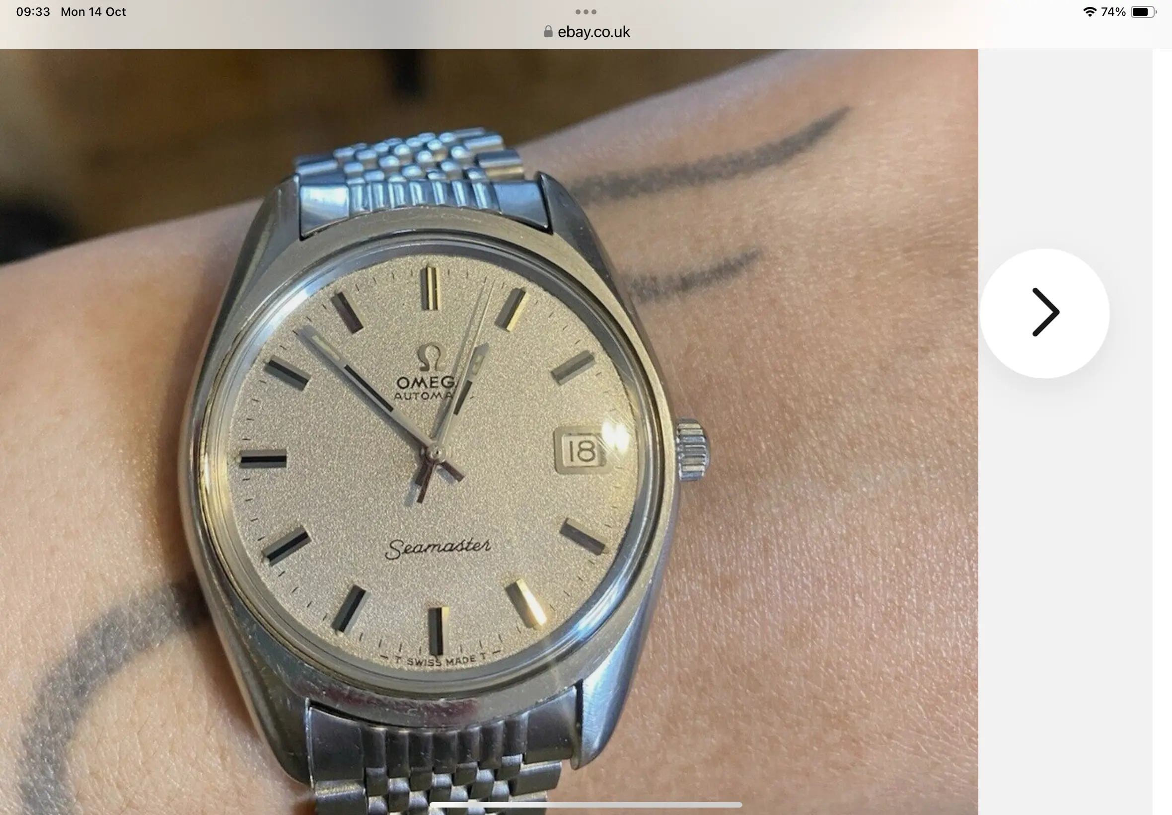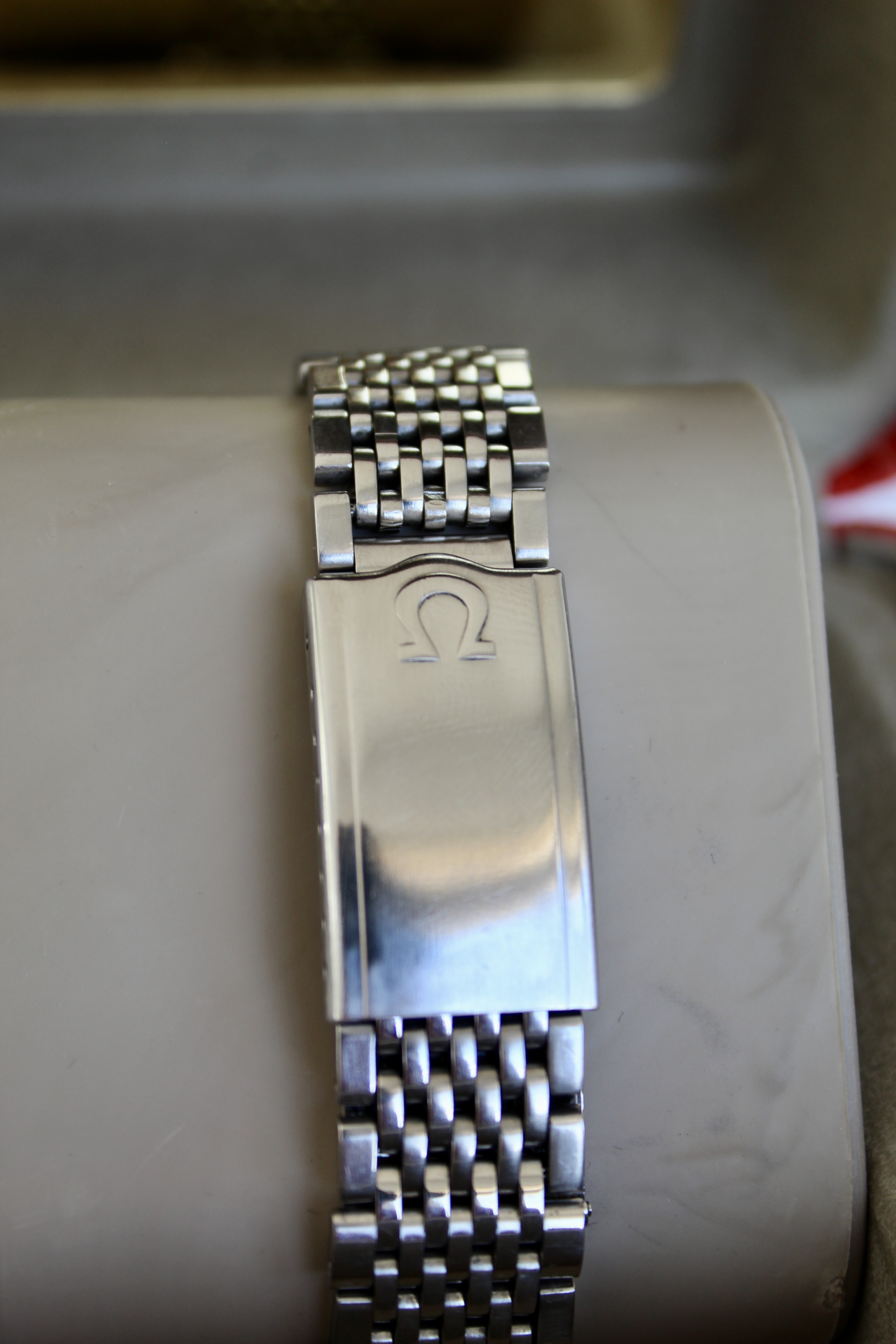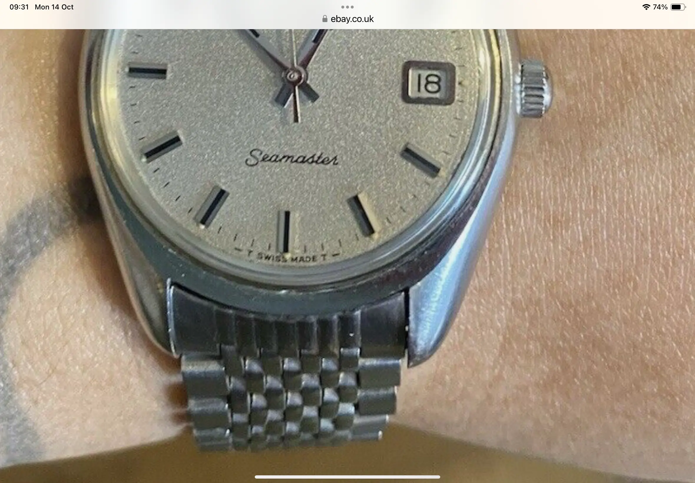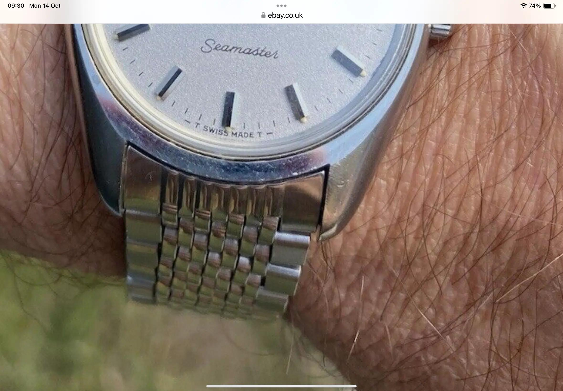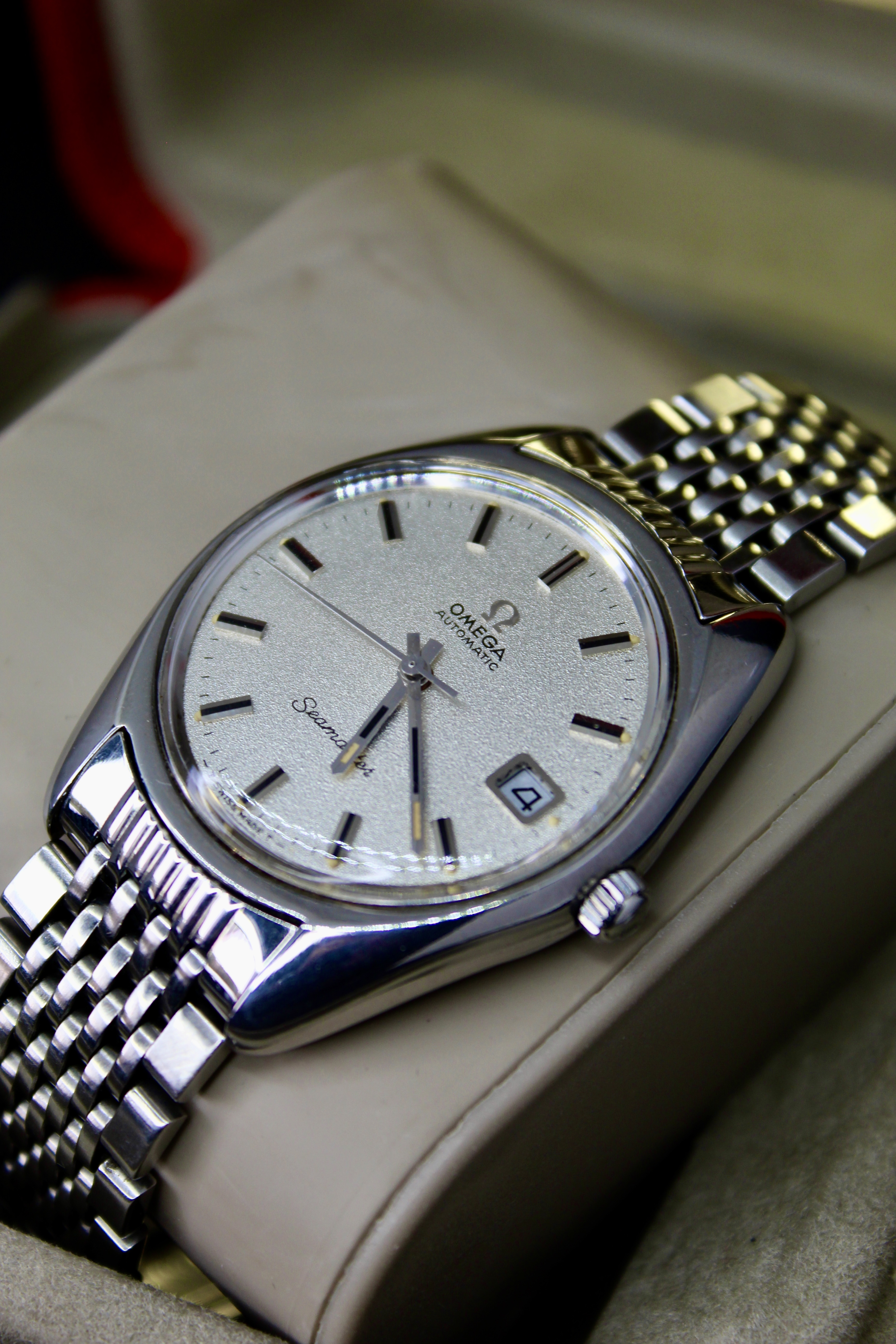 the case is bigger than other vintage watches, being similar to newer models, going to about 38mm with crown, and an incredible dial known as sparkling dial or stardust dial. The glass is the original one with the brand on it, and in great condition.