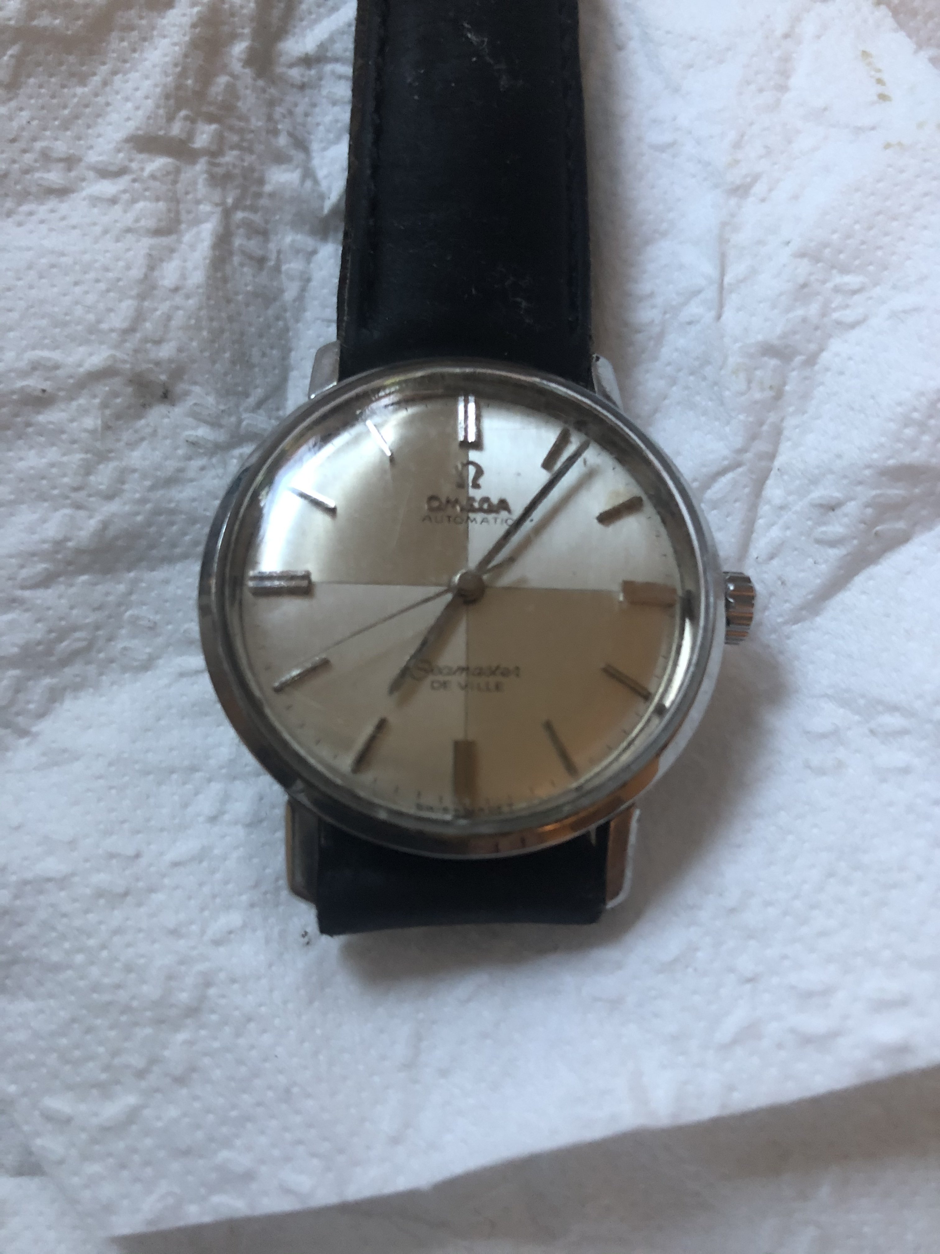 That's a good all-original watch with a scarce and desirable dial variant in apparently pretty decent condition. I think I detect a stain around 2 o'clock but it's still very acceptable and wearable. A regular jeweller will have trouble opening it as this is a one-piece case which opens from the front, so it needs to be seen by a proper watchmaker. Date somewhere around 1963-67. The movement will be the automatic 552 calibre.
