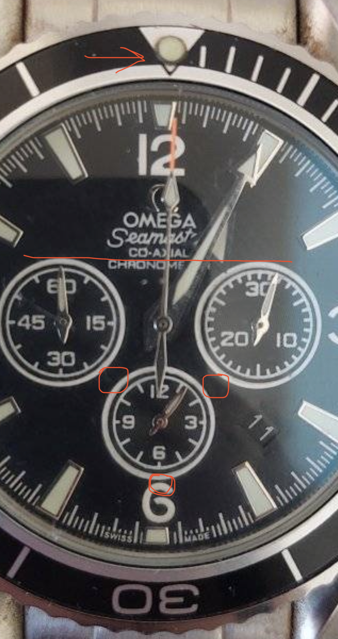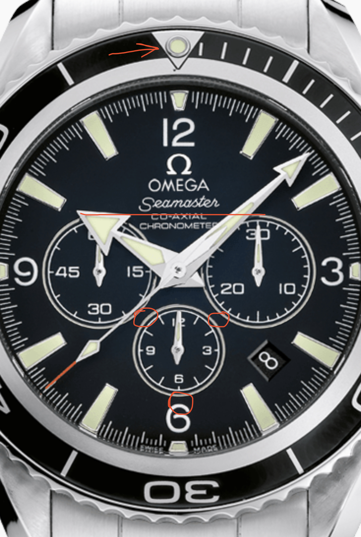 If you google images Omega planet ocean chronograph blue you'll see that there's none that has a date at 4 and subdial at 6.
