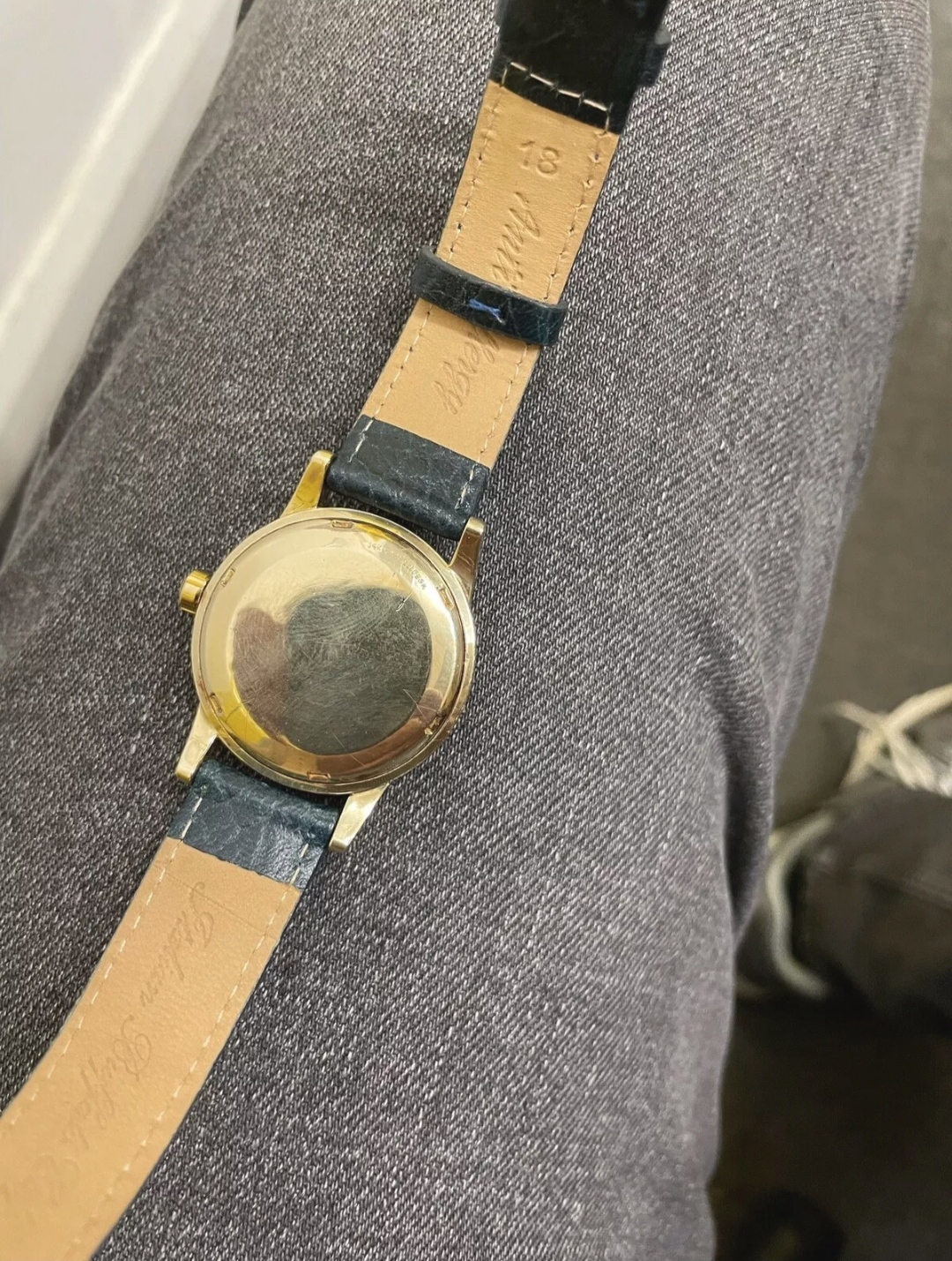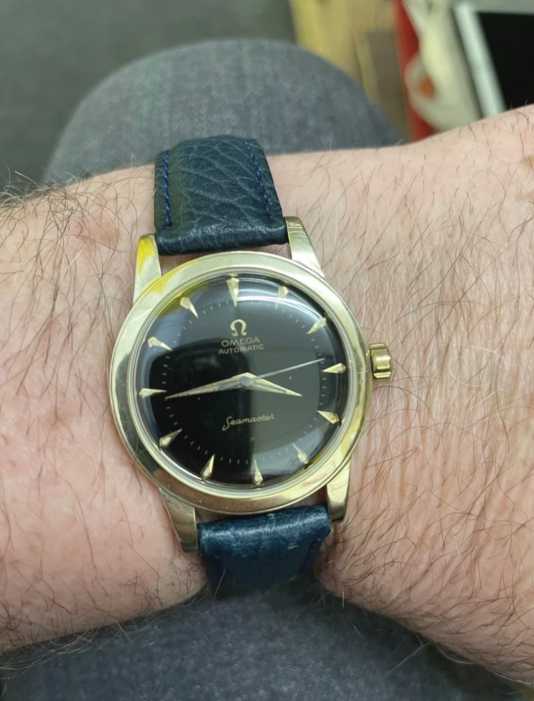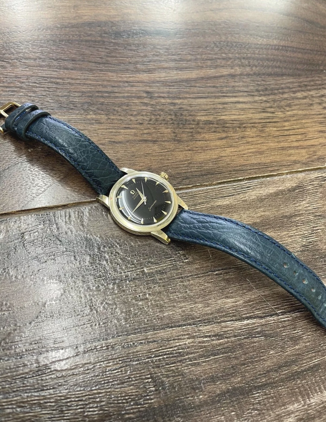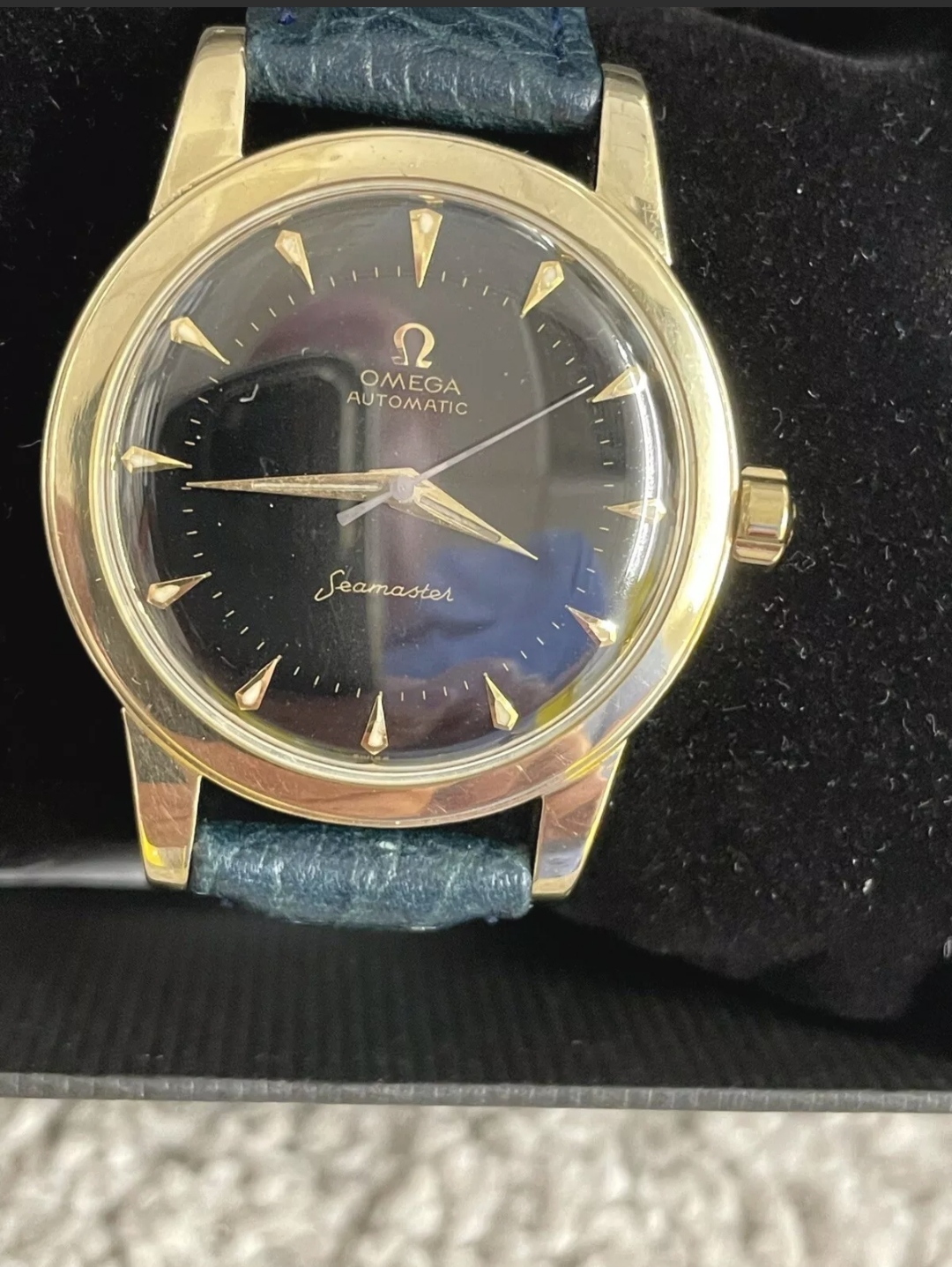 Beautiful Omega Seamaster Bumper Automatic with signed Dial Crown and Movement.Calibre 354 case has been ultrasonically cleaned,winds runs and sets well.Serial number 13784525 which places manufacture to 1952.Measures 43.3x 34.6 case is 14 k gold filled dial has been beautifully restored to gloss black with applied gold Omega.The hour minute and second hands are in good order.Guaranteed genuine Omega.