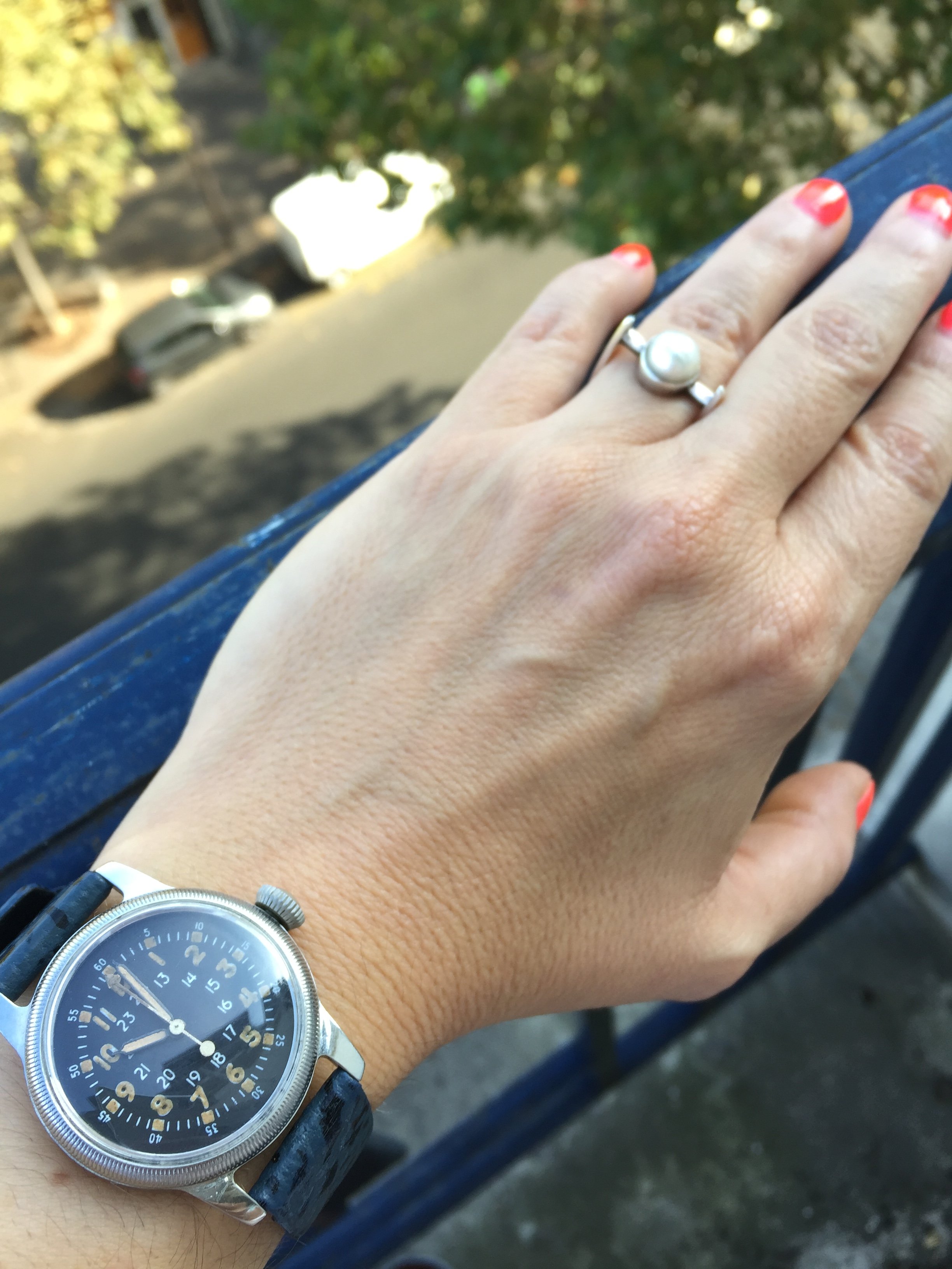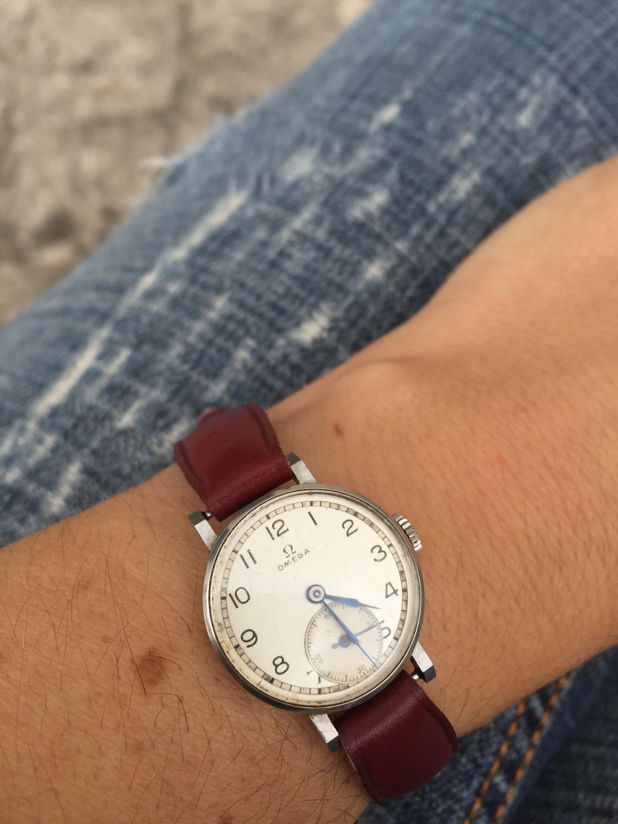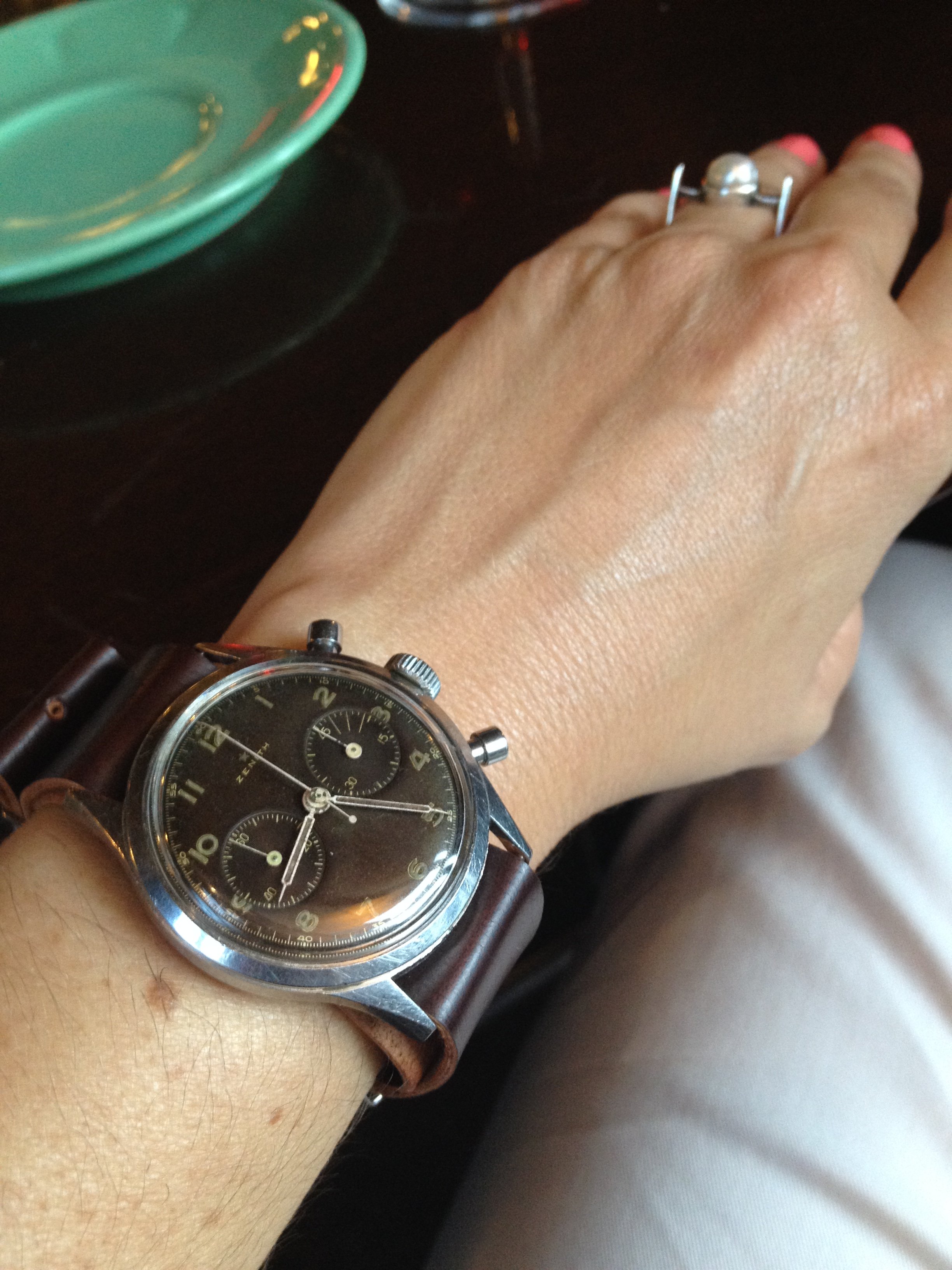 ·The Deville you are looking at would wear the same as the ‘58 Seamaster in the first pic- Hannah has a 5.5”’wrist- teeny, always have to buy short length straps for men’s watches and she’s within the last 2 holes on ladies straps. Caution if buying men’s watches with bracelets- you usually can’t get enough links out to get them that small- although the Rolex bracelets do go down that small...pitty-huh 😉
