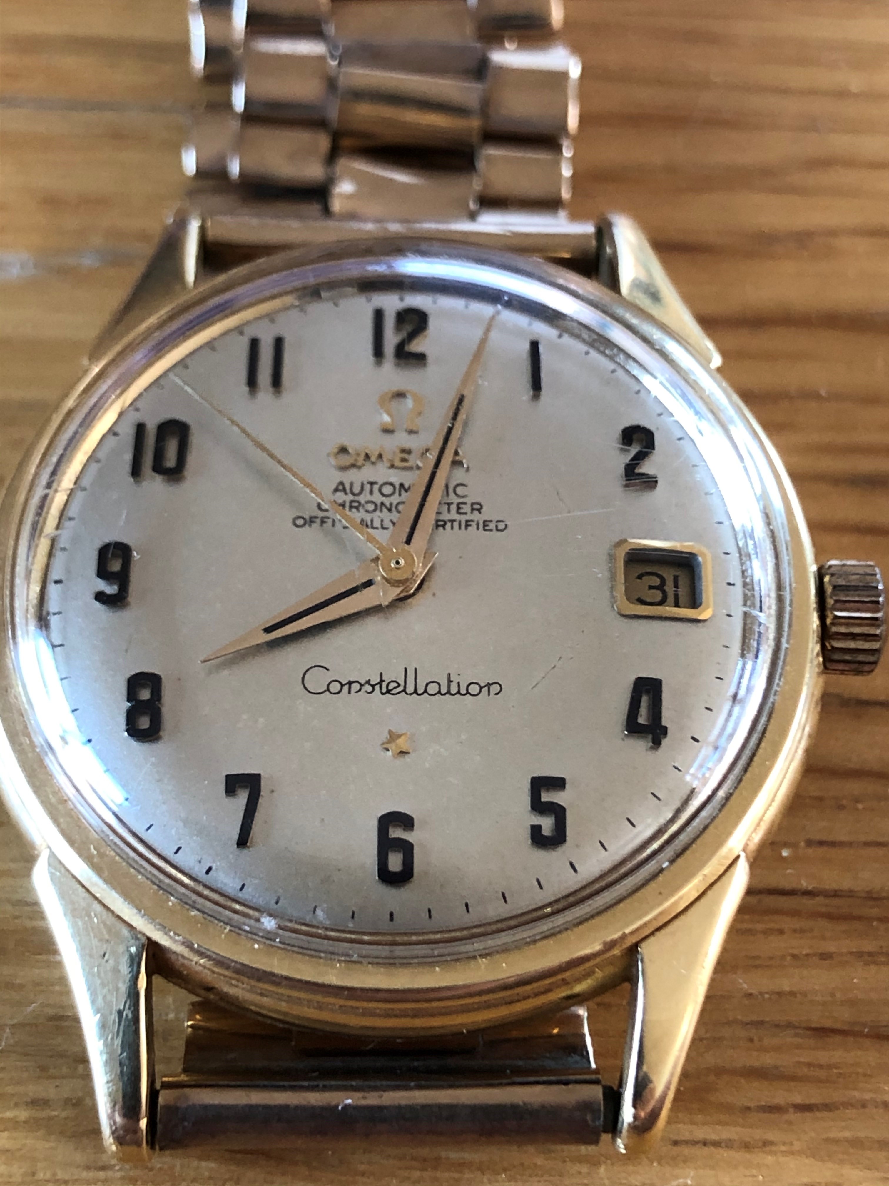 ·My elderly Dad bought this watch about 20 years ago from an antique dealer as an investment. Sadly with no papers or any other information. The strap is clearly not original but he's nearly 80 now and has asked me to try and value it. I am not brave enough to open it up as I've seen suggested by many on the forum but I have searched for pictures on line to try to narrow the field. The mystery seems to be that none of the Constellations I've been able to find have a complete set of actual numbers for the hours on the dial.... I thinks its a solid gold case but I'm beginning to suspect its provenance. I will take it to a watch specialist to open it up and better identify if the feedback looks positive. Any help would be gratefully received. Best Regards. Mike