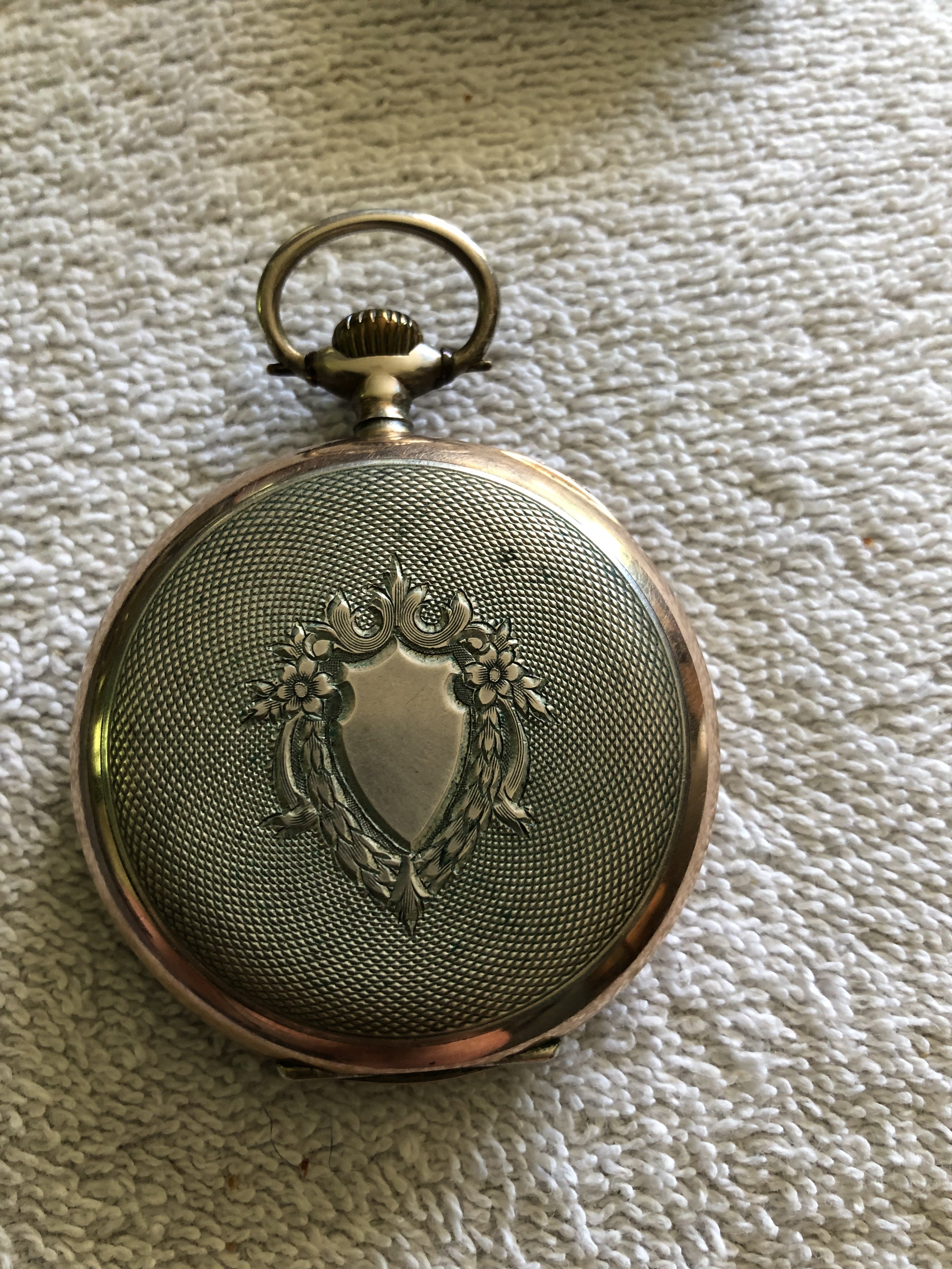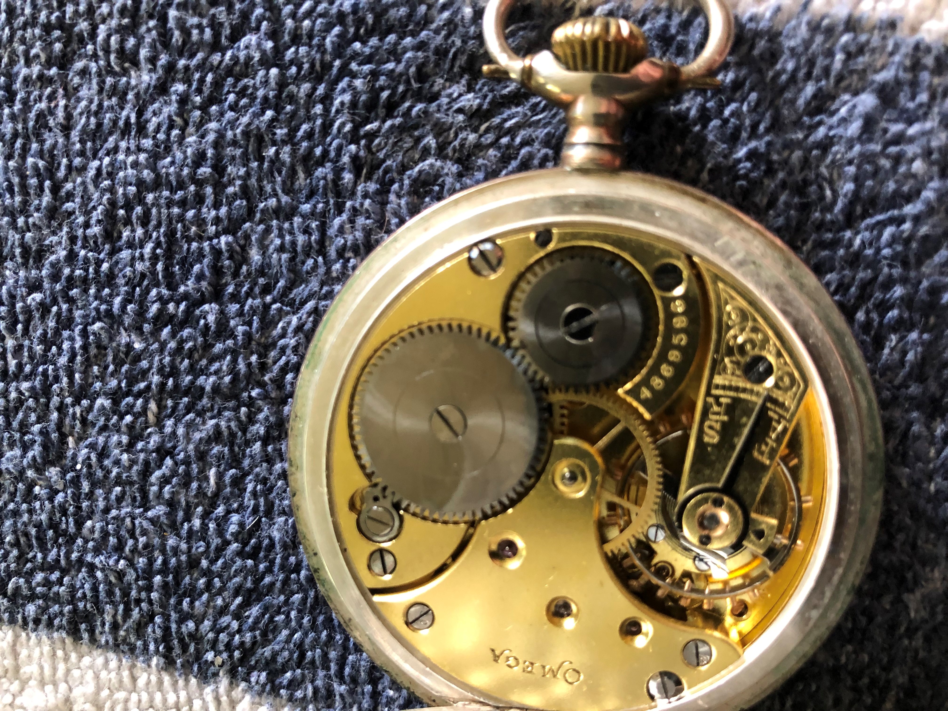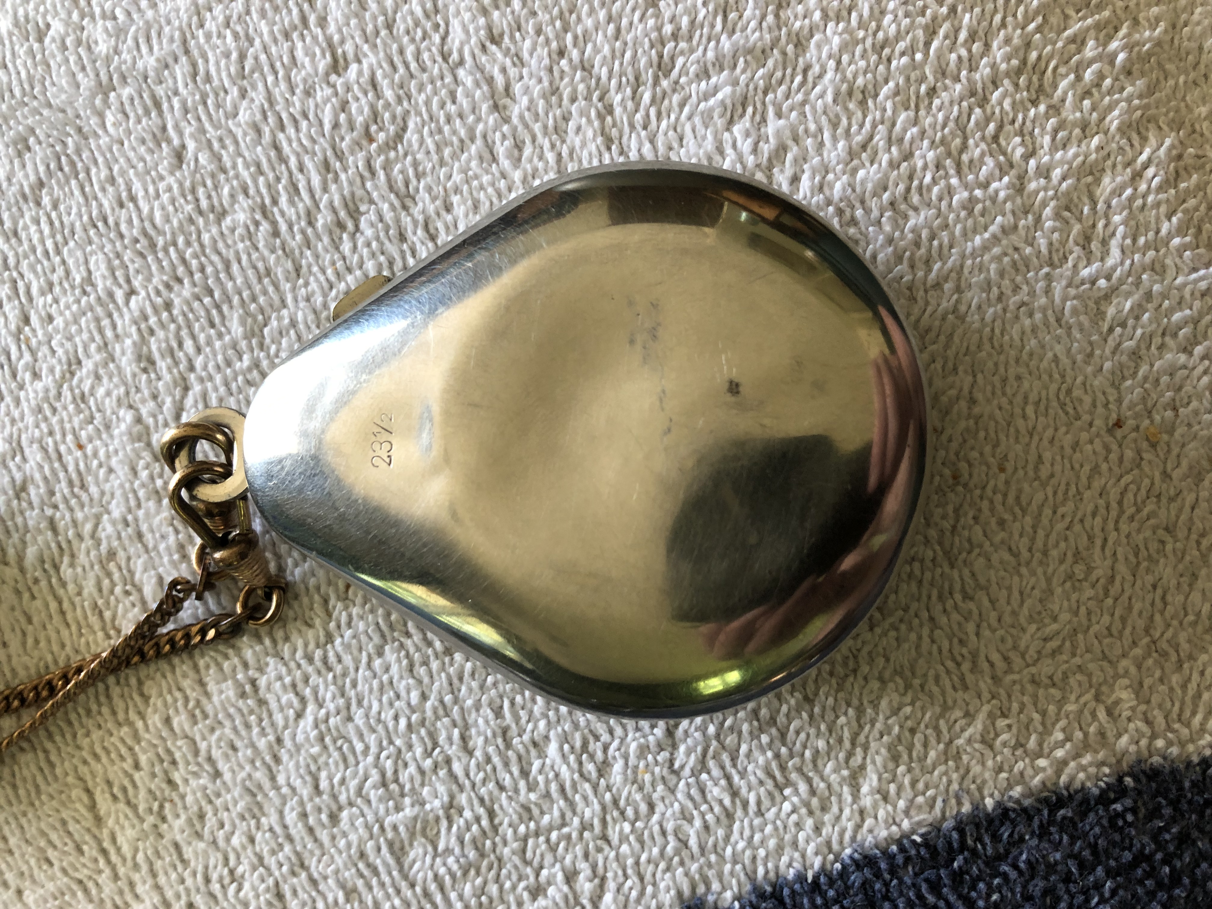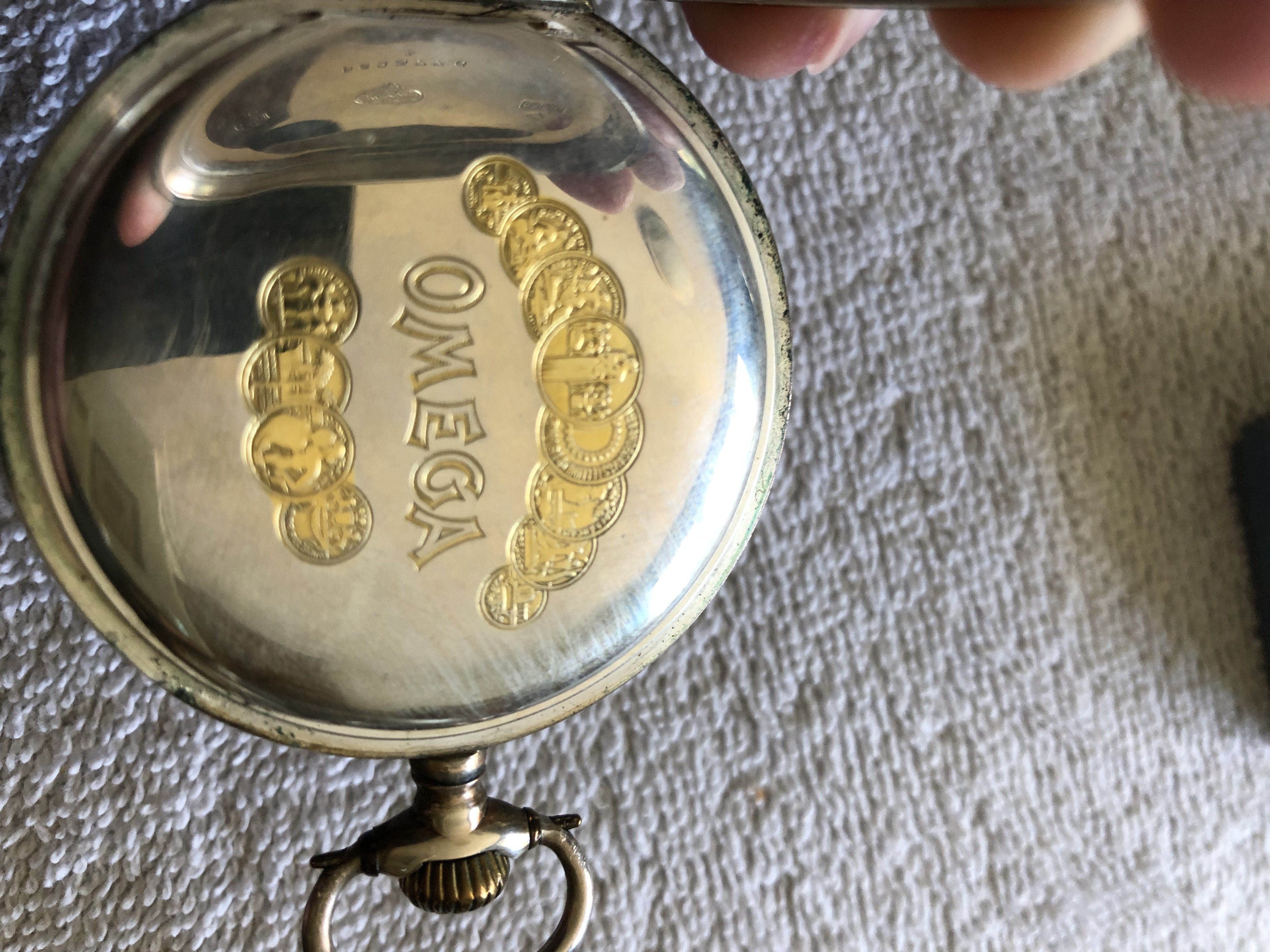The first is a pocket watch with a sliver case with some copper and gold plating. It is in a teardrop shaped stainless steel case with a window which you can see the face through - 23 1/2 is stamped on the case back. There are three stamps inside a door covering the back of the case - one Omega, one to indicate .800 purity of the metal and the third which I cannot make out. The serial number is also stamped in the door - 5623776 - with the number 3 underneath.