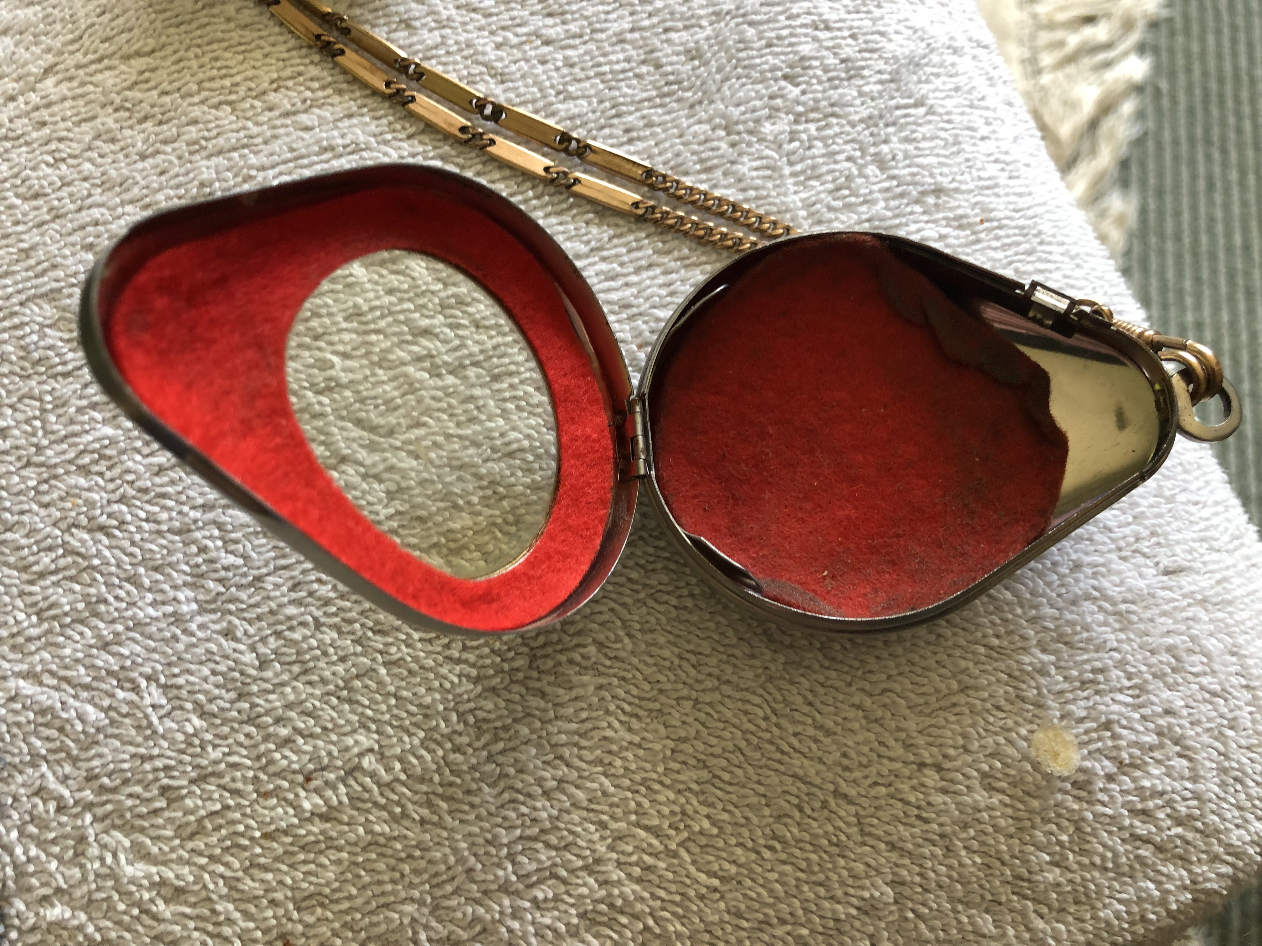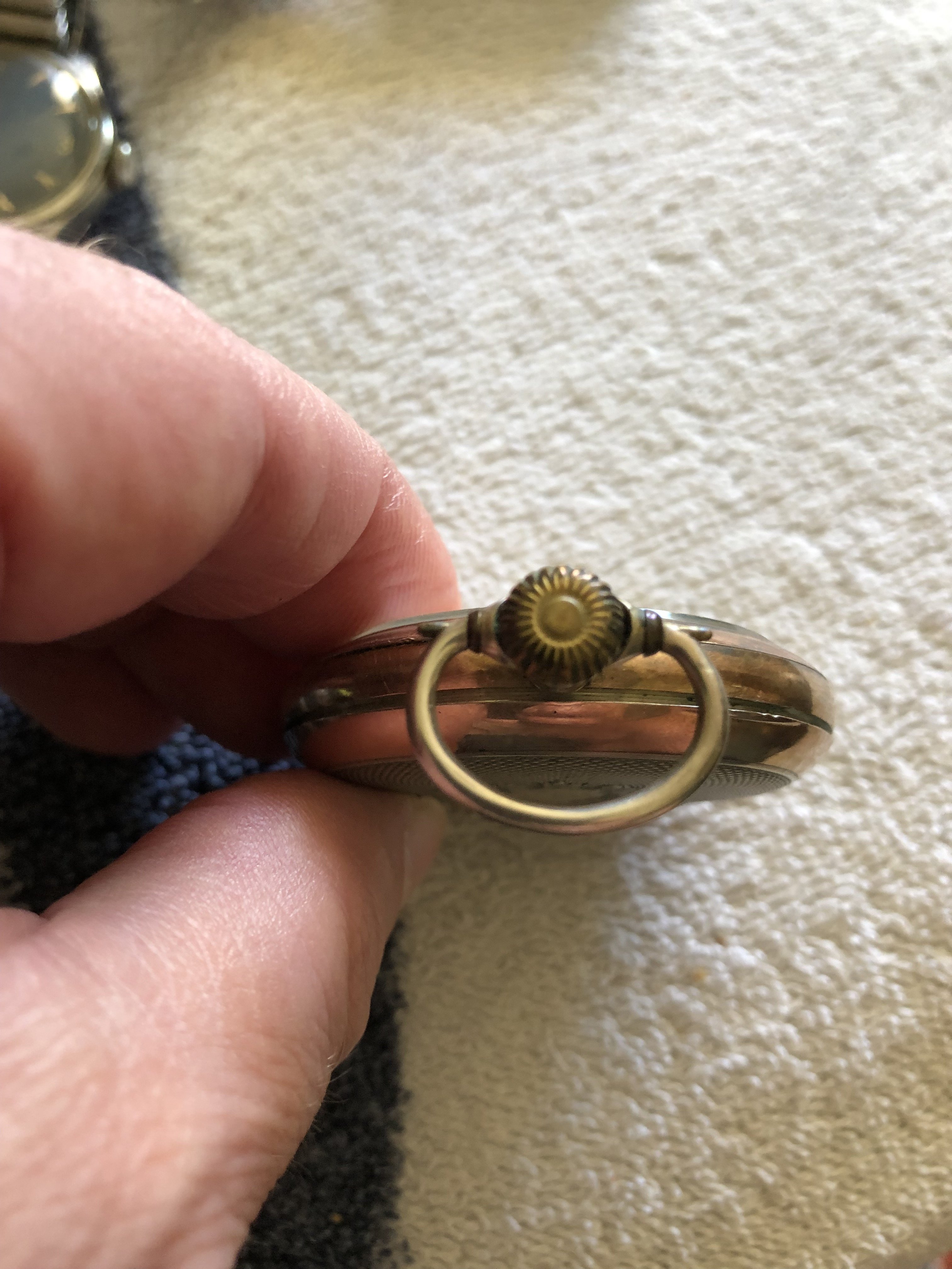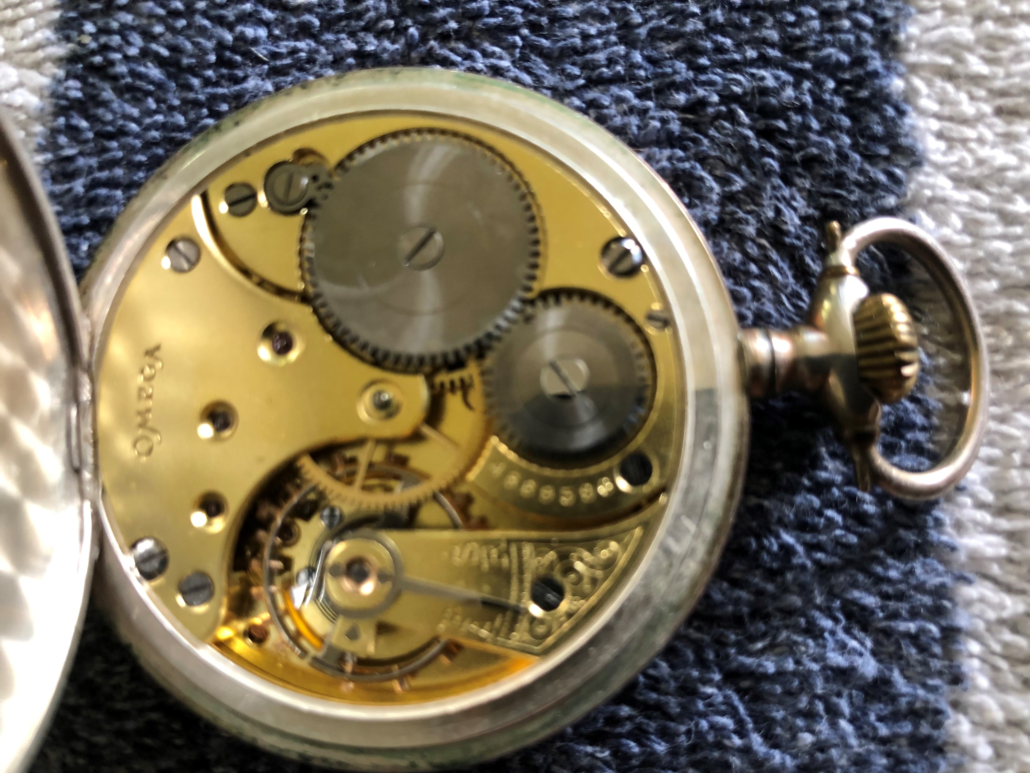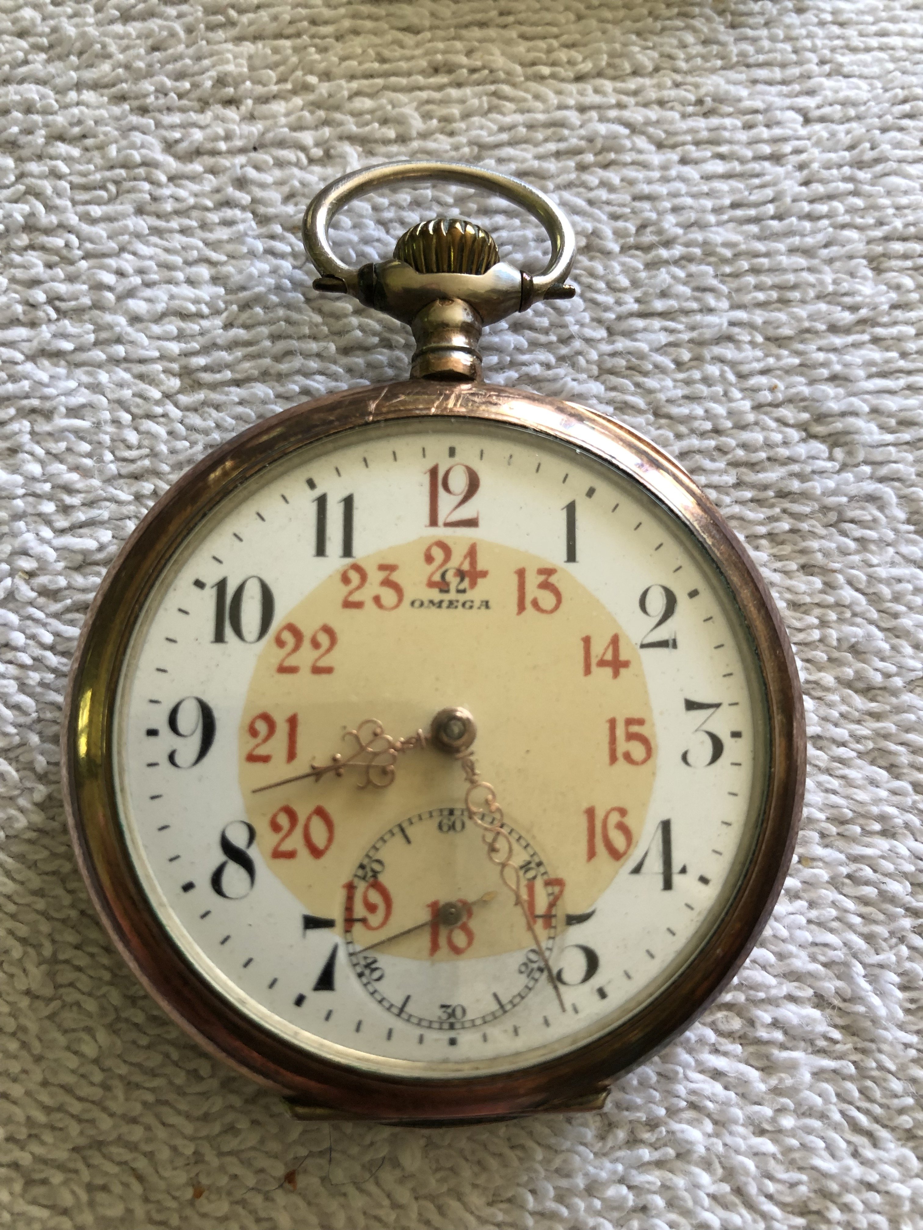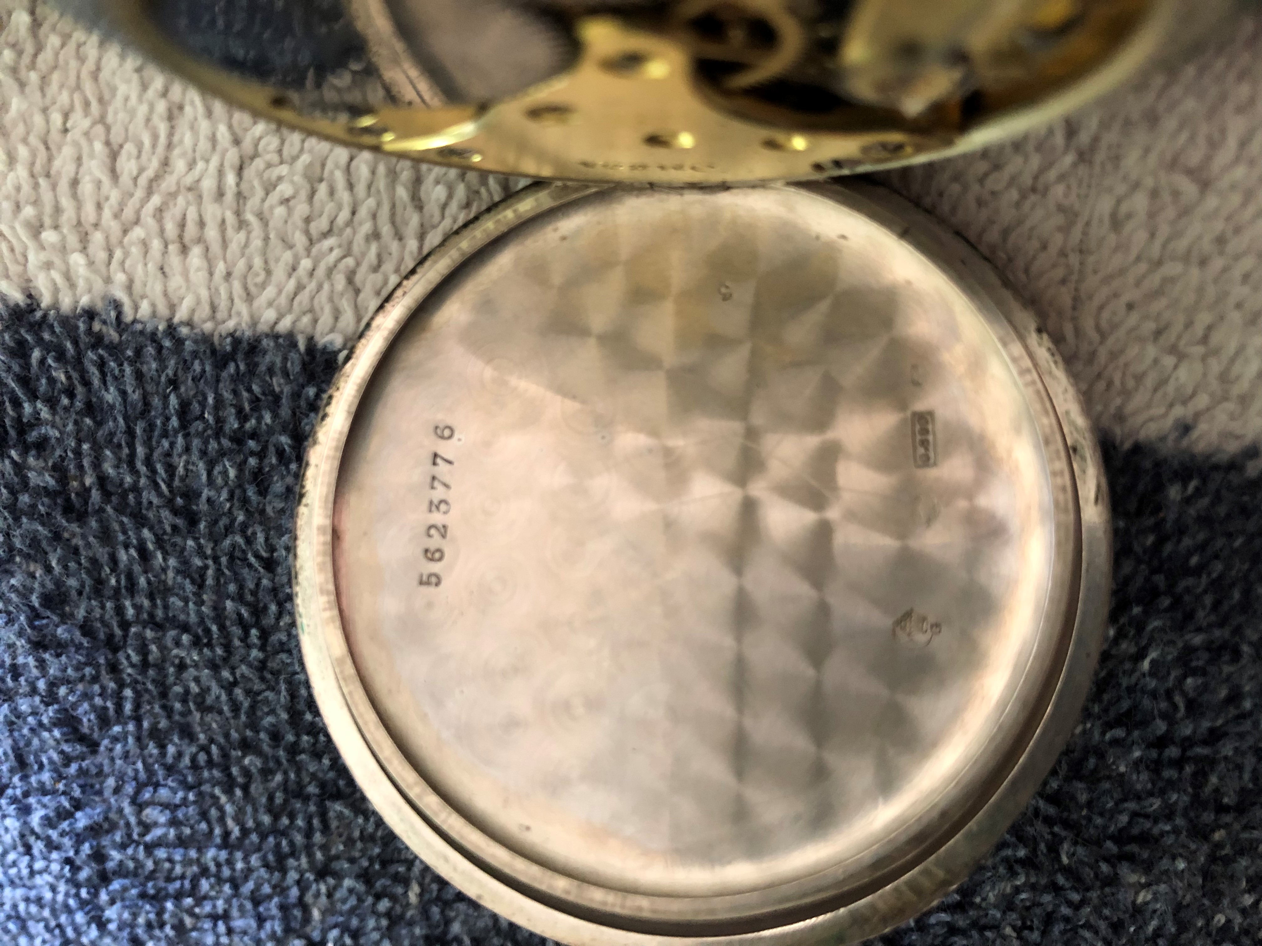 The first is a pocket watch with a sliver case with some copper and gold plating. It is in a teardrop shaped stainless steel case with a window which you can see the face through - 23 1/2 is stamped on the case back. There are three stamps inside a door covering the back of the case - one Omega, one to indicate .800 purity of the metal and the third which I cannot make out. The serial number is also stamped in the door - 5623776 - with the number 3 underneath.