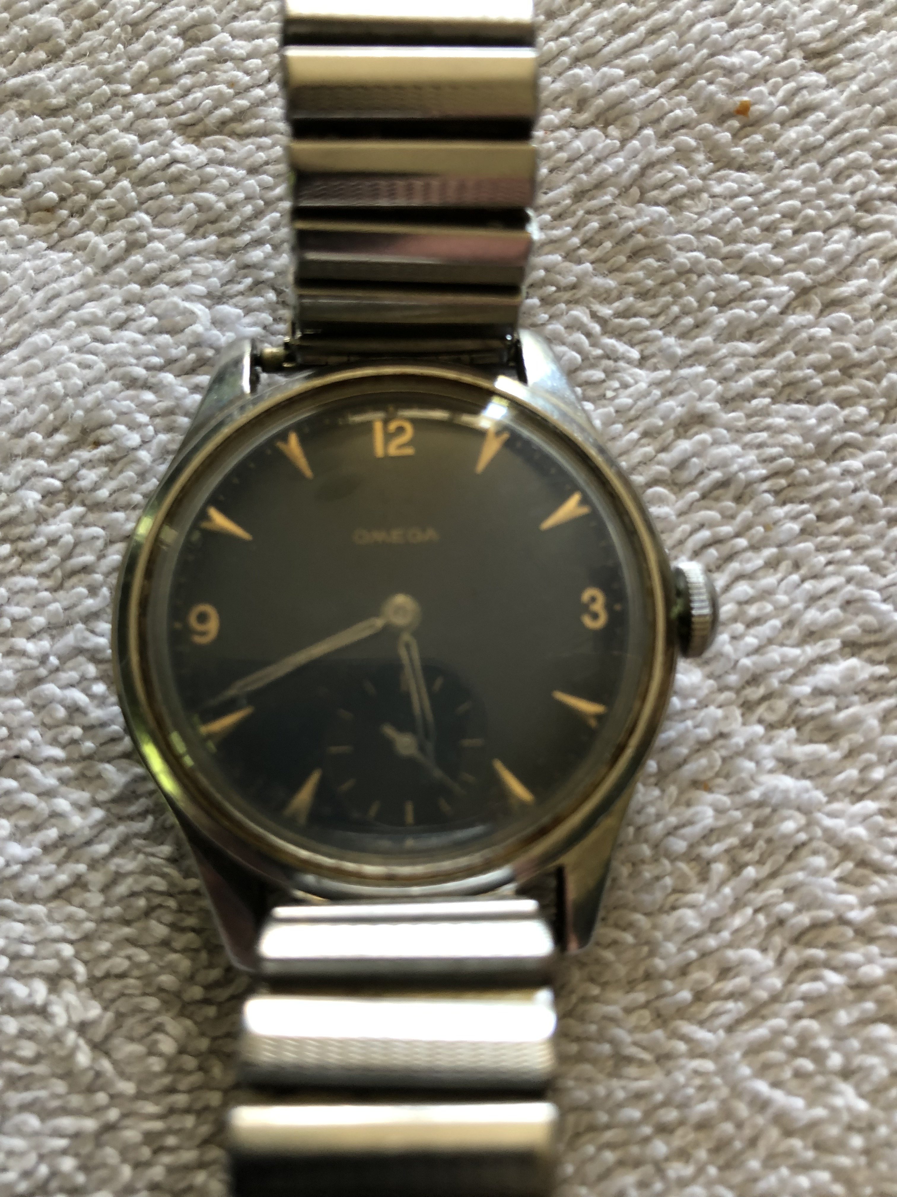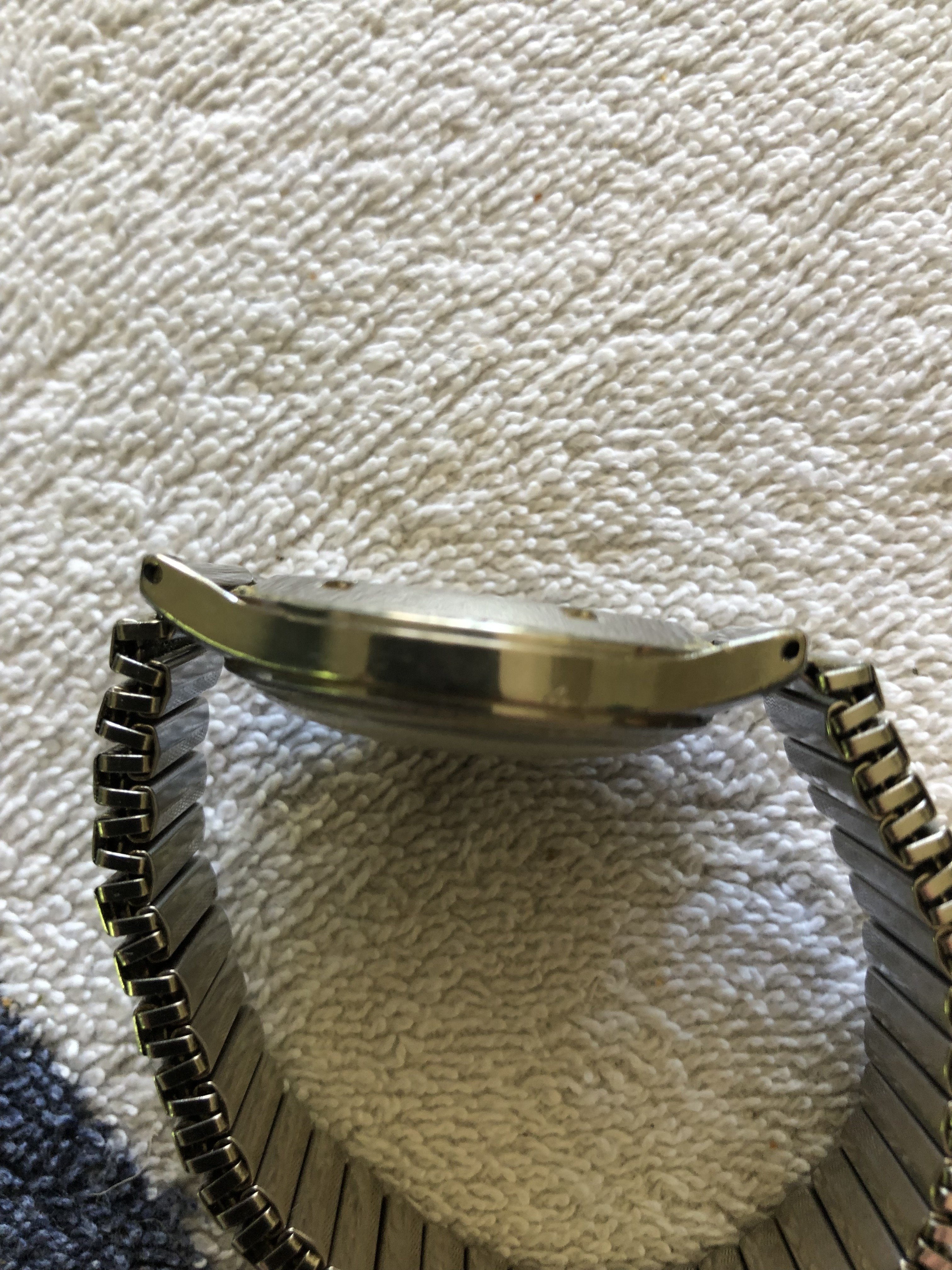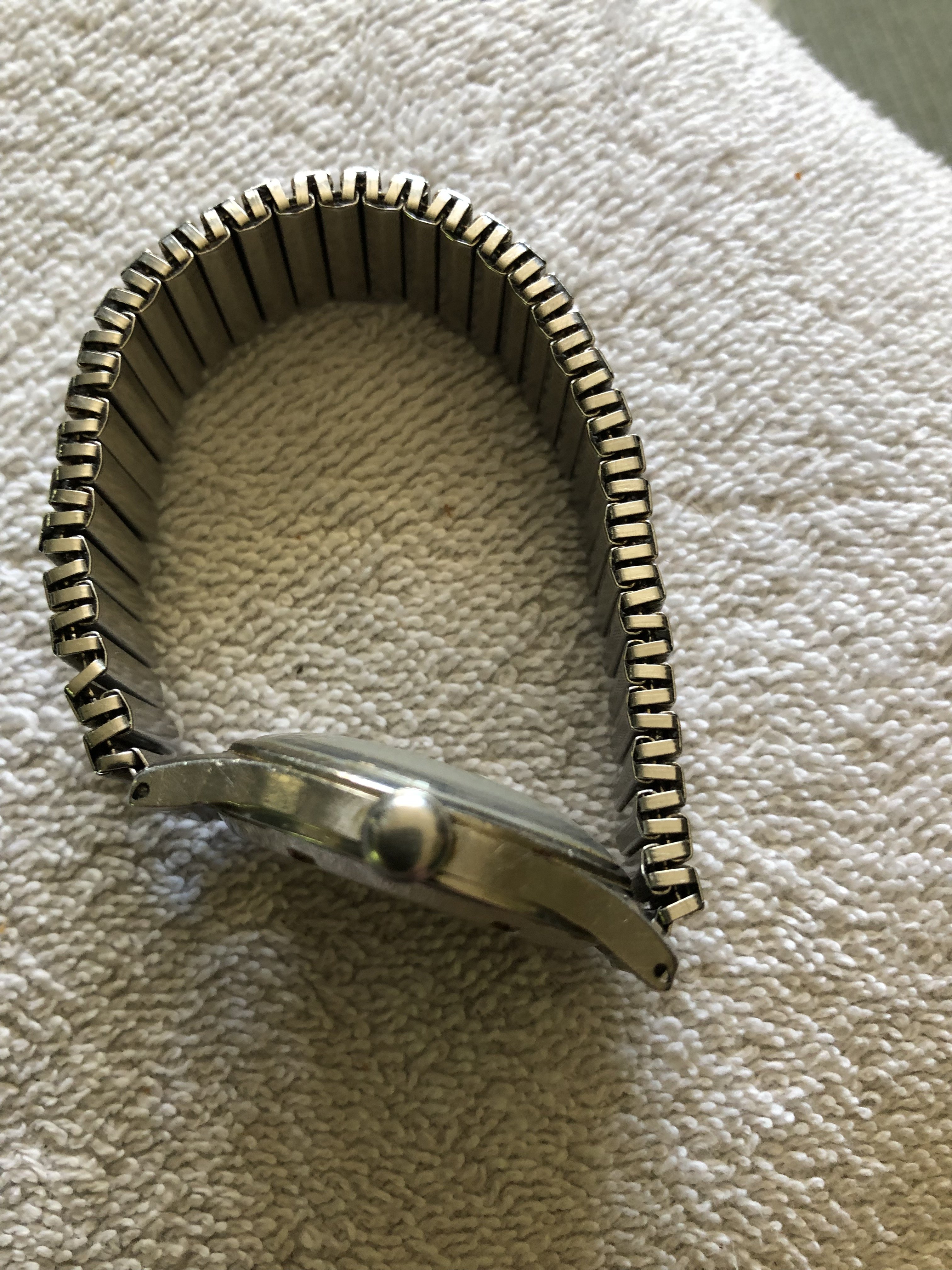The second watch is a wrist watch with the primary feature being the lack of a Ω symbol on the face, only the Omega name. It has a stainless case and what I think is the original band. The band has "FIXOFLEX" stamped on the links but not Omega.