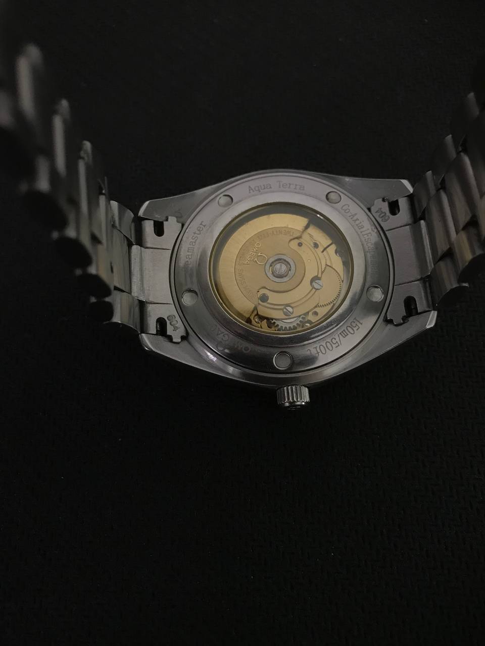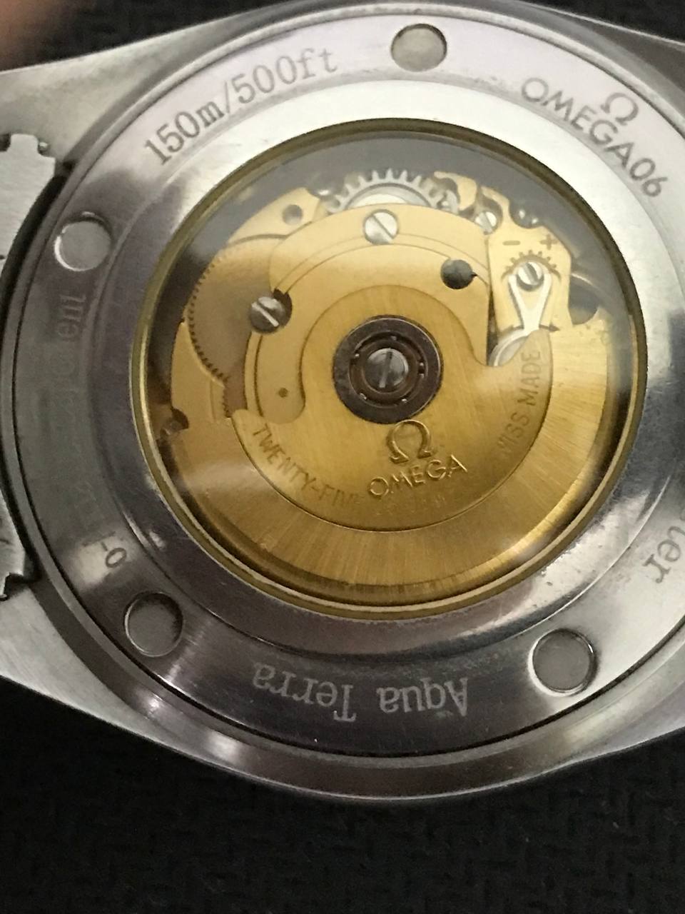 -On the back edge of the glass read in a circle, there are words like OMEGA06 Seamaster Aqua Terra Co-AxialEscapment 150m/500ft