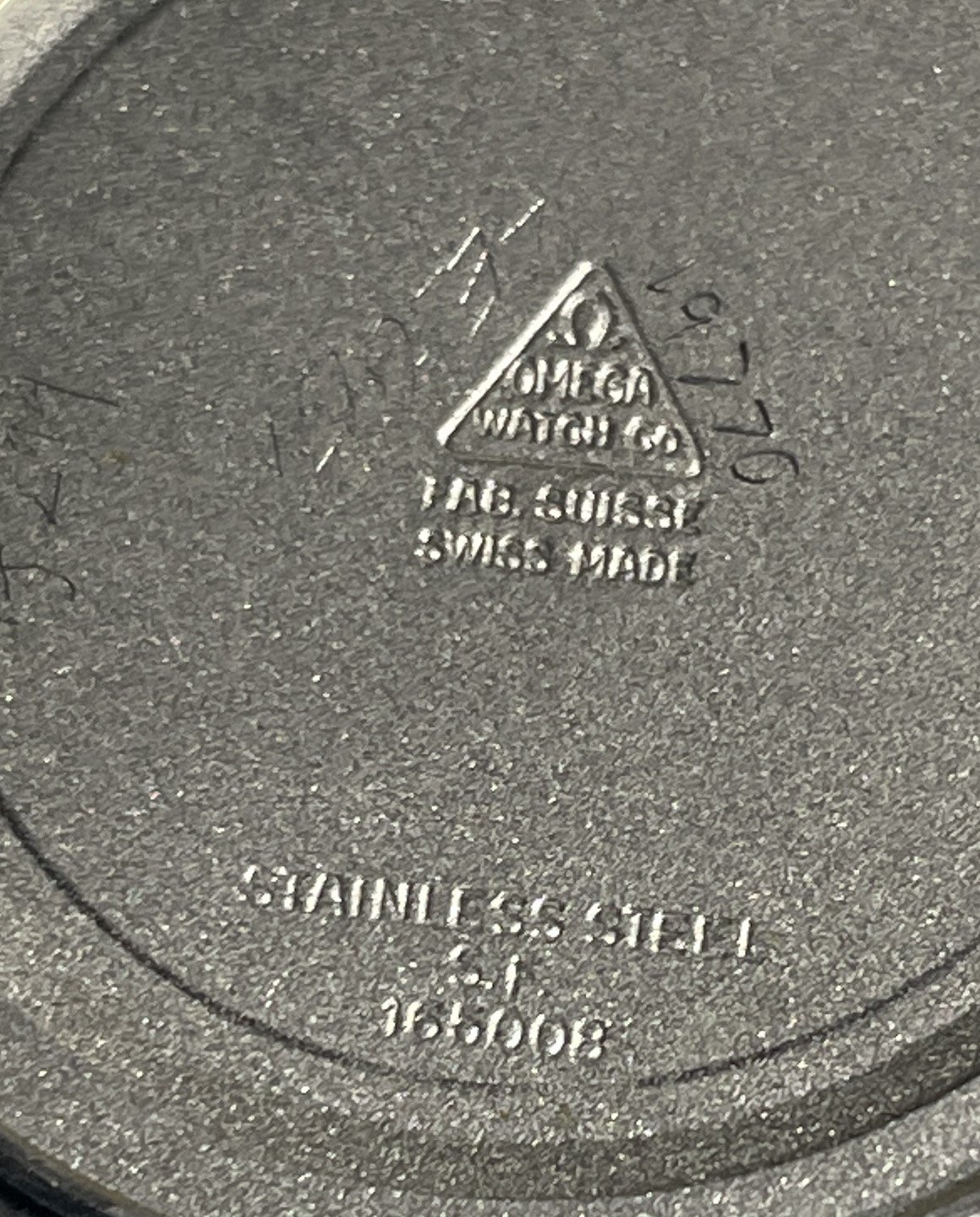 on the back is seamaster in italics with omega and the logo in a triangle.then 18K and 0750.