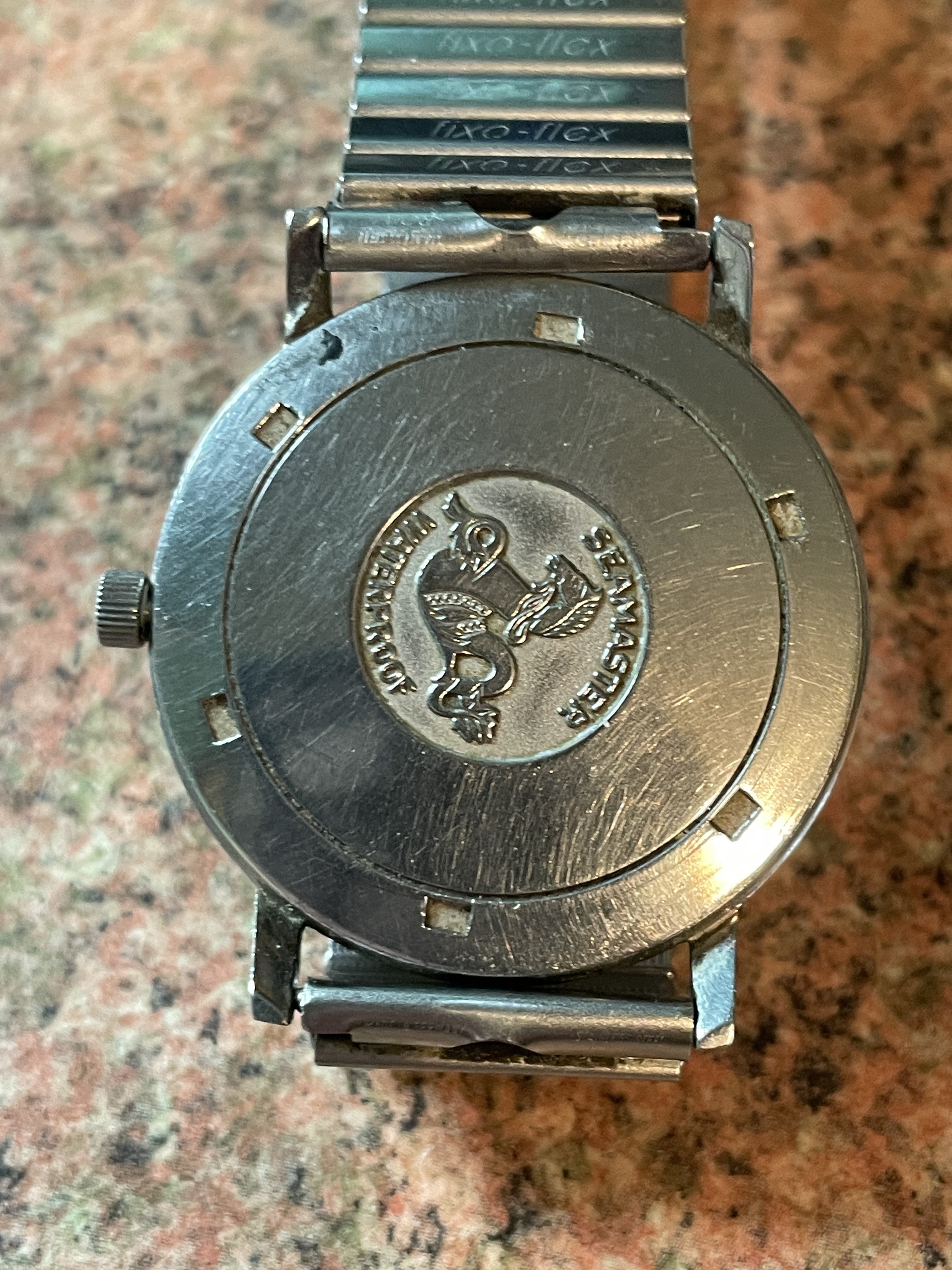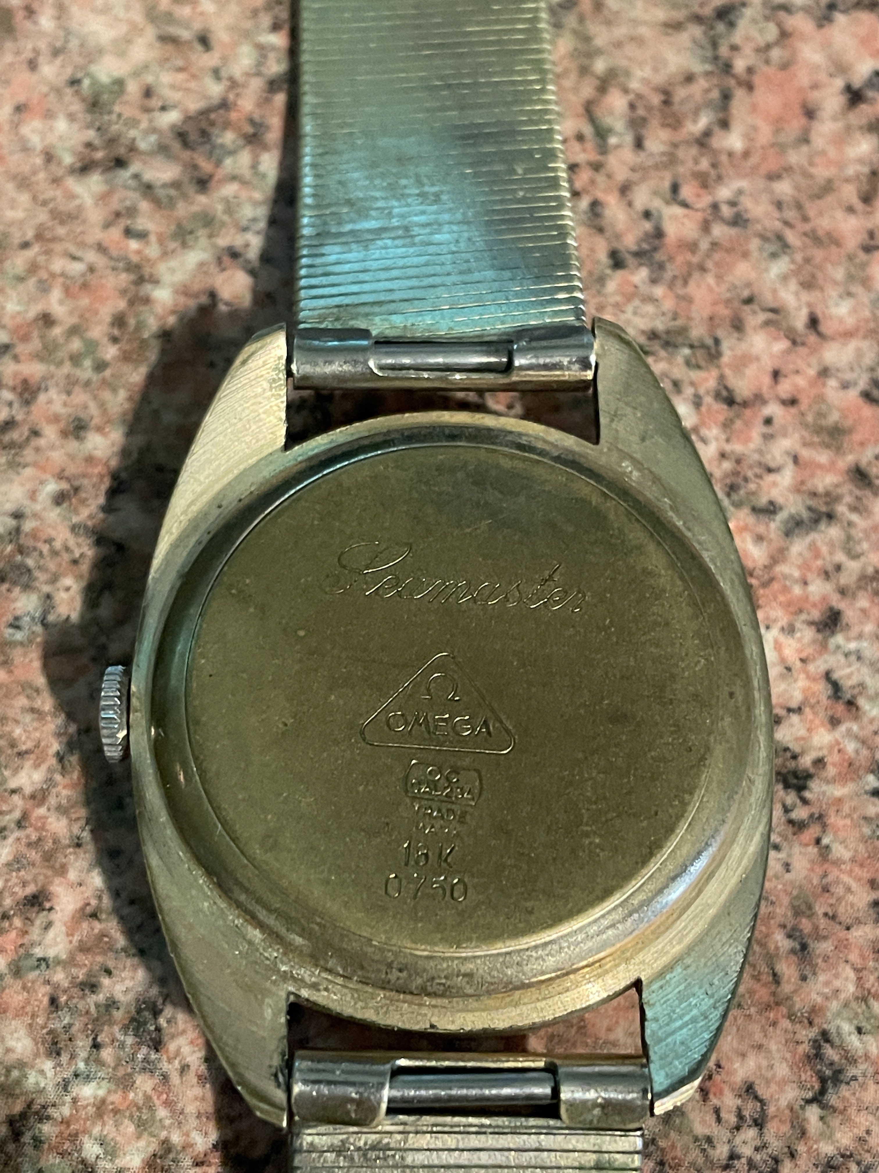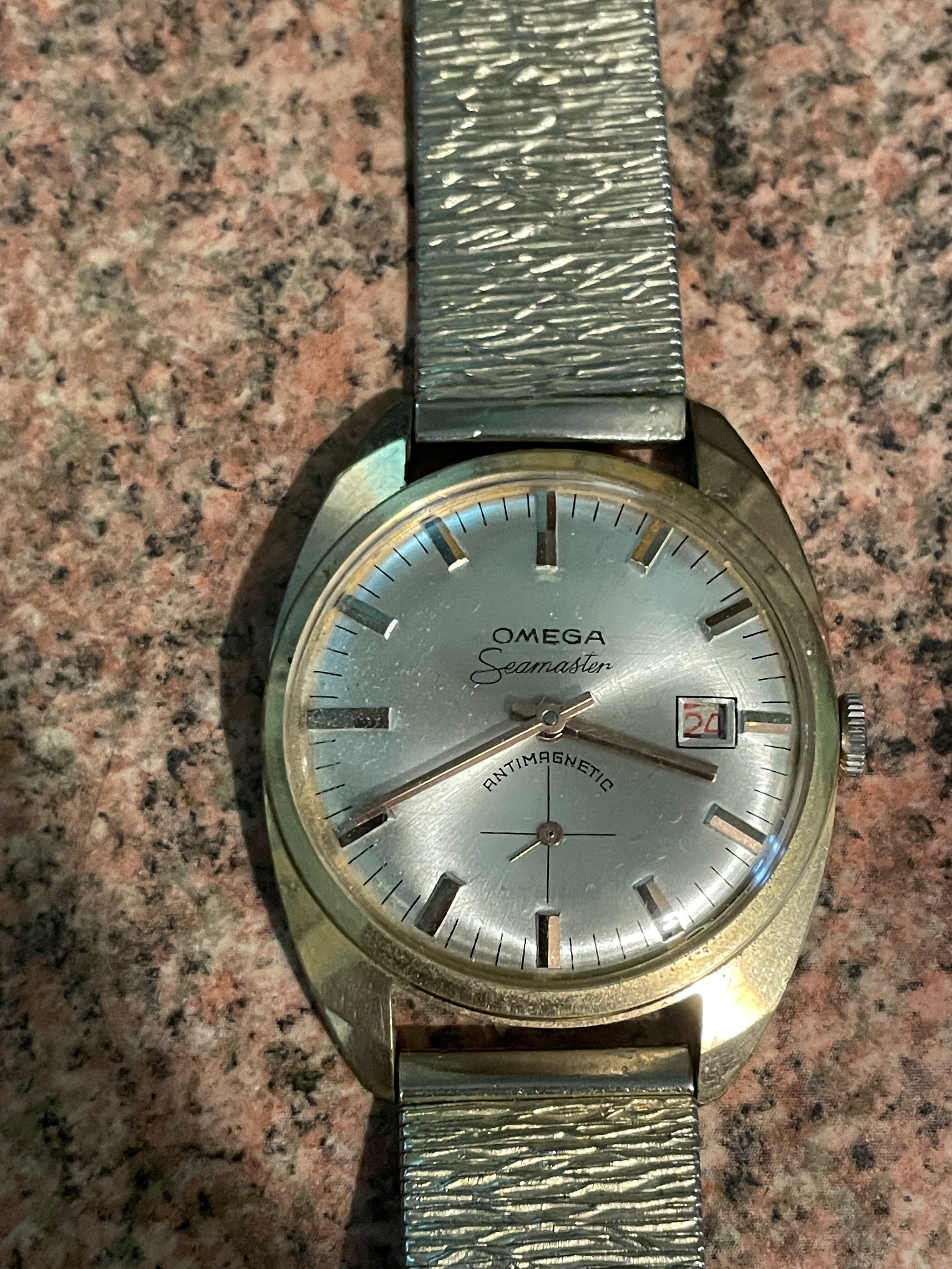 and a gold Qmega with seamasteron the dial and a date at 3oclock a small second hand at the bottom and antimagnetic.