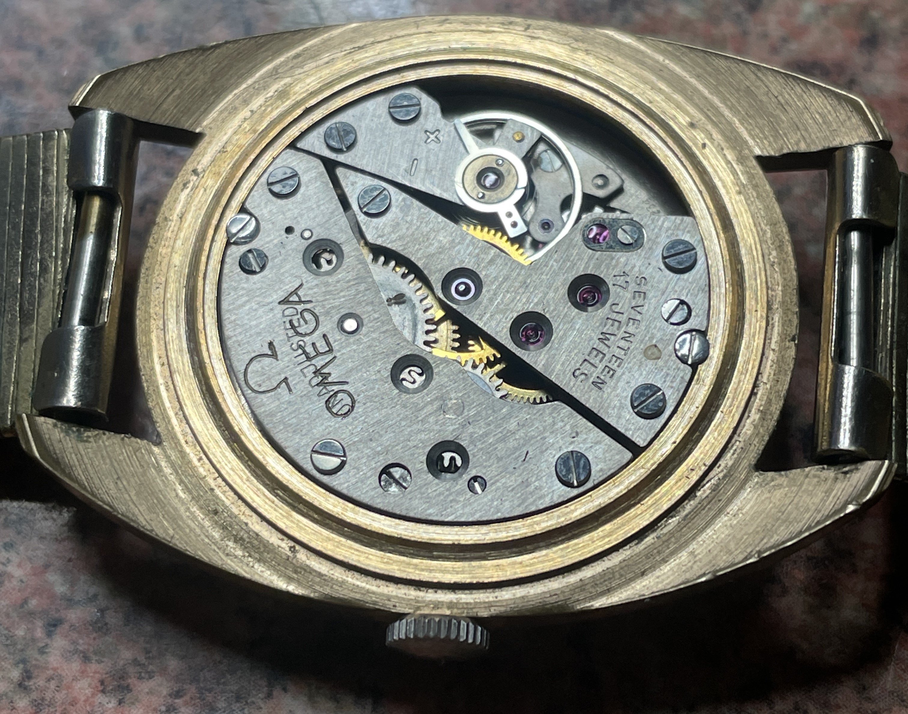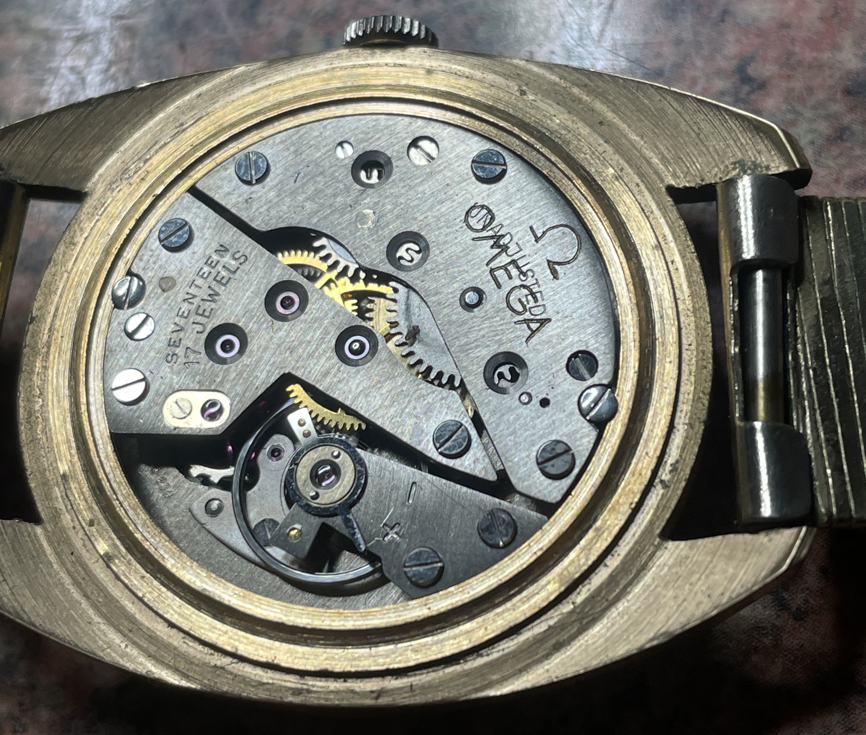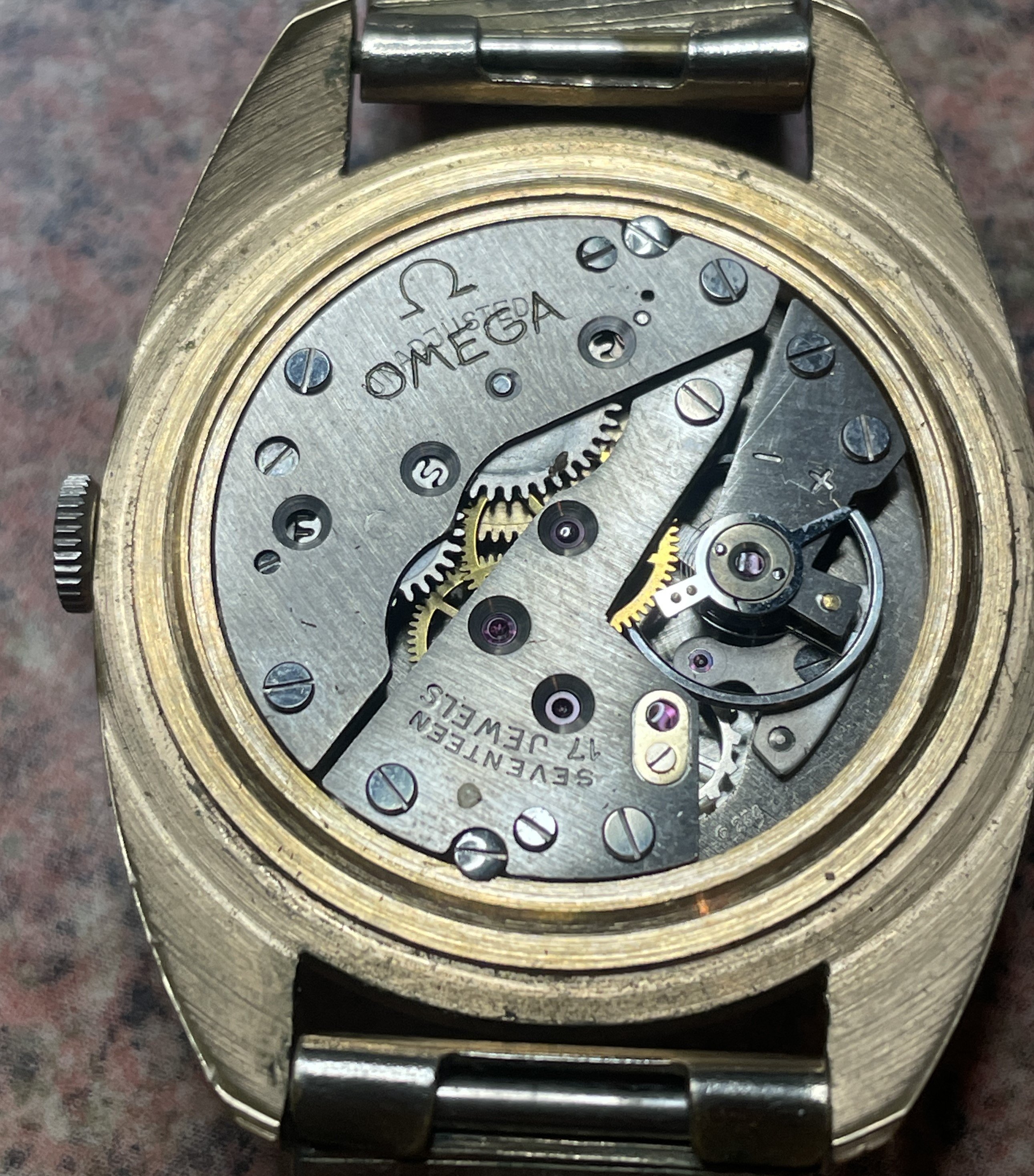 and a gold Qmega with seamasteron the dial and a date at 3oclock a small second hand at the bottom and antimagnetic.