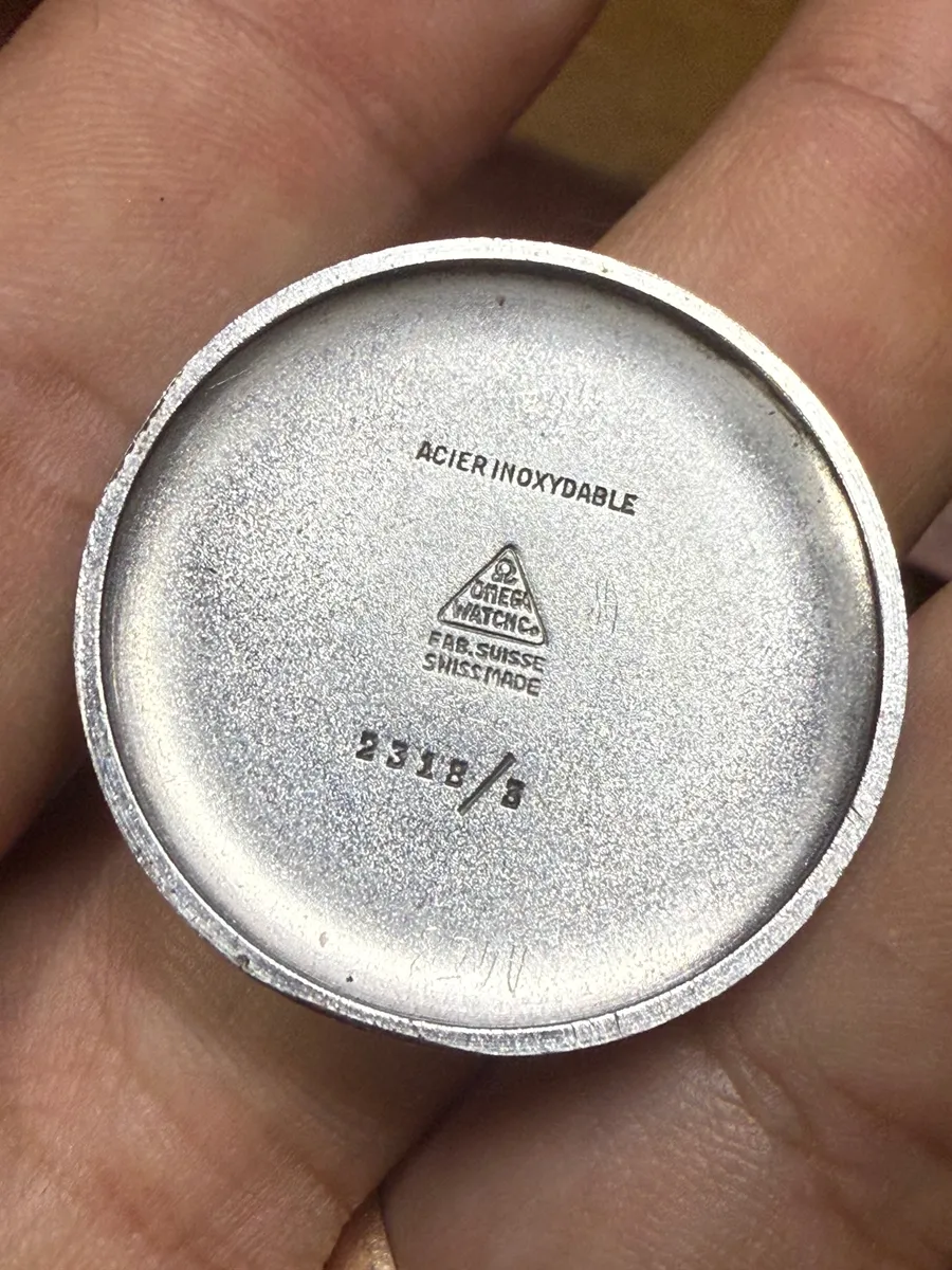 Is an Omega 2318/8 that looks as a Dirty 12 but not completely. Those watches are mostly around SN 10.XXX.XXX and this one is 9.XXX.XXX. There are no markings on the rear cap. The arrow head on the dial is present.