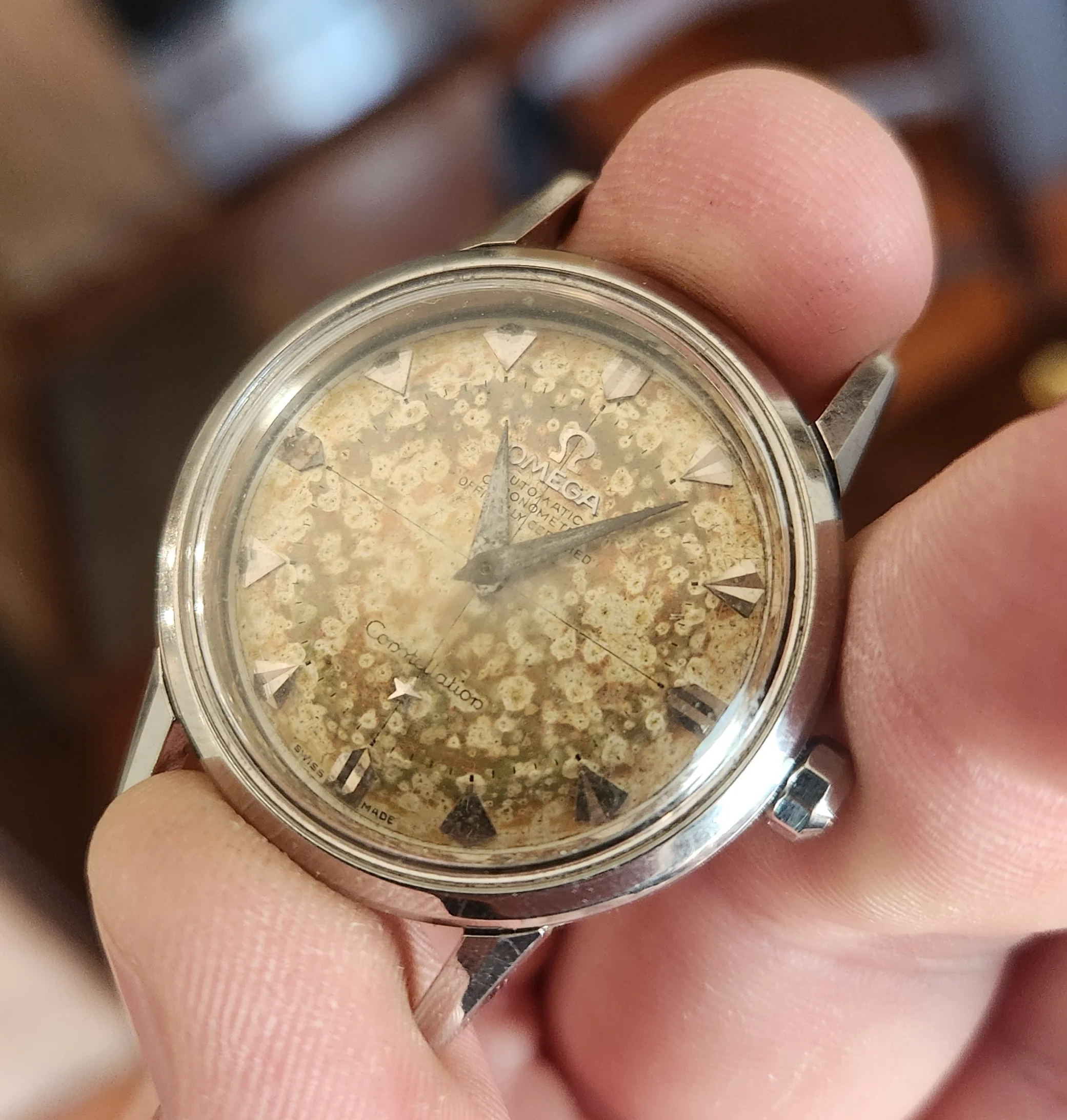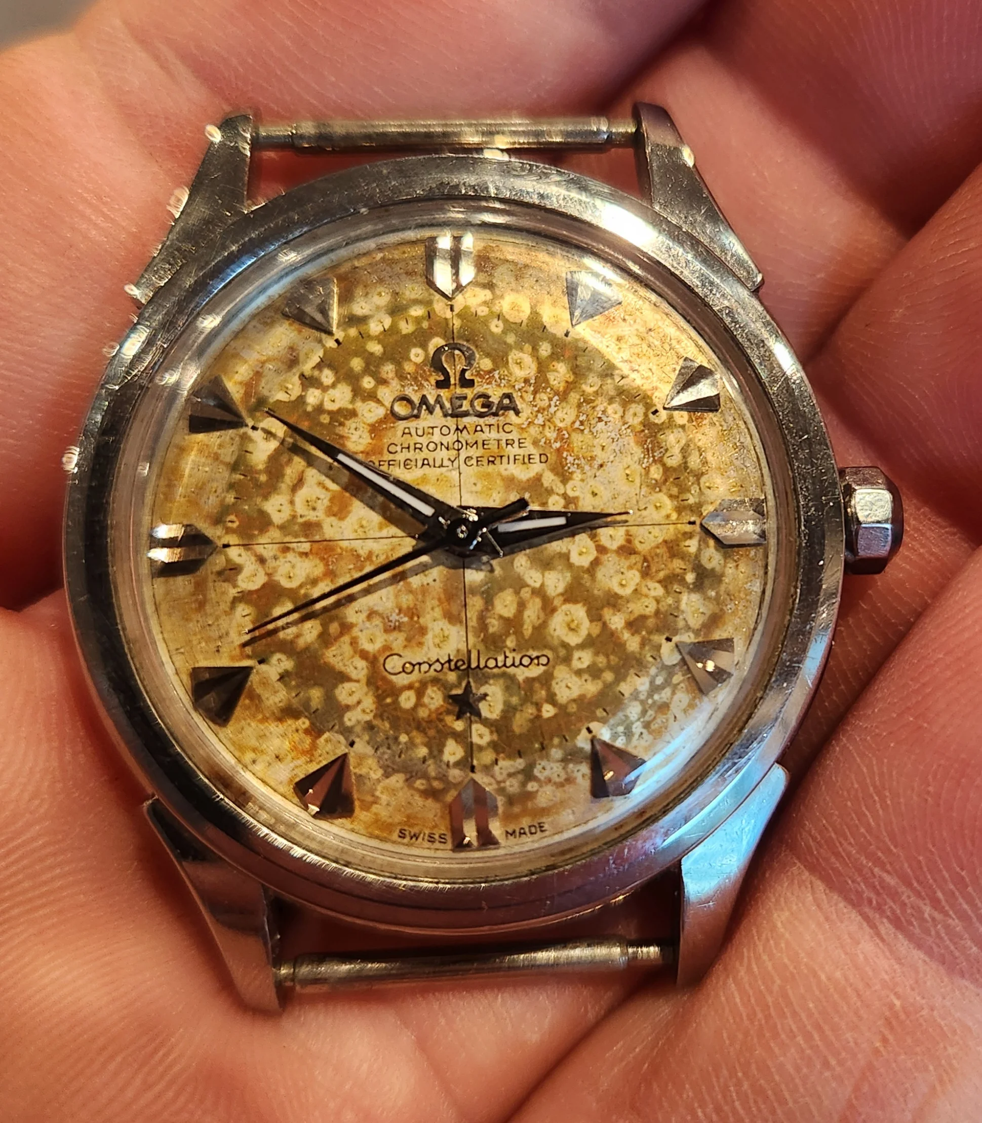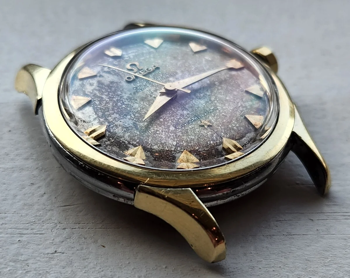 路Good afternoon, I picked up a couple constellations this morning. Both need service and have mottled dials from moisture, but one needs a caseback and I'm not familiar with the reference. I know you all can help.