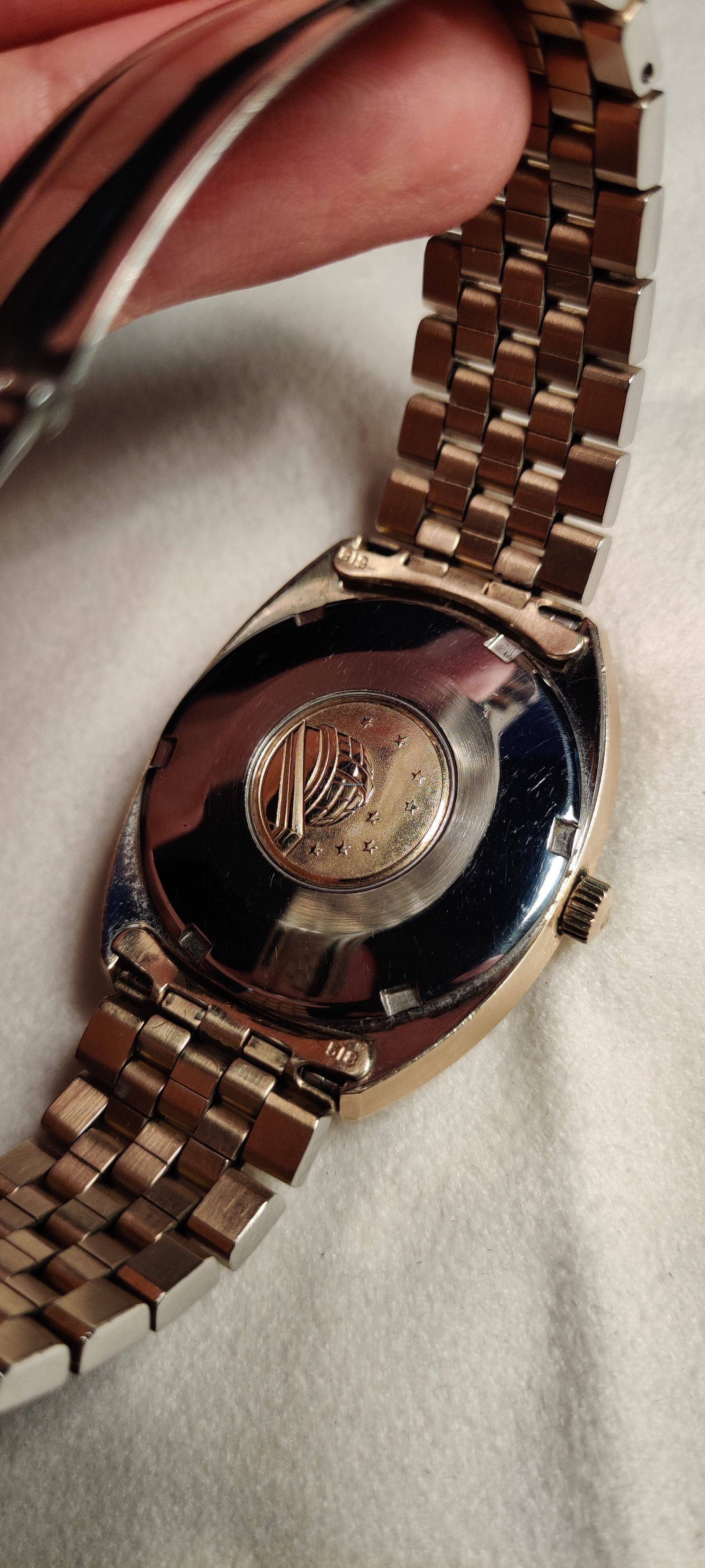 Case is gold capped 18k, bracelet gold plated 20 microns 18kt and full gold 14kt bezel.”