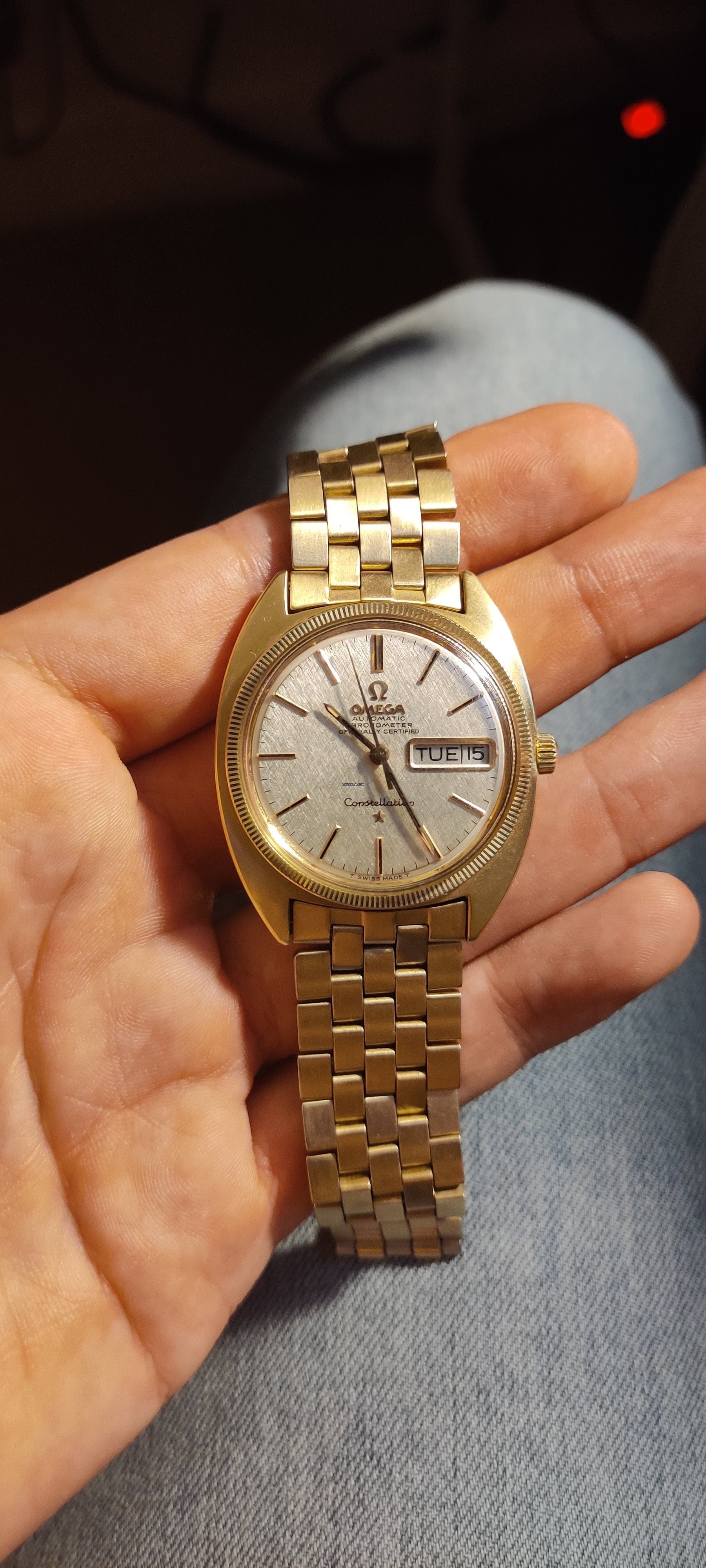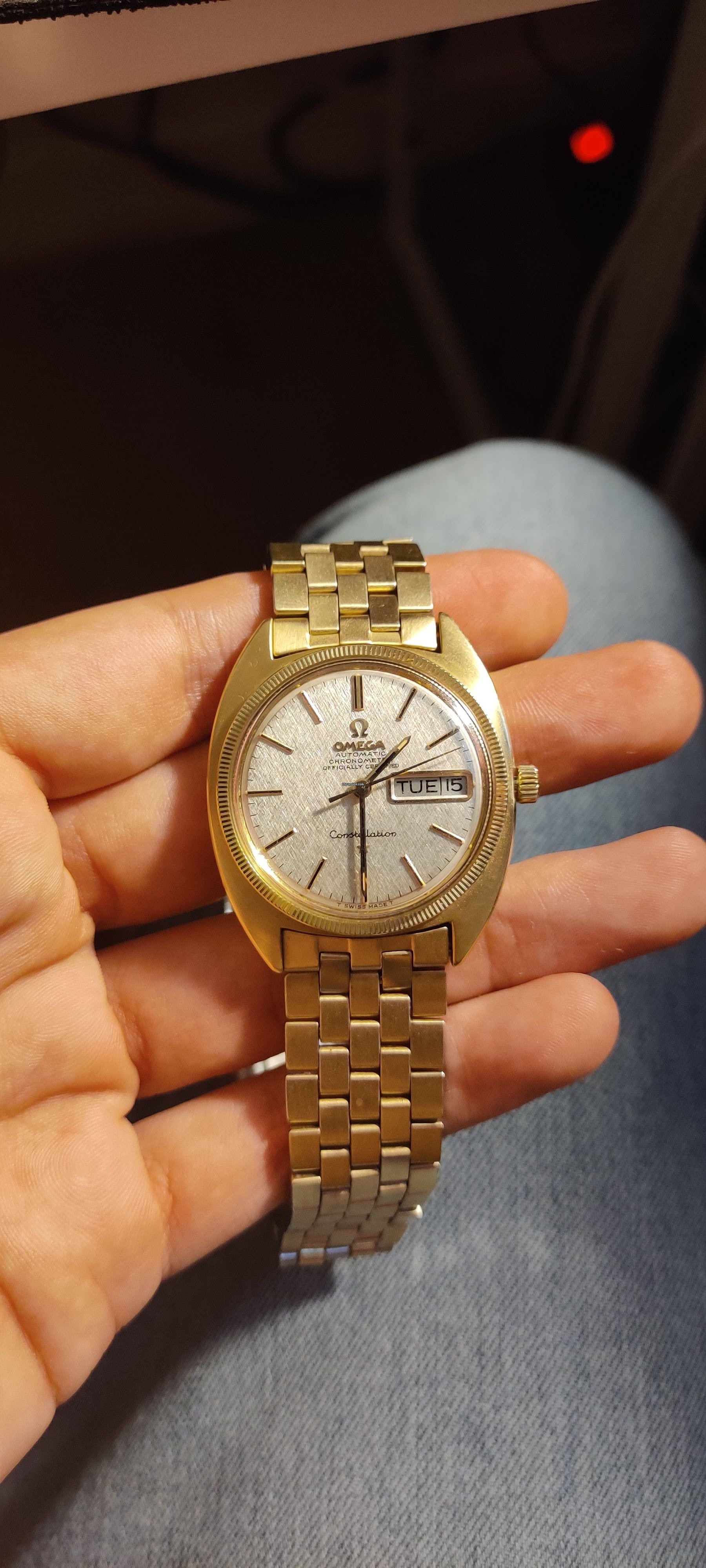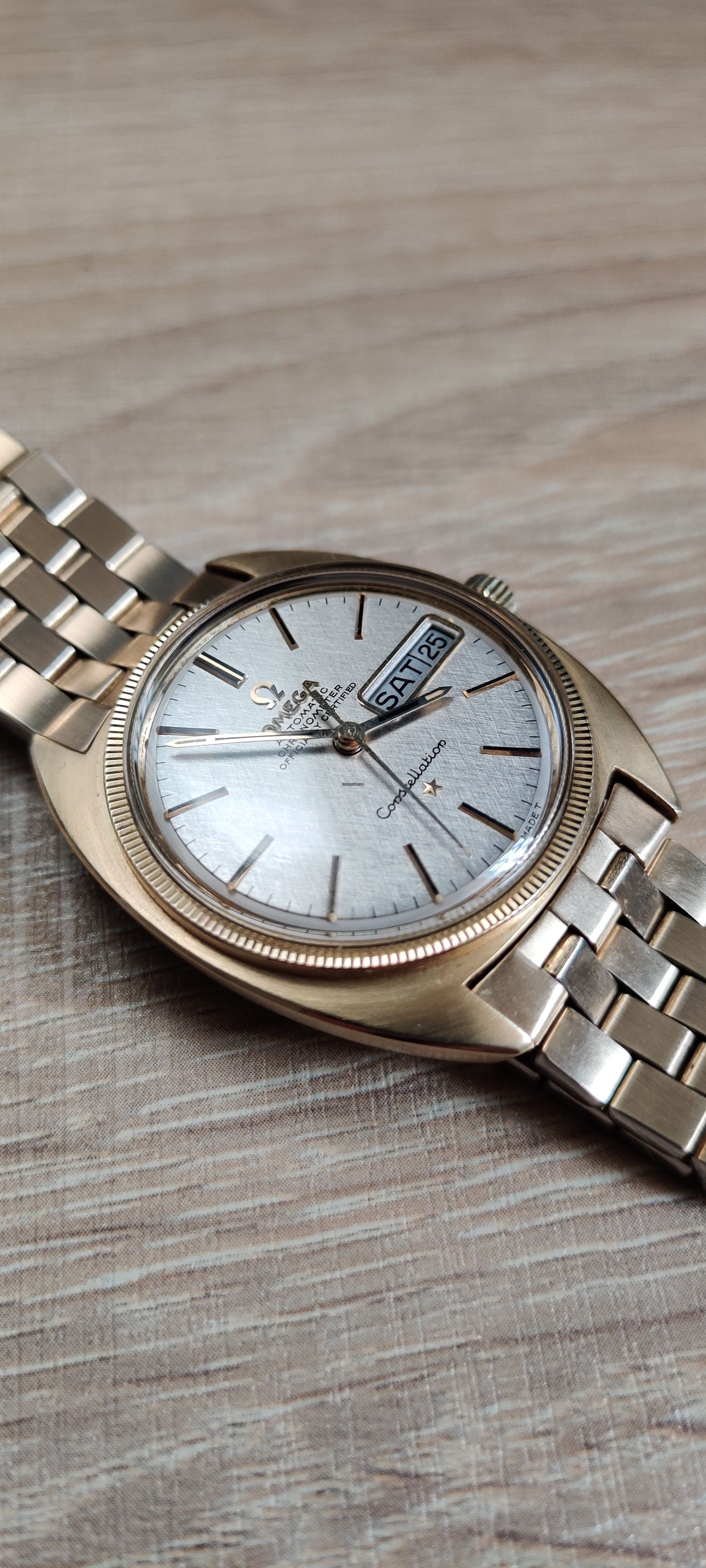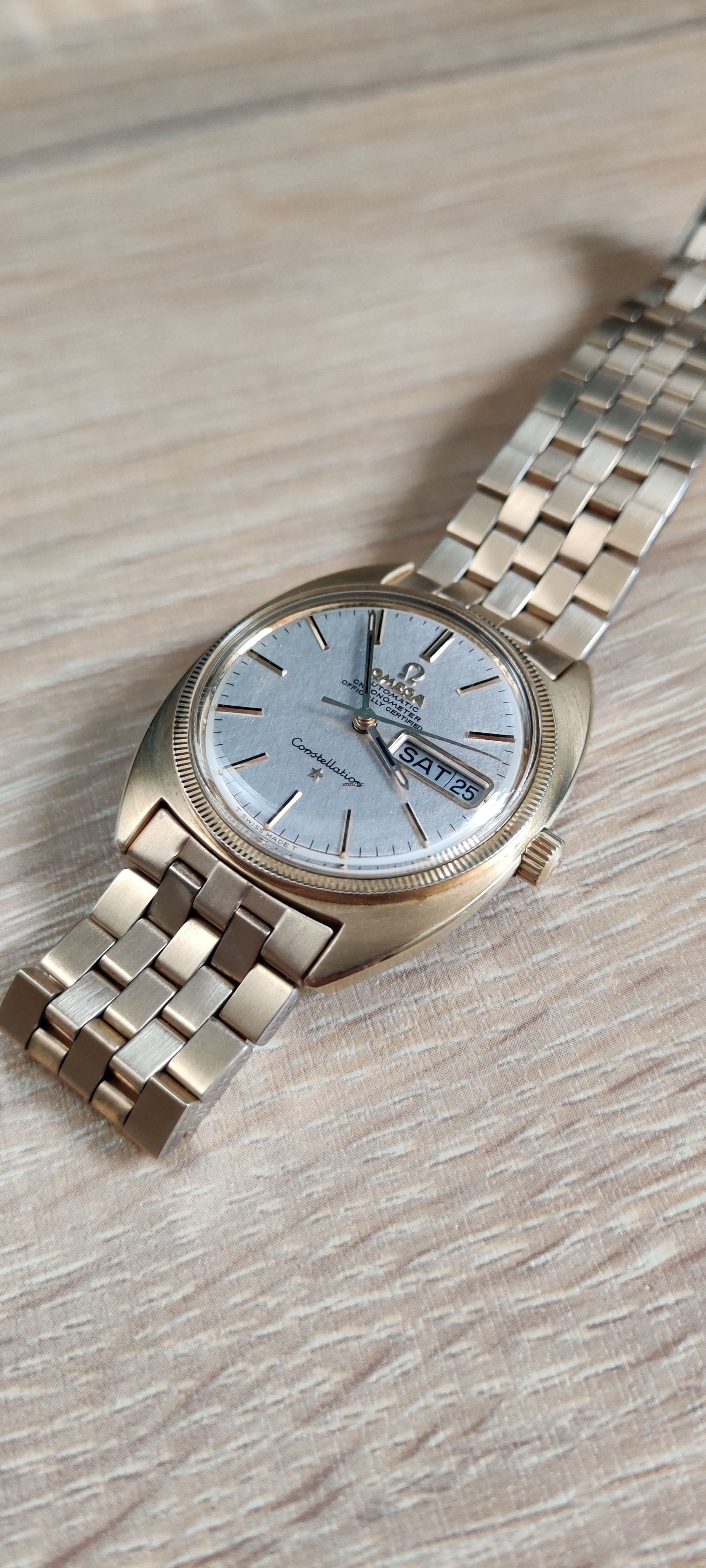 “Omega Constellation Day-Date beautiful conditions with rare linen dial, all genuine, fully working and keeping good time. The watch has been serviced recently. Serial number is dating the watch to 1968.