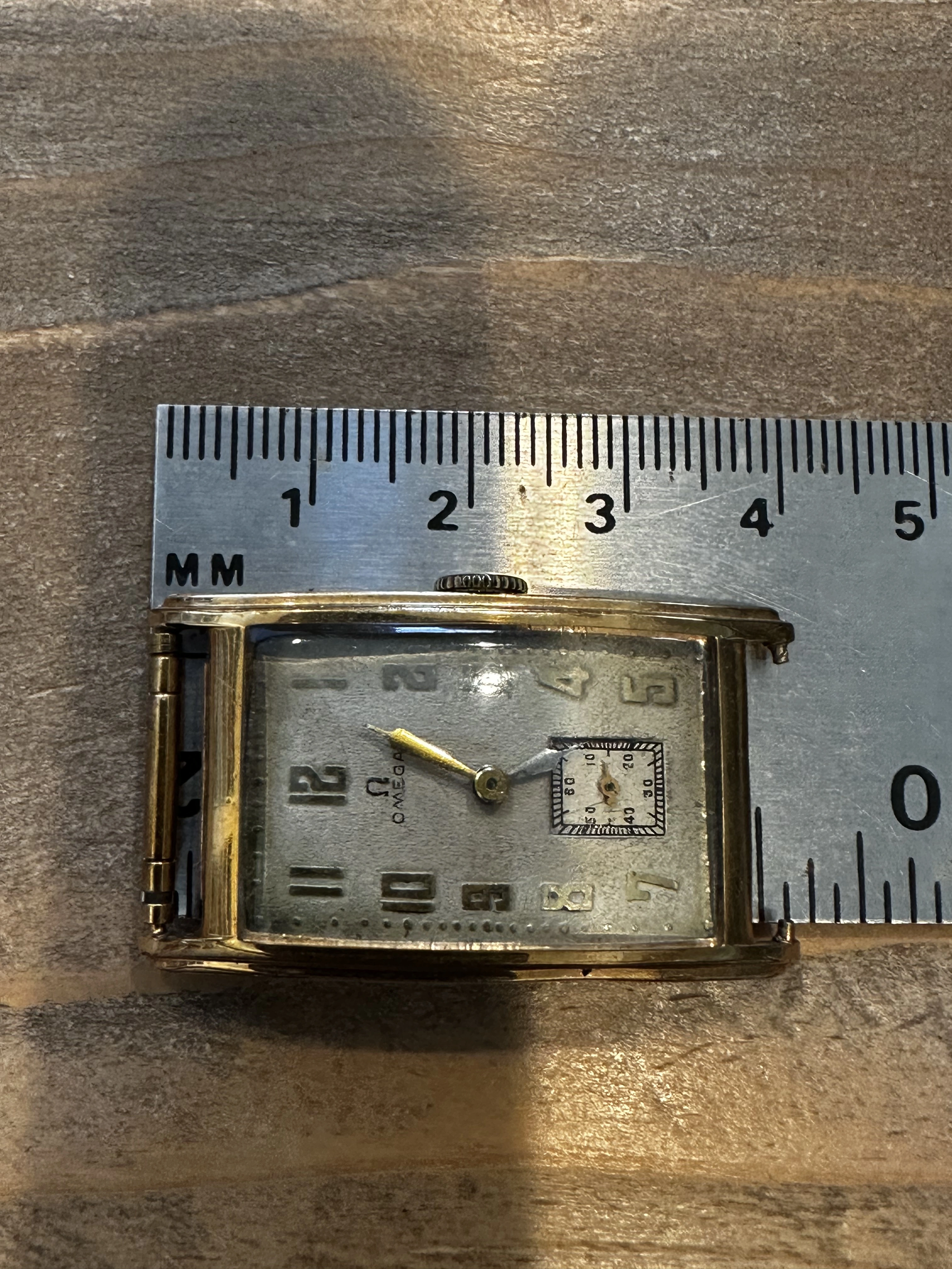 The reason I came here; My dad passed away and in a box in his desk was an old Omega with a rectangular shape. It is imprinted with "14k gold filled" on the casebook.