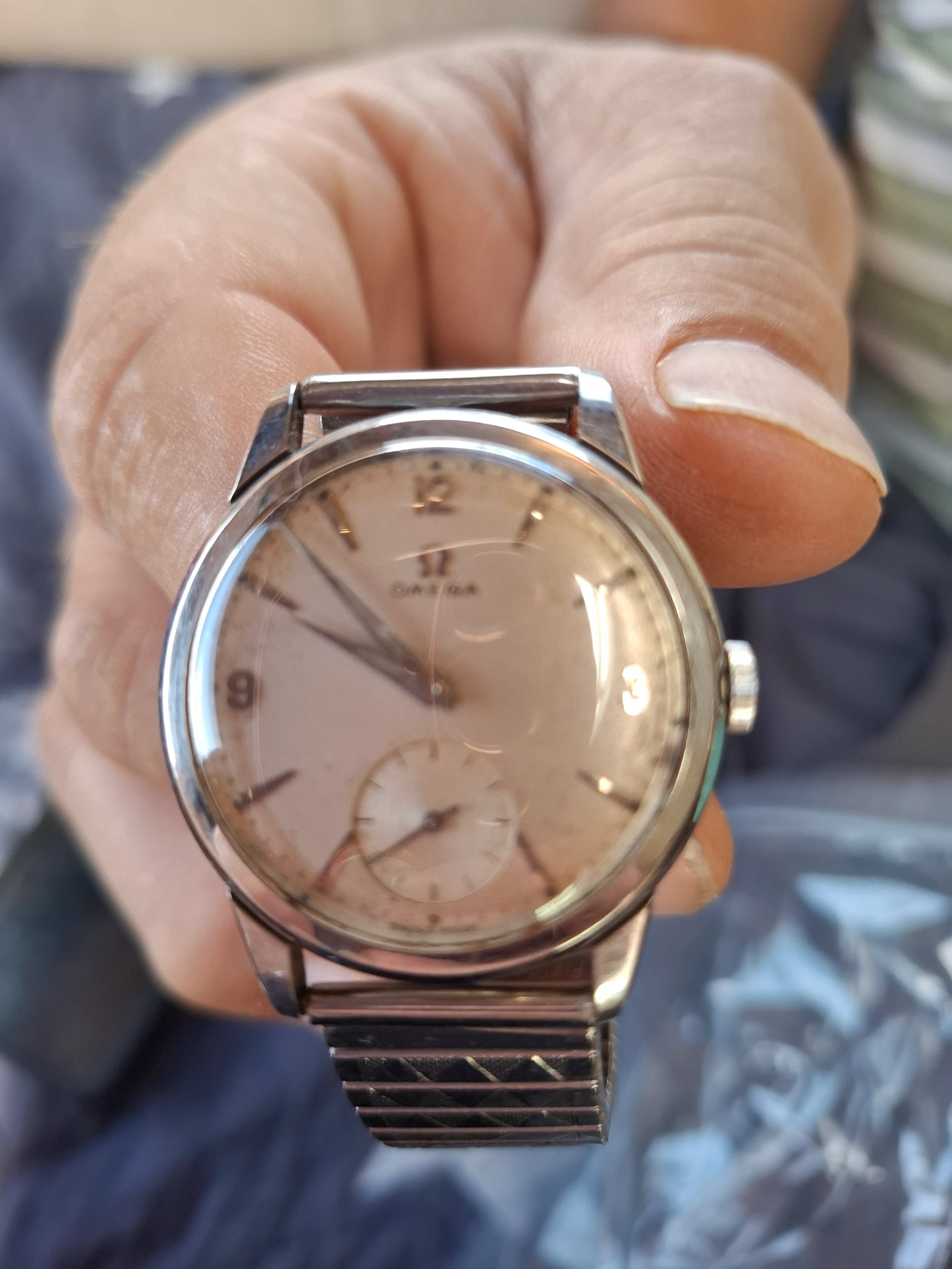 ·Hi, Found this in a charity shop. My husband loves it. We've not taken the back off yet, going to find a specialist to do that but in the meantime can anyone help dating this. It has an omega sign on the winder too. Not with its original strap unfortunately. Sorry about pic quality. Will try to get a better one.