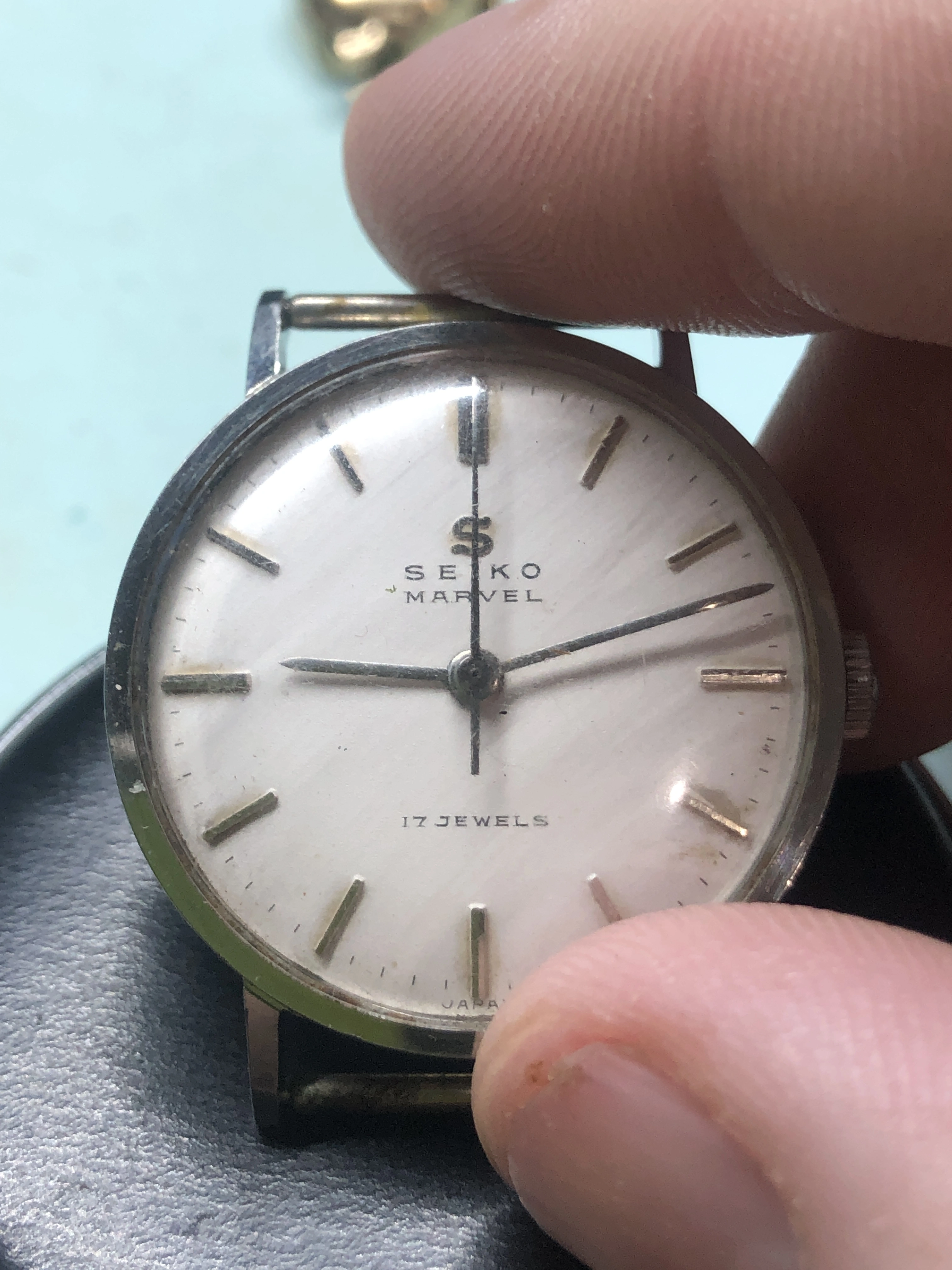 You may have to pull the dial and hands to see if there is the information you require behind the dial. With the dial off, photograph the winding and setting parts, and send pictures of the front and back of the movement to several material houses to see if they can help. Perrins or Swiss Watch Parts Disributors (both in Vancouver), might be good places to start. Then broaden your search to U S material houses such as McCaws in Toledo, Ohio.