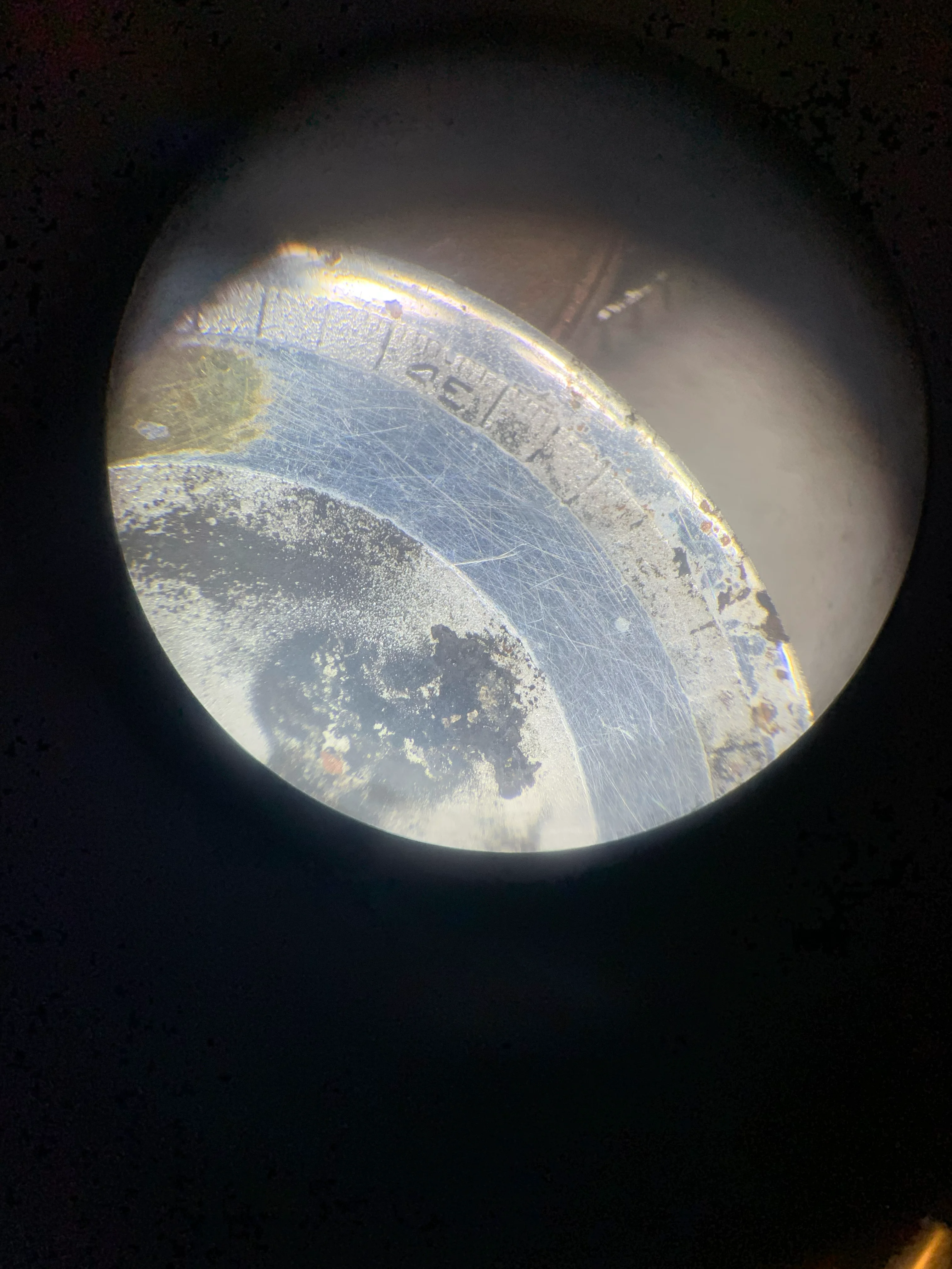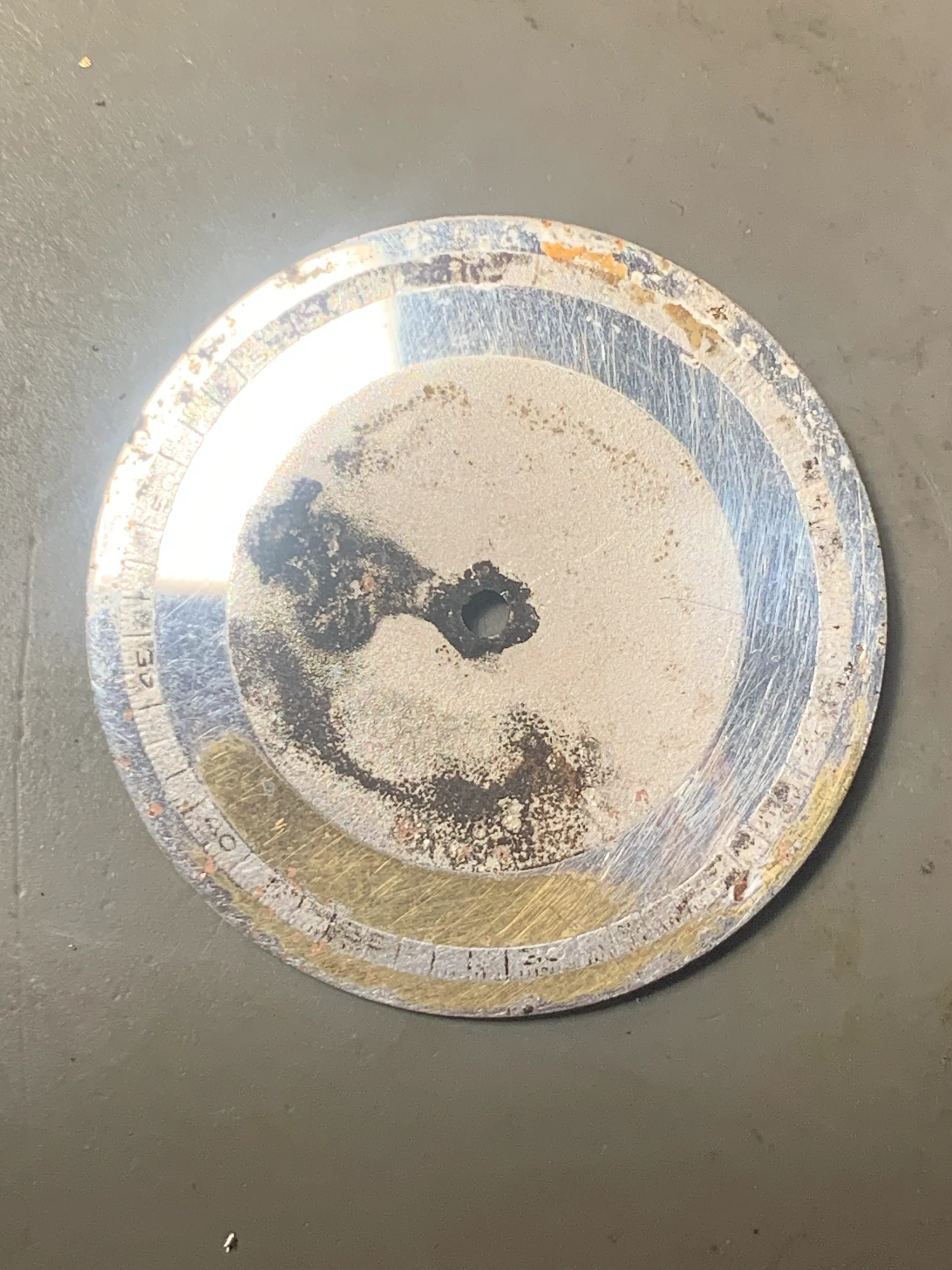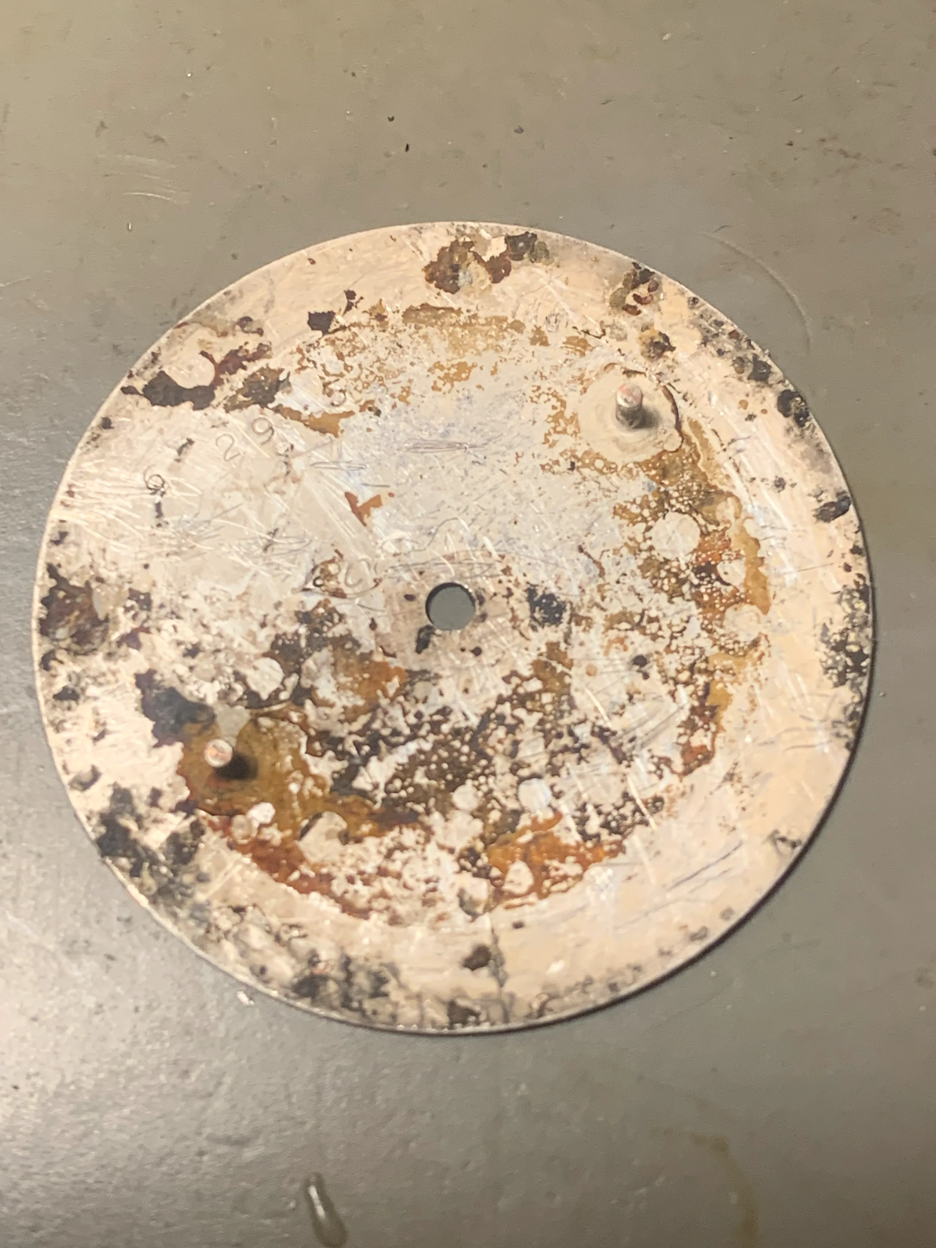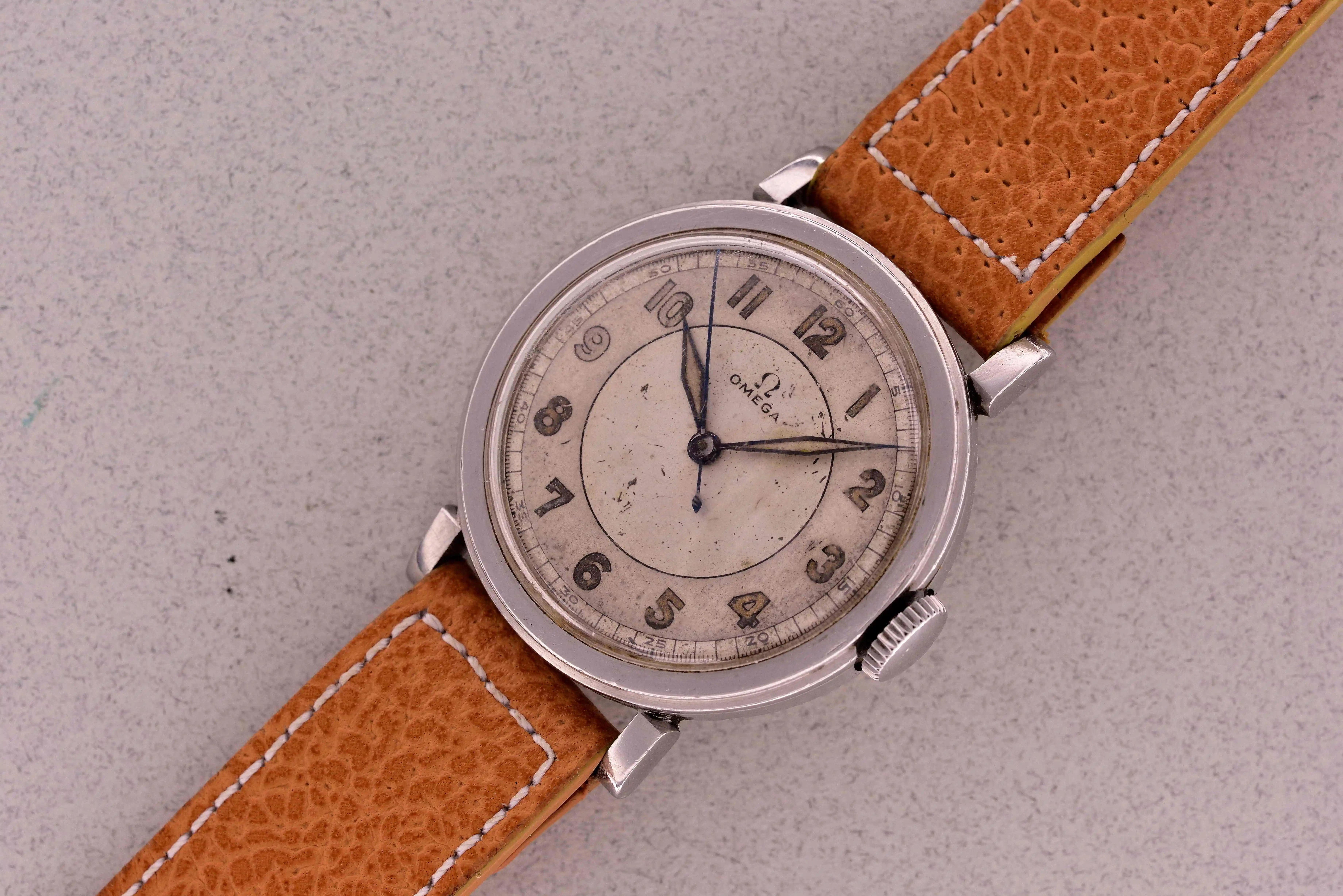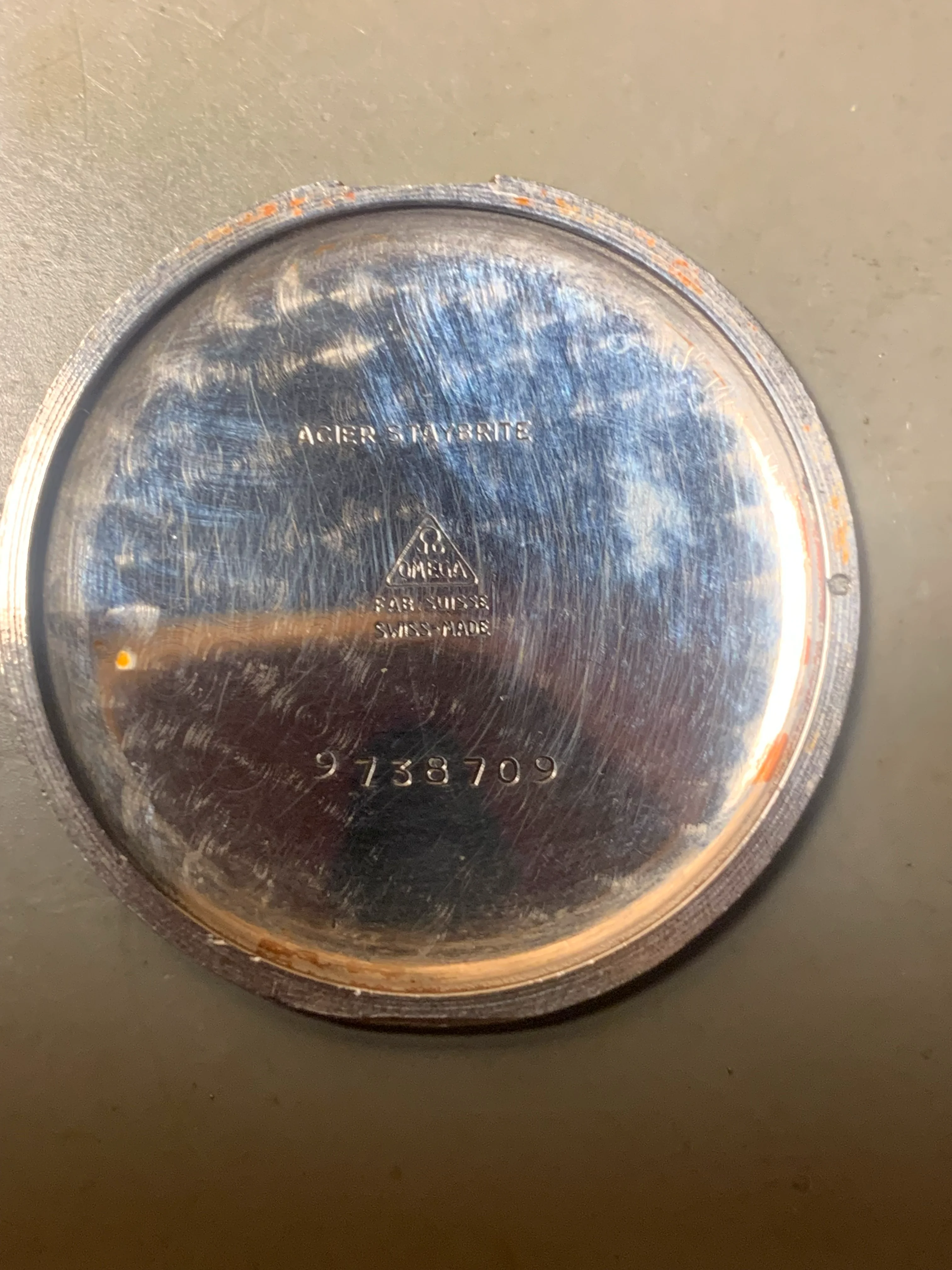 ·Hello, I am new to this forum, I wonder if anybody can help me see what the damaged dial on my Omega Medicus looked like when it was new.? From looking at this forum I think it is Model No. CK2015, is 35mm in diameter with a 23.4 sc movement. It seems to have a special dial, unlike others that I have seen online. It is unfortunately damaged by hard black corrosion products. The dial is made of silver with a Matt centre circle. I has a beautiful silver minutes ring also subdivided into fifths. The ring seems to stand proud of the surface could be stamped on or etched, but almost looks applied (see the the little notch between the numbers of the 45.) The dial has two areas of polished silver outside the minute ring and inside where I think the figures would have been printed. Intriguingly both these areas have evidence of gold plating. On the back of the dial are a curly L & C (Maybe Lemrich?) and the number 6 29 5.