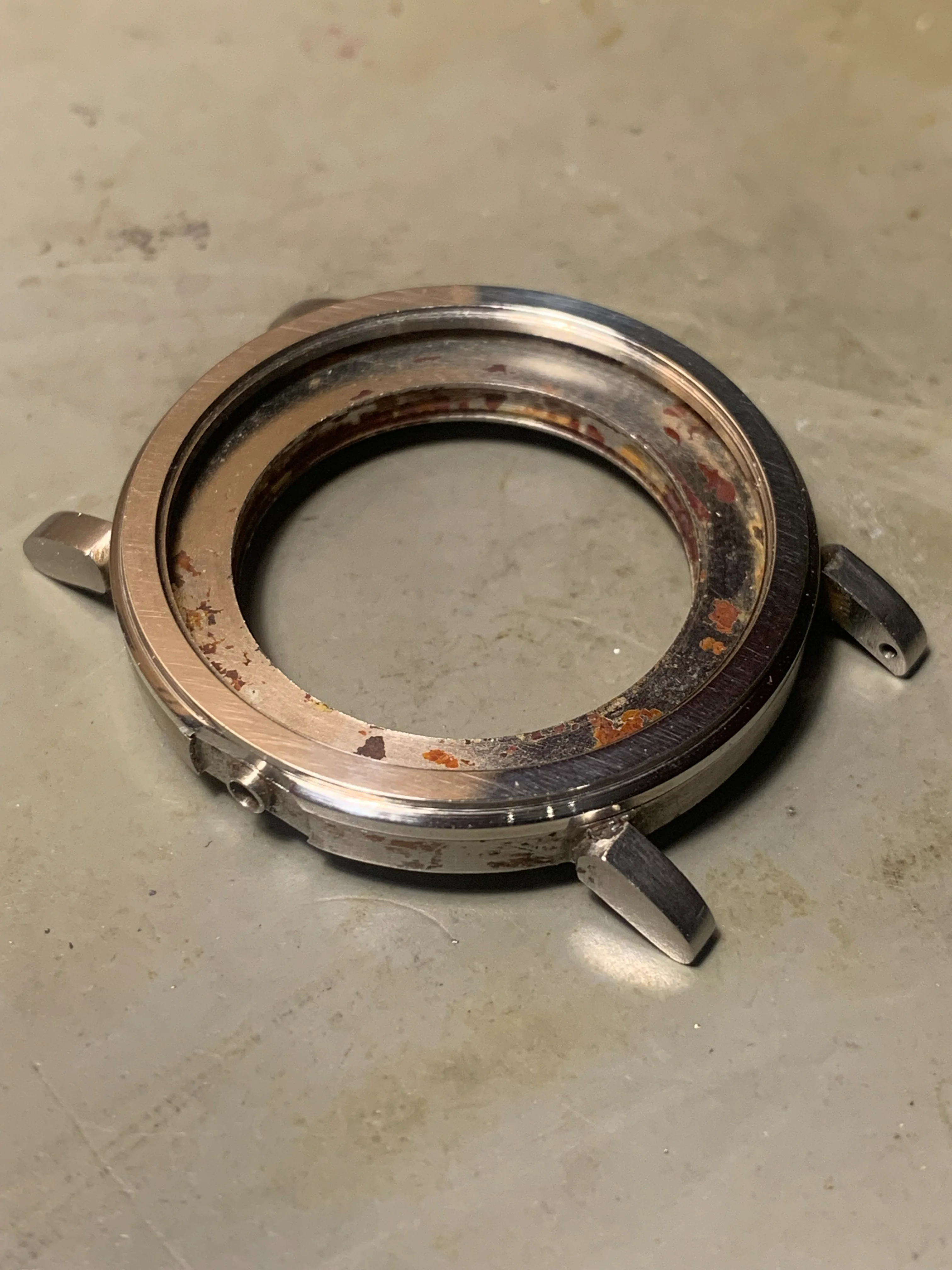 The case and back are stainless steel, the original stepped stainless bezel was broken into three pieces and seemed to have failed in a brittle way like cast iron. I have turned a new bezel from stainless. Interestingly the watch came with a mineral glass, I wondered if this was original? The movement number is 8852947 and caseback 9738709.