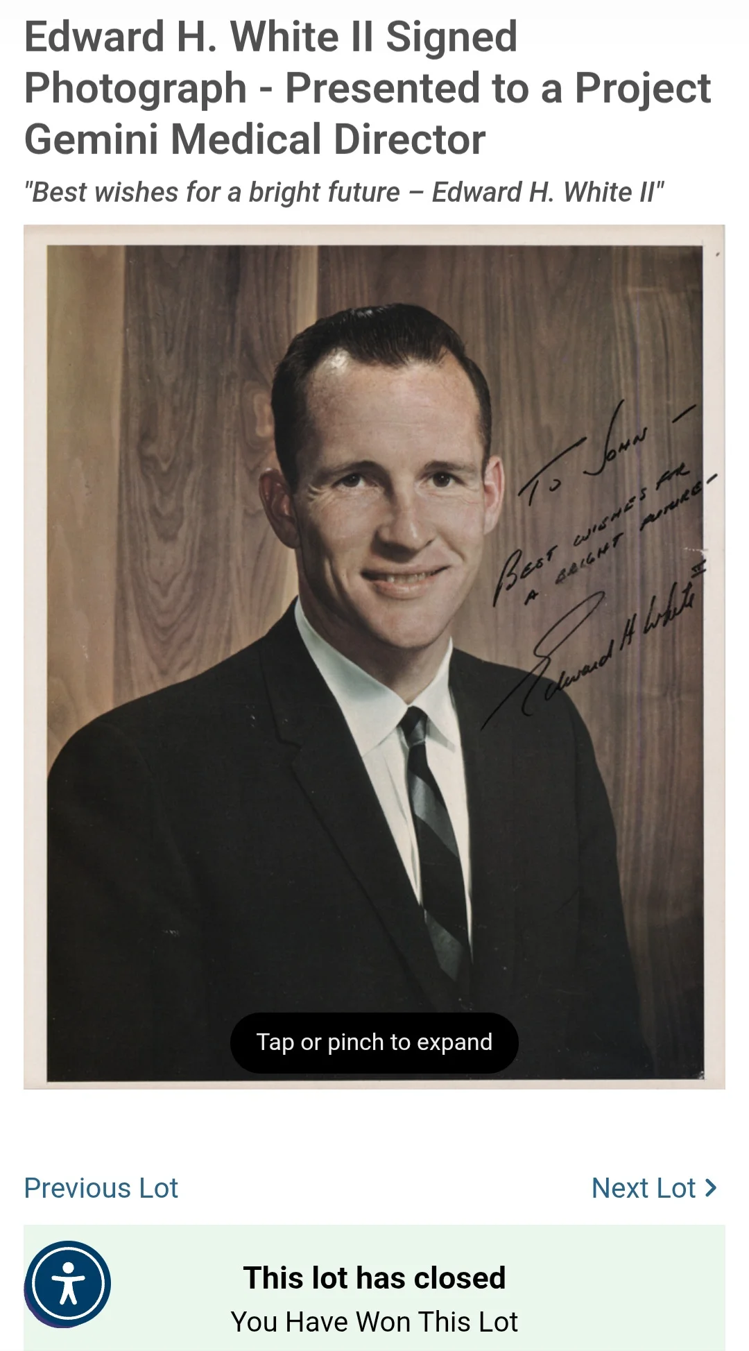 Accompanied by a letter of authenticity from the son of the original recipient, Dr. Joseph John Combs, Jr., who served as a medical director on NASA’s Project Gemini being conducted at McDonnell Aircraft in St. Louis, Missouri. “Dr. Combs was focused primarily on the biomedical recorders, and more specifically on ECG (cardiac) recordations to record heart rate during prolonged exposure to zero-G. As such, he interacted closely and daily with the Gemini astronauts, attaching and removing biomedical recording leads and interviewing them about perceived effects of induced space conditions…Dr. Combs became personal friends with many of the astronauts, including John Glenn, Ed White, Wally Schirra, Gus Grissom, and Pete Conrad…Of particular value to my father was the Omega watch gifted to him by Wally Schirra upon his return from the Gemini 6A mission, which marked the first in-space rendezvous…I hereby certify and attest that the space memorabilia in the collection being auctioned are the real and actual articles gifted to my father, Dr. Combs, by the Gemini astronauts during the time my father served as a medical director at McDonnell Aircraft in the 1960s.”
