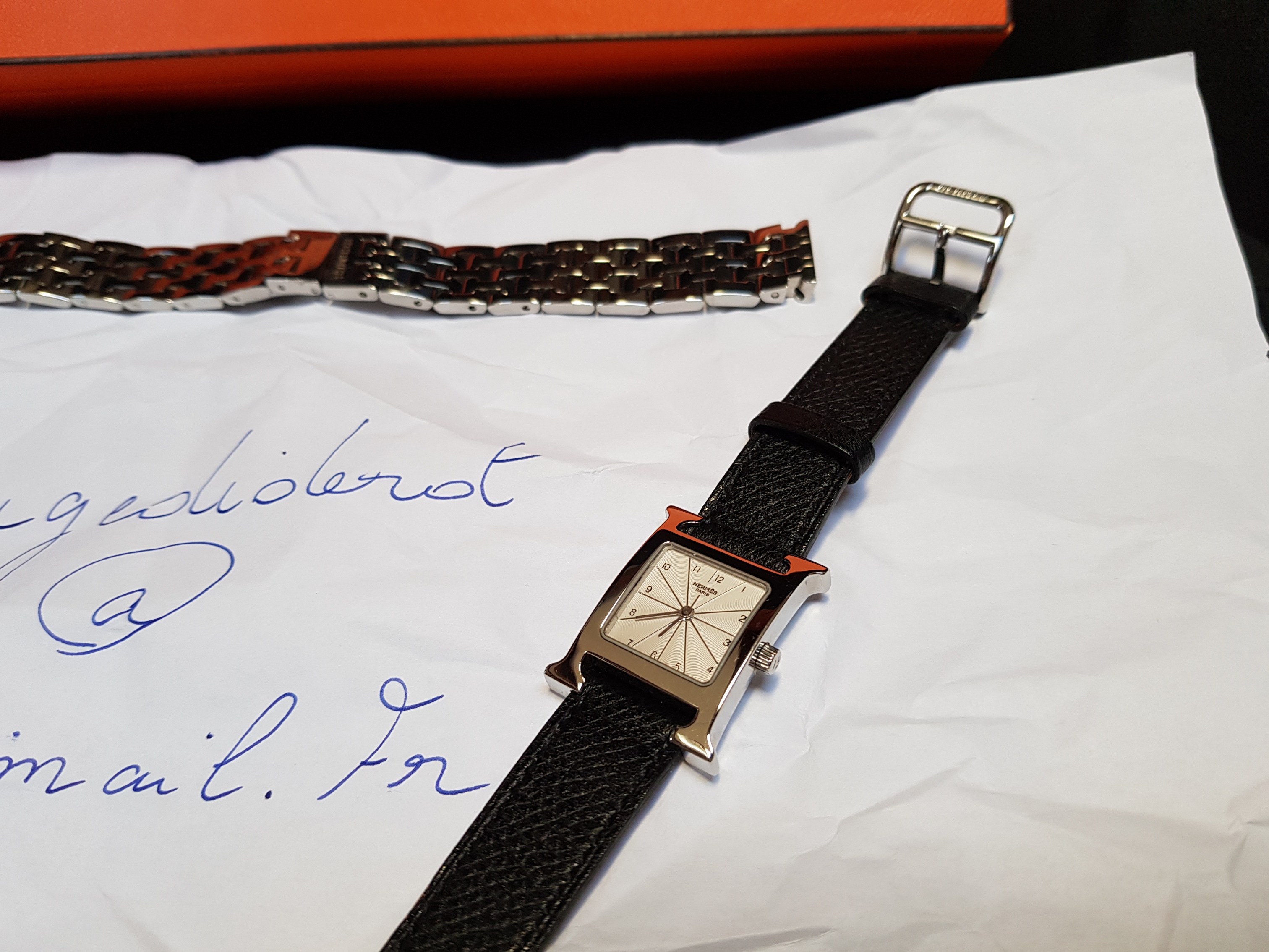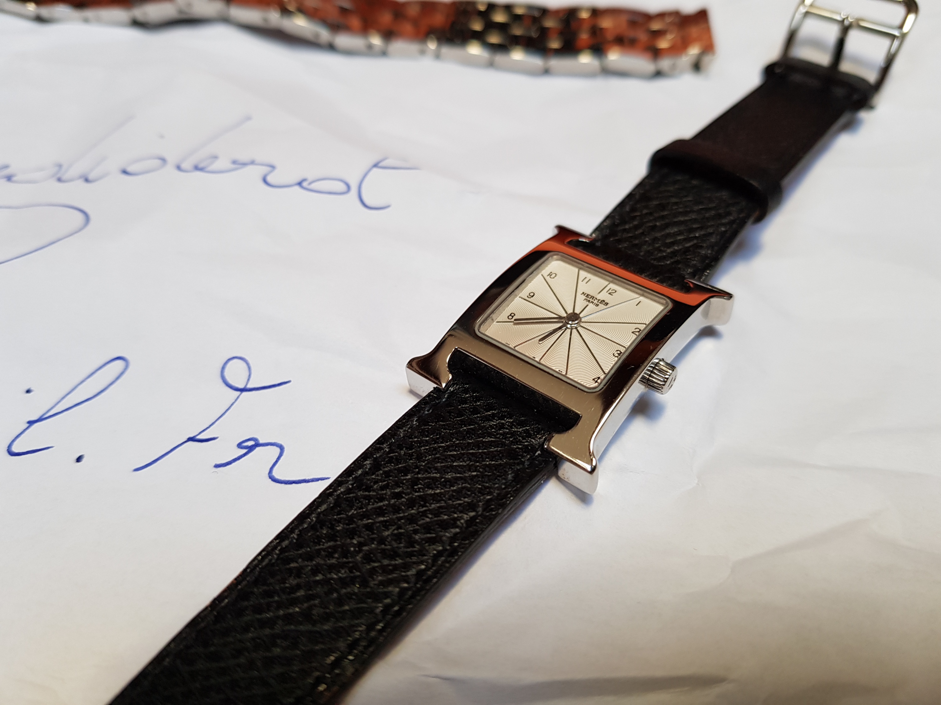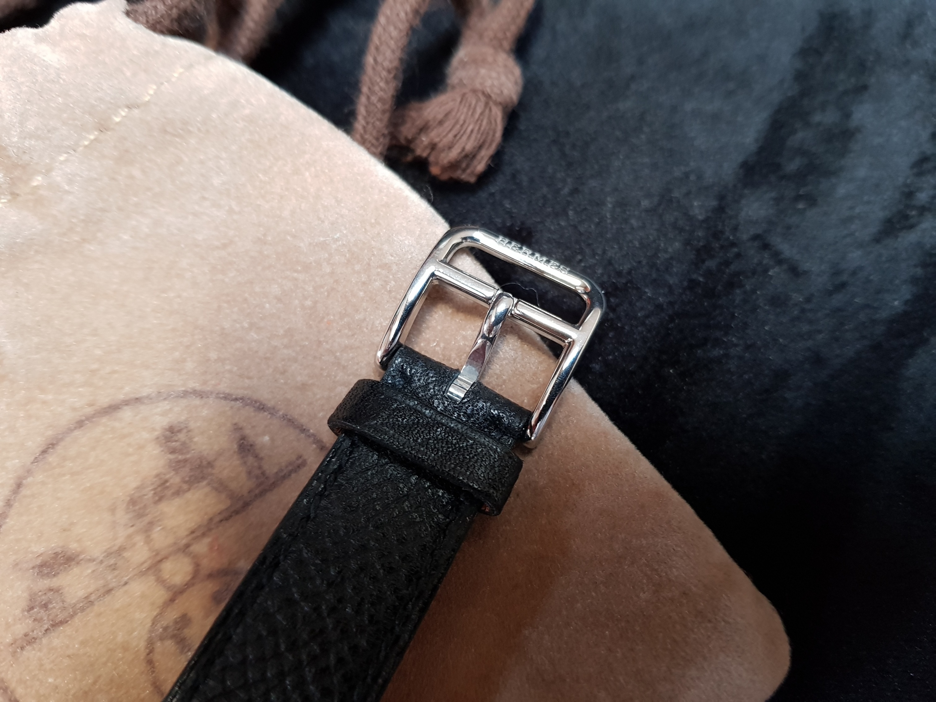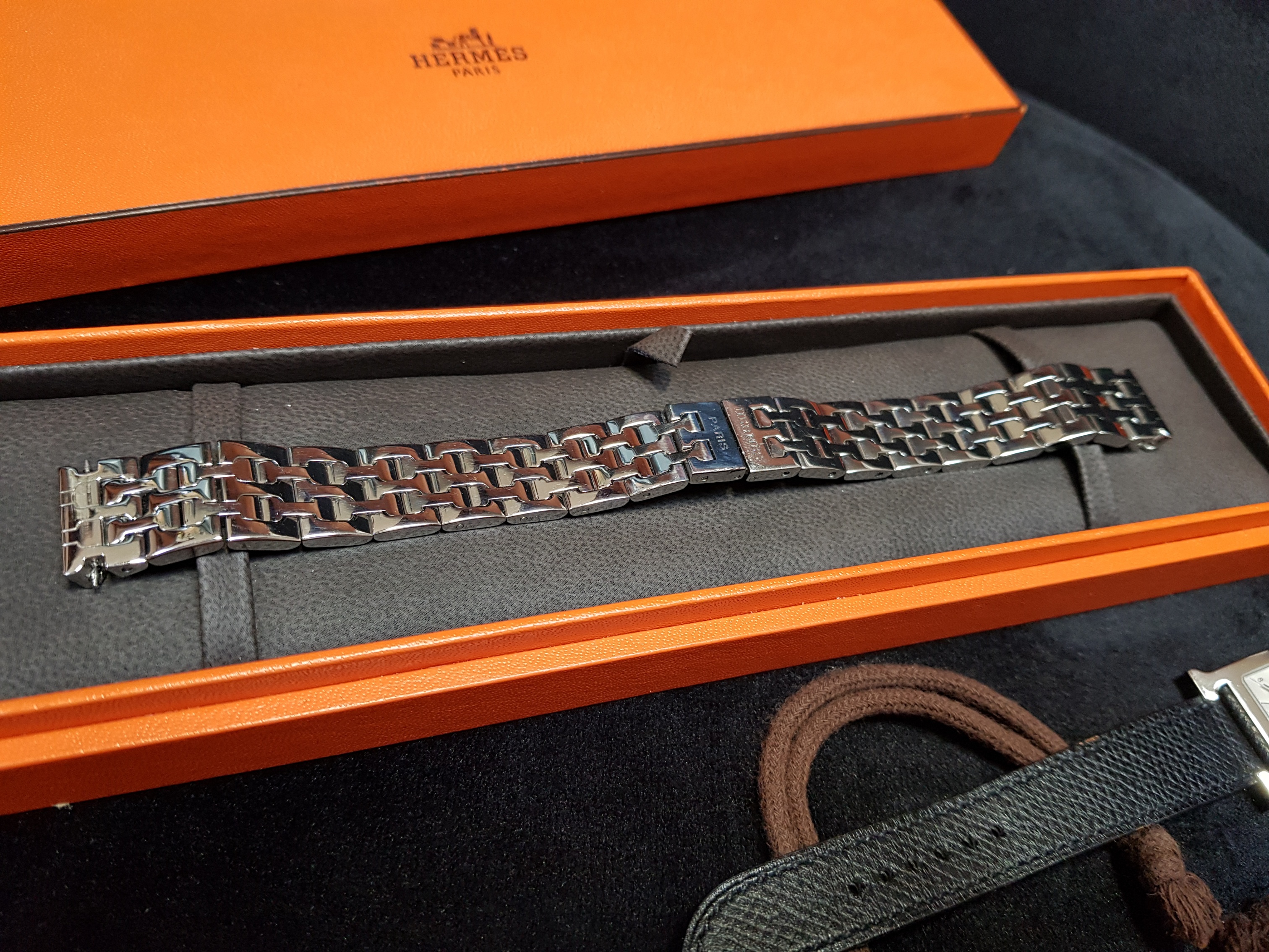 On Hermes barenia calf + Hermes stainless steel bracelet.
