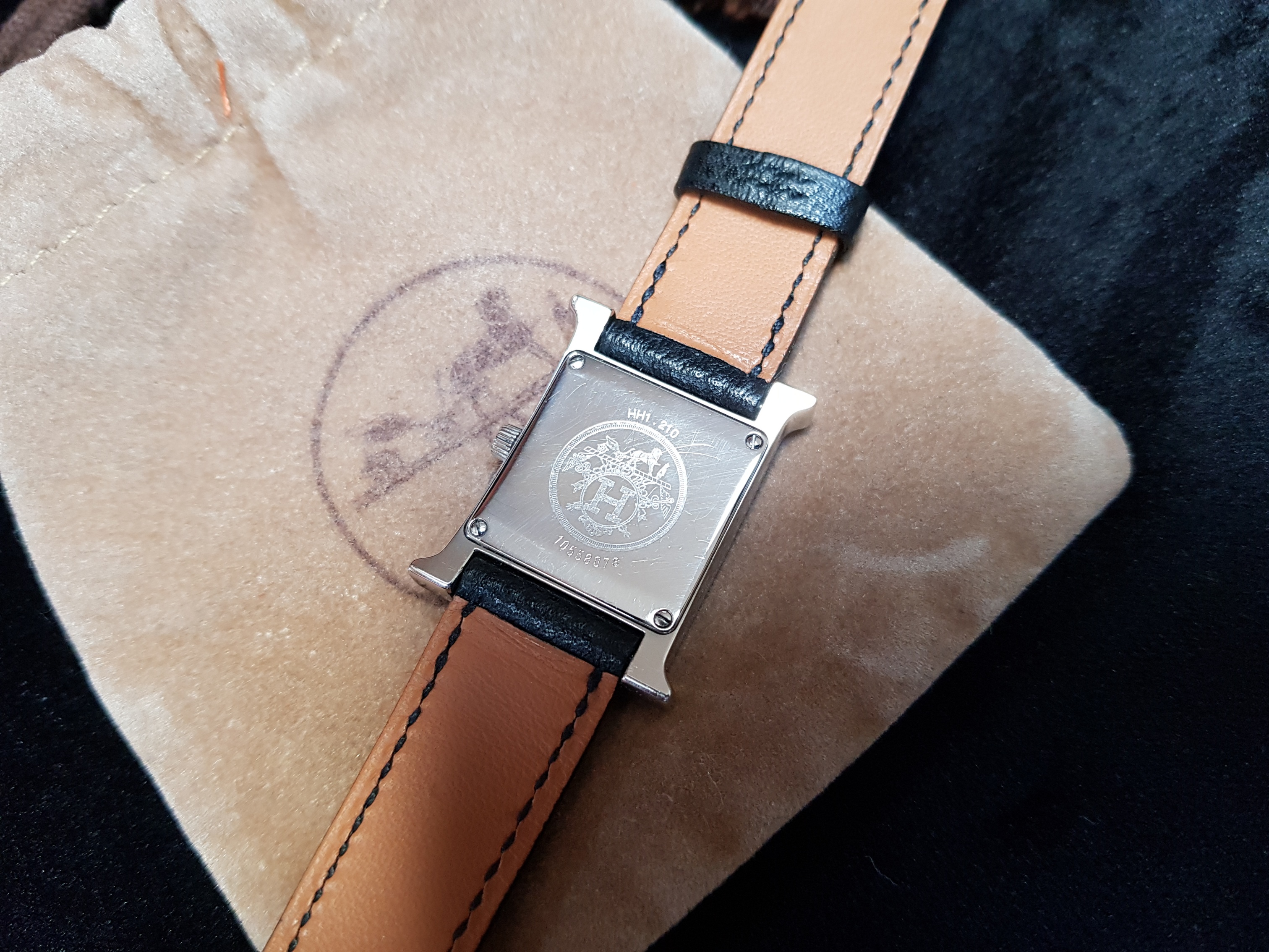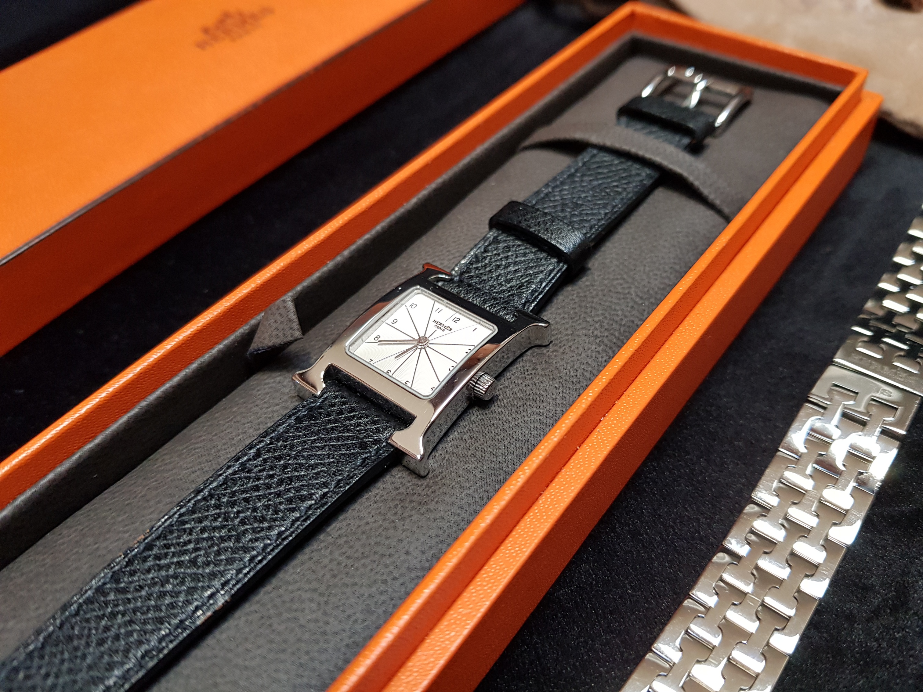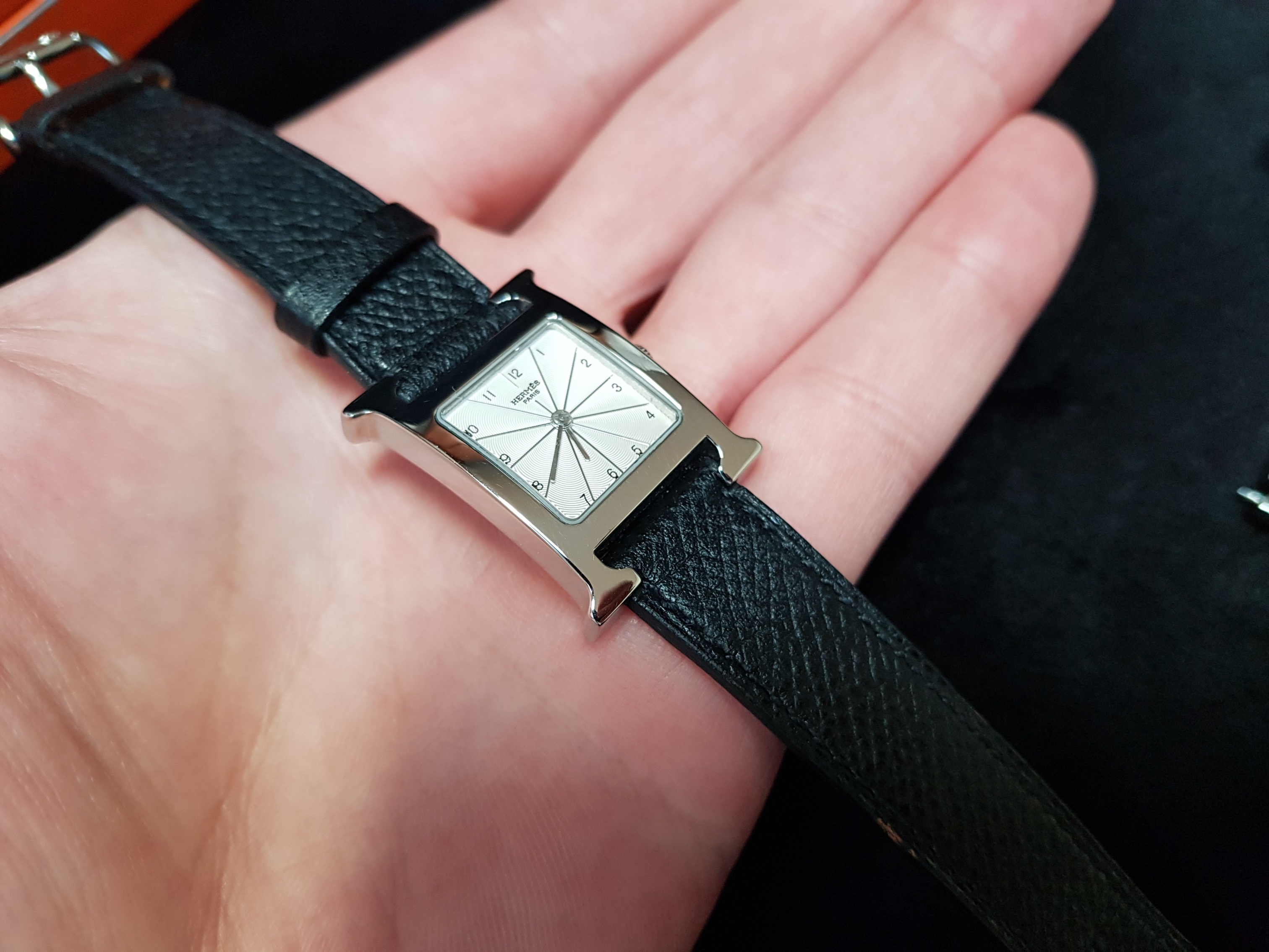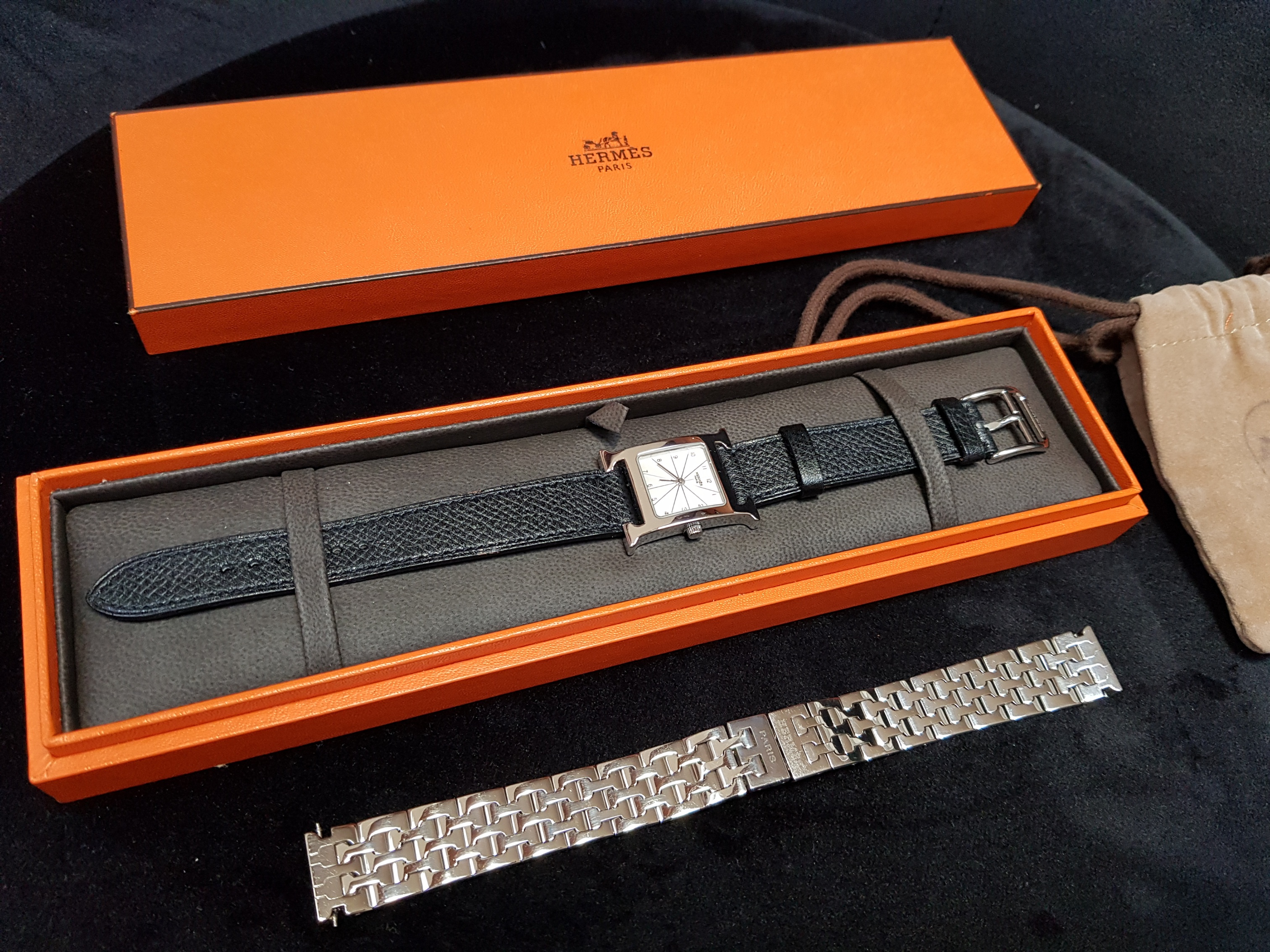 On Hermes barenia calf + Hermes stainless steel bracelet.