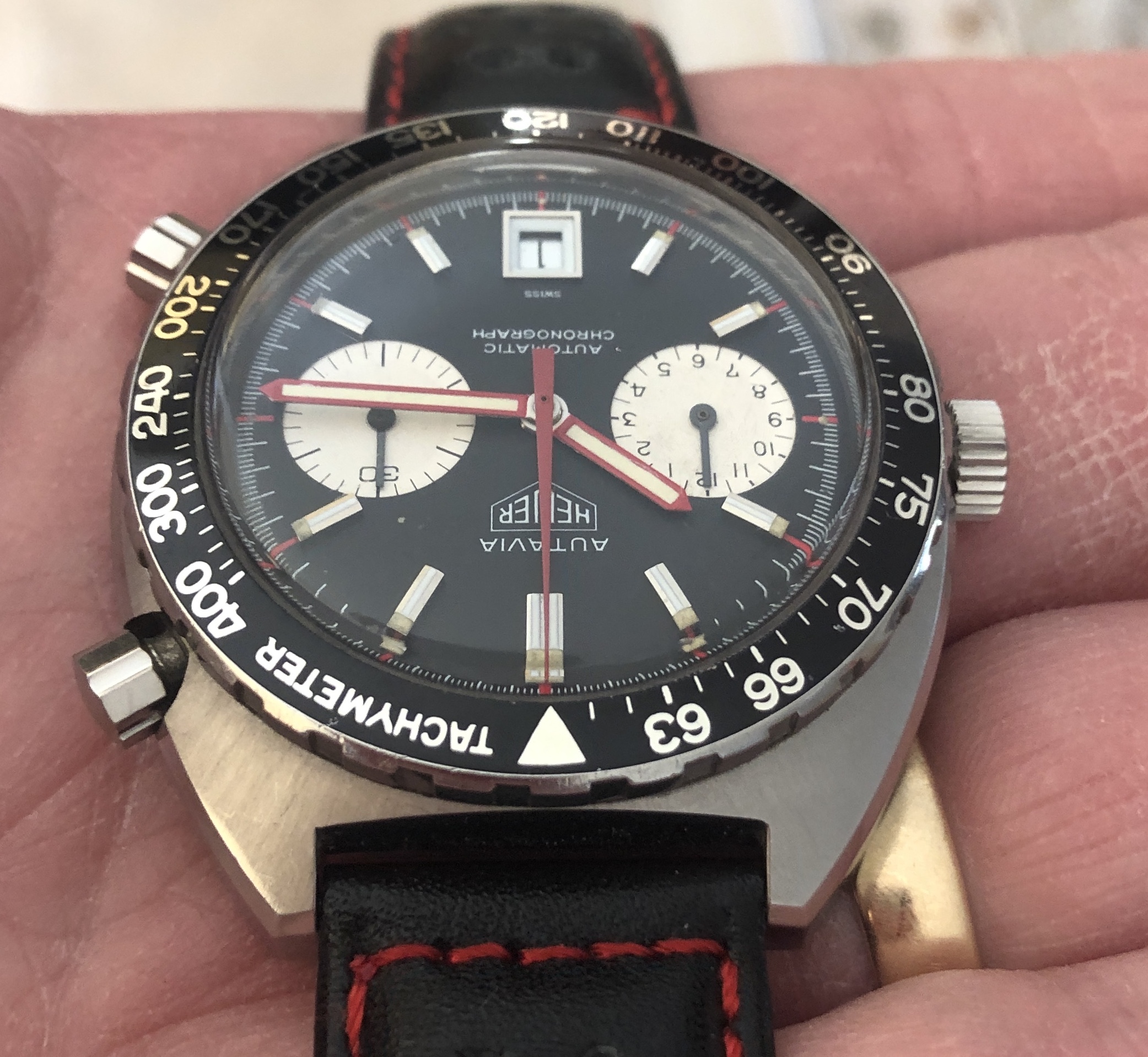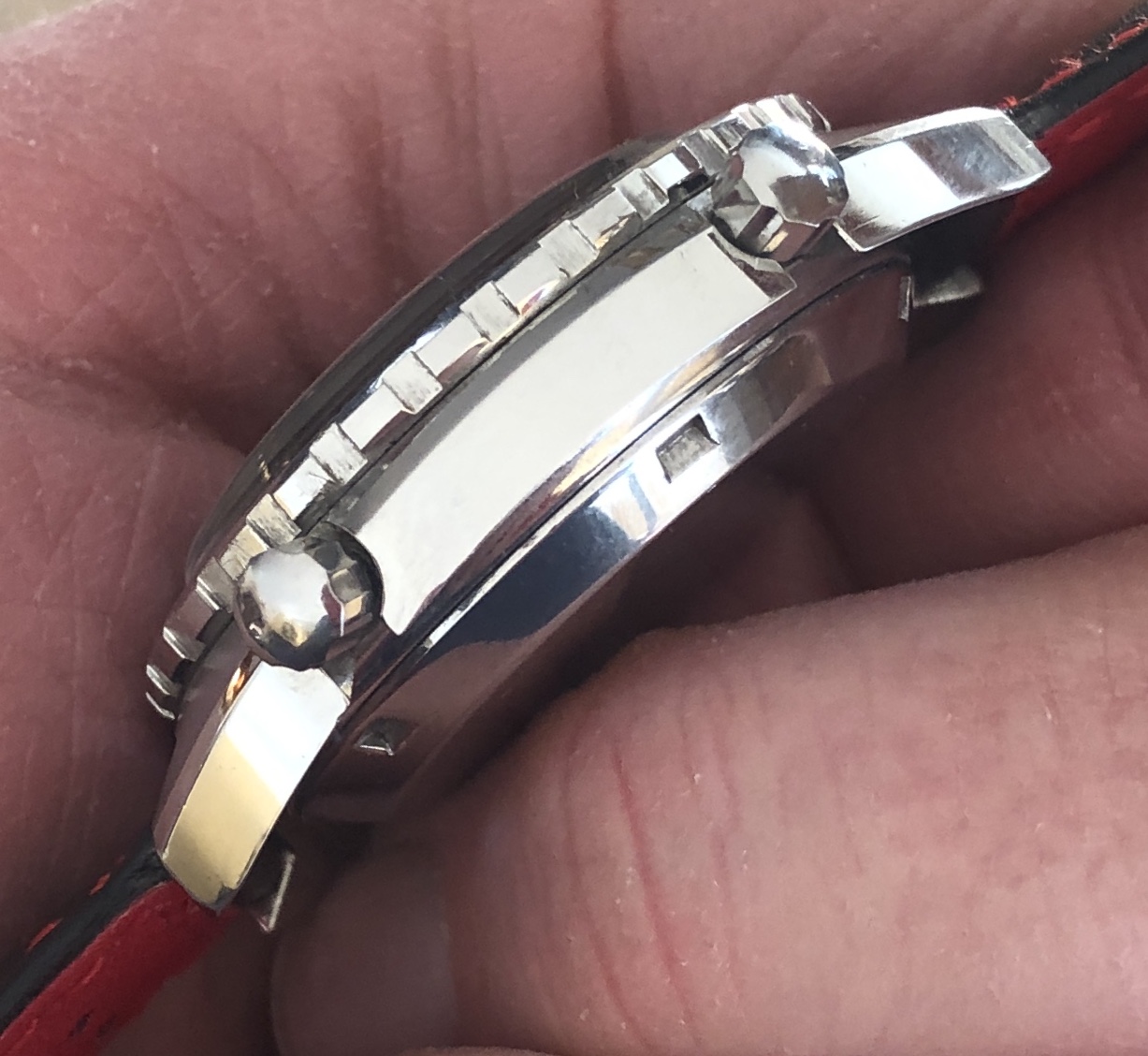 The case is in excellent shape and has all original factory finishes. A few minor swirls are apparent, but no dings or dents are seen. Fluted Pushers and crown are correct and presumed to be original.