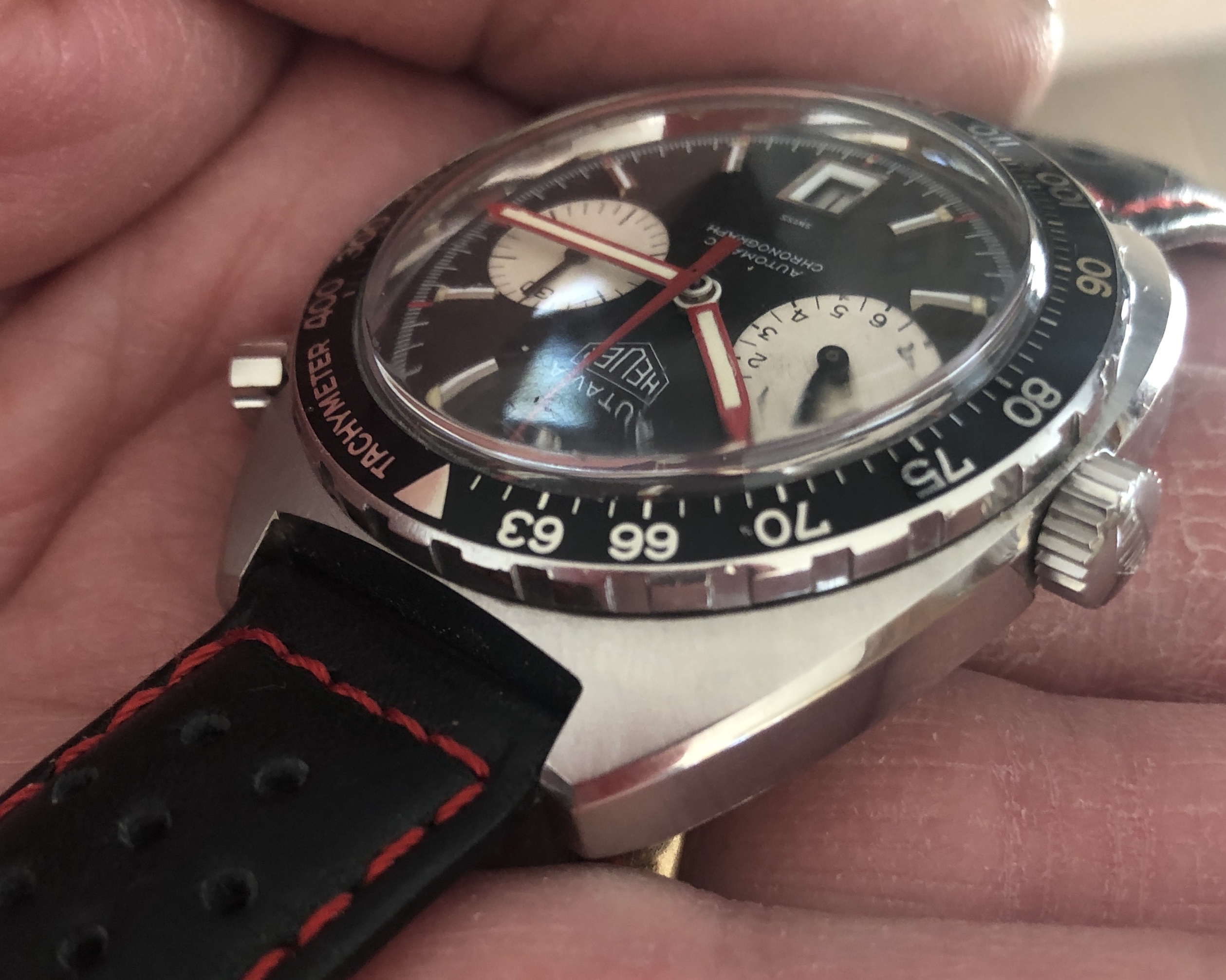 The bezel has a scuffs at 100 and 110 and another following the 70. However it shows very nicely overall. The plexiglass crystal is in nice condition, with a few minor blemishes which can be seen under a loupe.