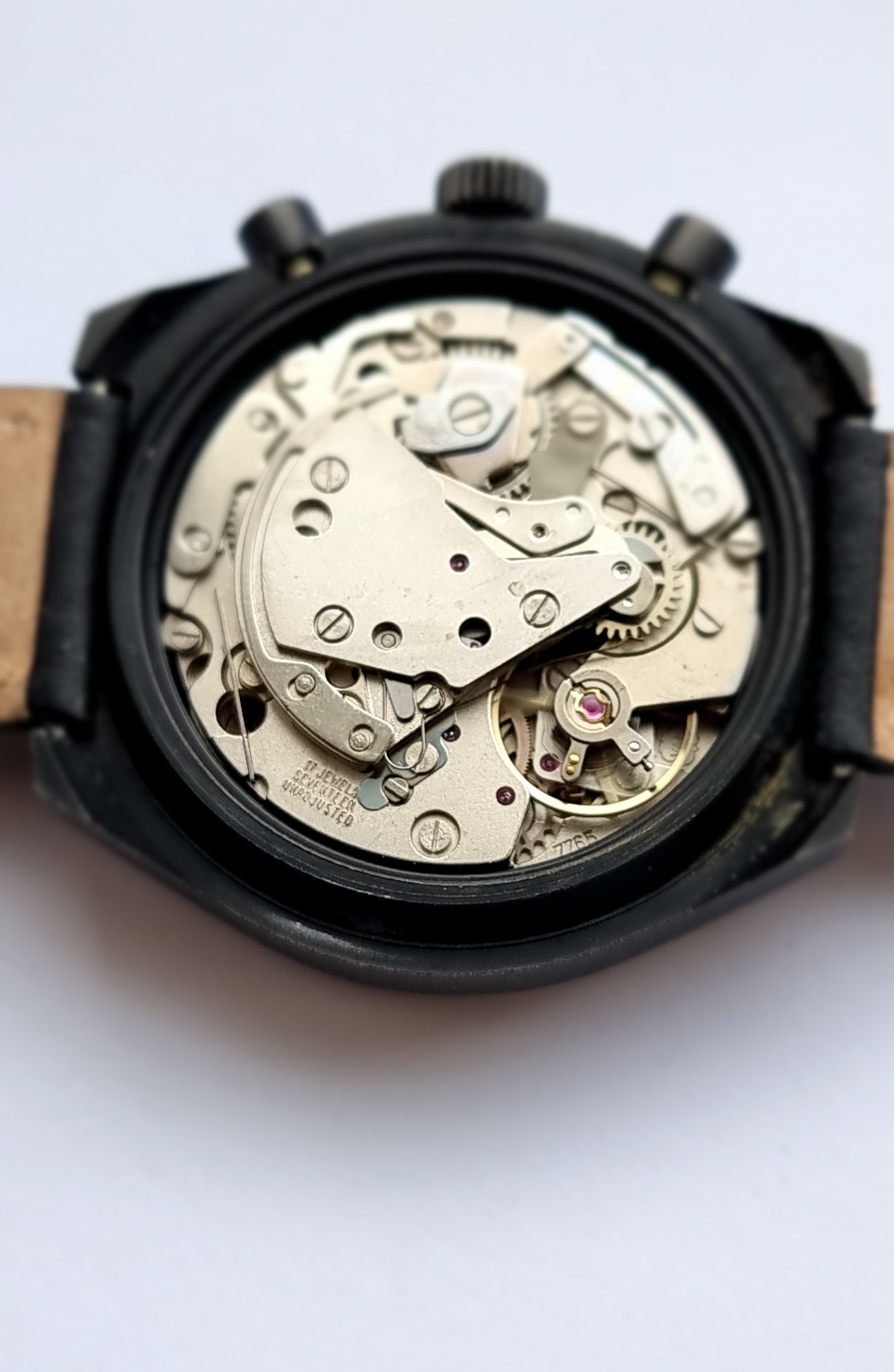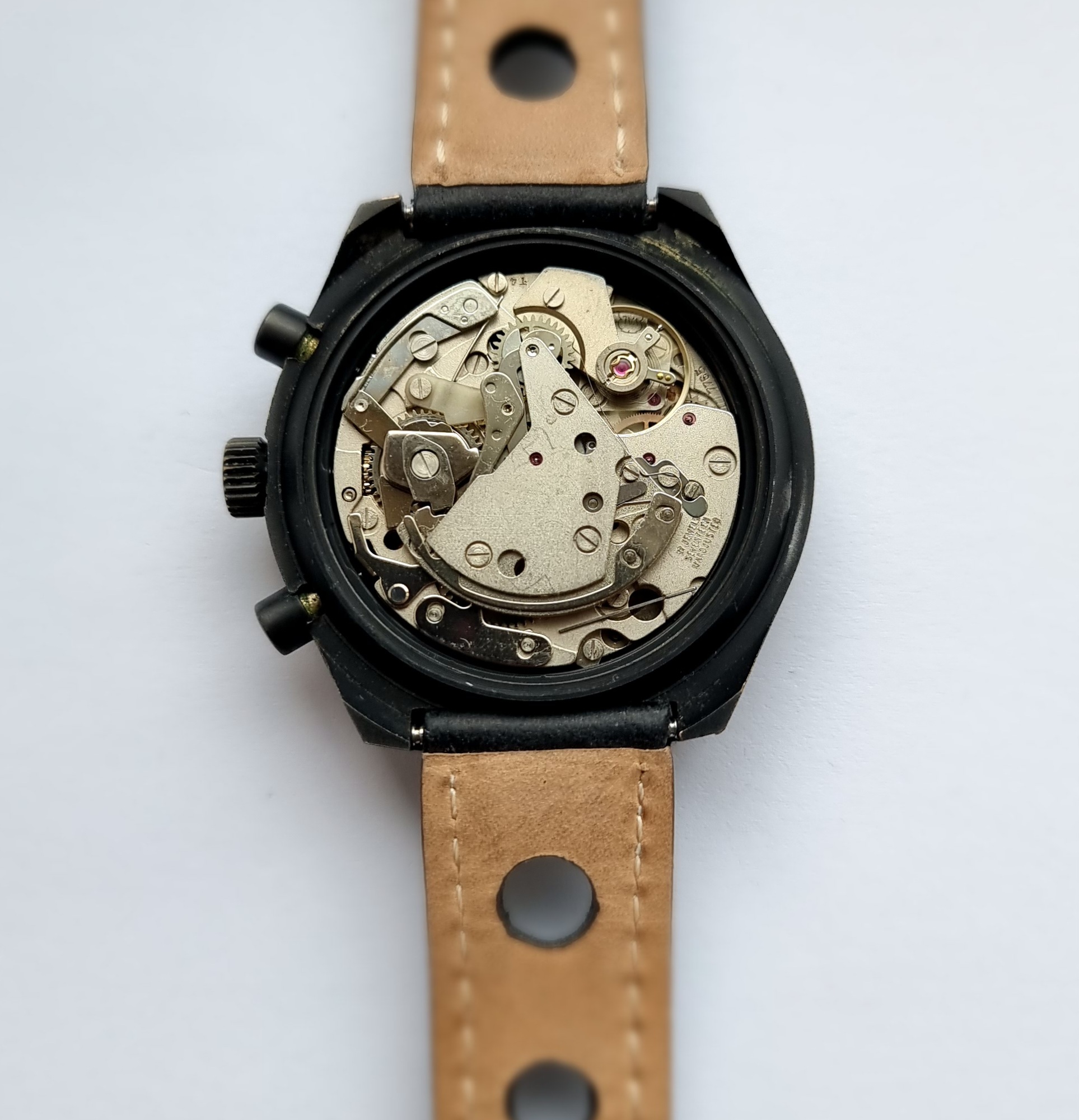 The case is in good condition with only a few small marks commensurate with age. The watch is running very well and comes with 6 months mechanical warranty from sale. It has not been serviced by me, but has been checked by my watchmaker. All functions work well and time keeping is good. All functions work and the chrono function starts/stops/resets correctly. There are a few light surface scratches to the mineral glass, but these are not easily seen. 41mm case ex crown with 19mm lugs.